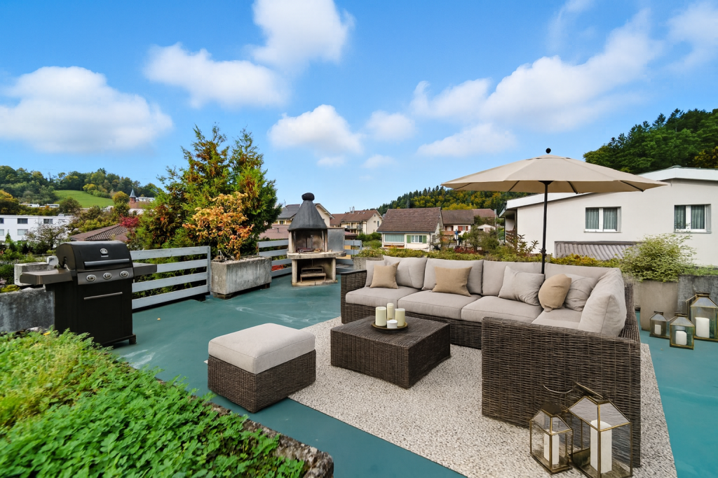 Der helle Wohn- und Essbereich mit grossen Fensterfronten schafft ein angenehmes Raumgefühl und direkten Zugang zur weitläufigen Terrasse. Mit einer Fläche von beeindruckenden 108 m² und einem gemütlichen Aussen-Cheminée ist sie der perfekte Ort, um sonnige Tage und laue Abende zu geniessen.