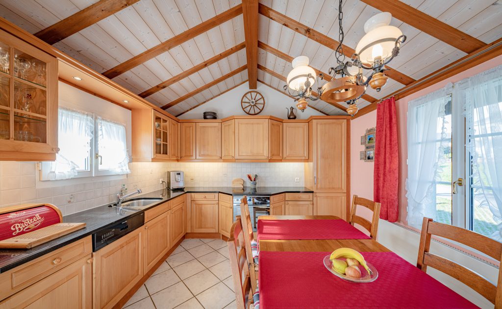 Die 153 m² Gesamtnutzfläche verteilen sich auf vier Geschosse und bieten eine durchdachte Raumstruktur. Der Wohn- und Essbereich wirkt warm und einladend, mit direktem Zugang zum Balkon. Die aussergewöhnlich grosse Schreinerküche mit gestemmten Fronten und beeindruckender Raumhöhe ist ein klarer Höhepunkt des Hauses – hier kocht man gerne und mit viel Platz.
