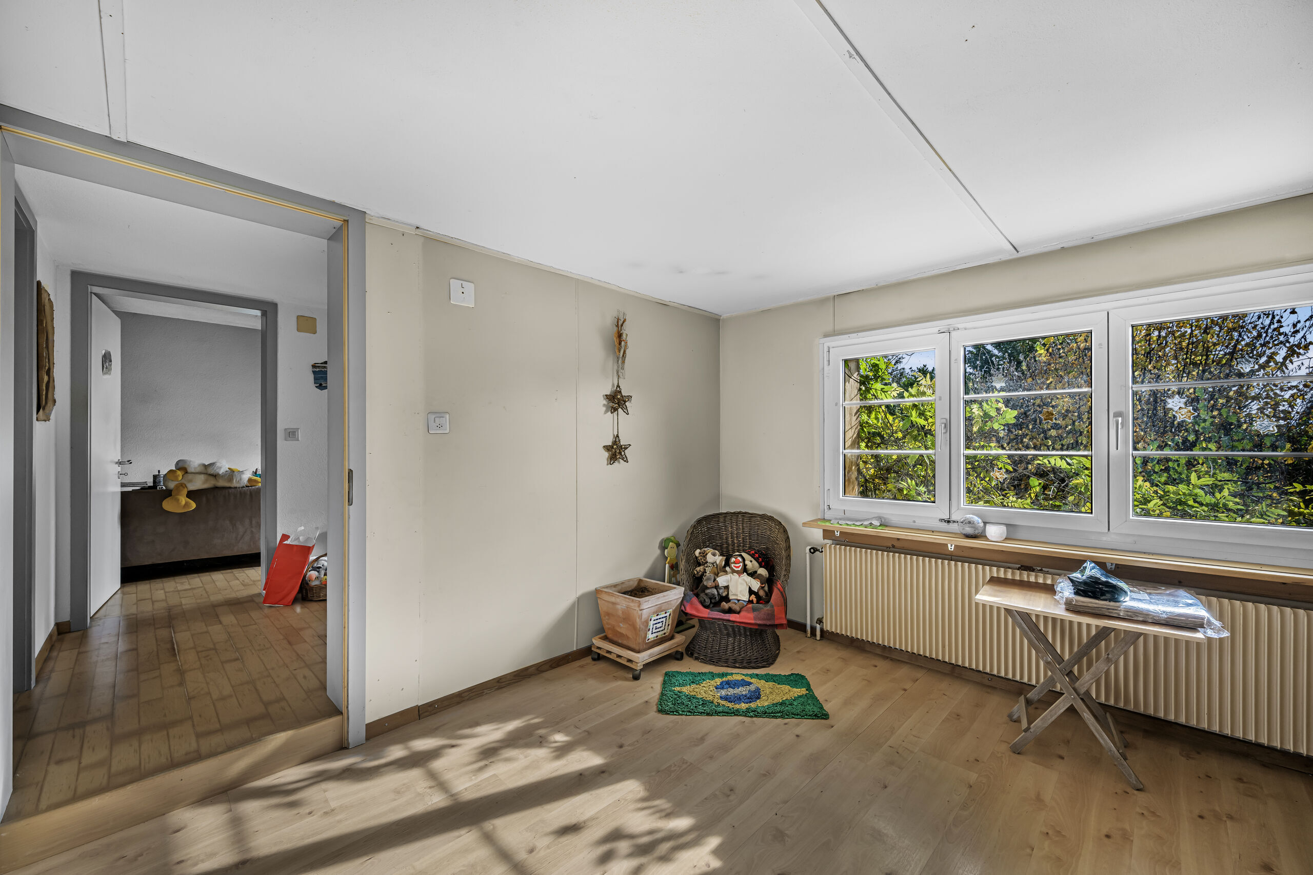 Im Obergeschoss öffnet sich der Raum bis unters Dach, wodurch eine angenehme Höhe und Grosszügigkeit entsteht. Die Galerie bildet das architektonische Highlight und verleiht dem Bereich eine offene, luftige Wirkung. Die bestehenden Zimmer sind ungewöhnlich gross. Mit überschaubarem Aufwand können zusätzliche Räume geschaffen werden – perfekt für Familien, Hobbys oder Homeoffice.