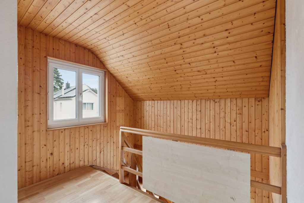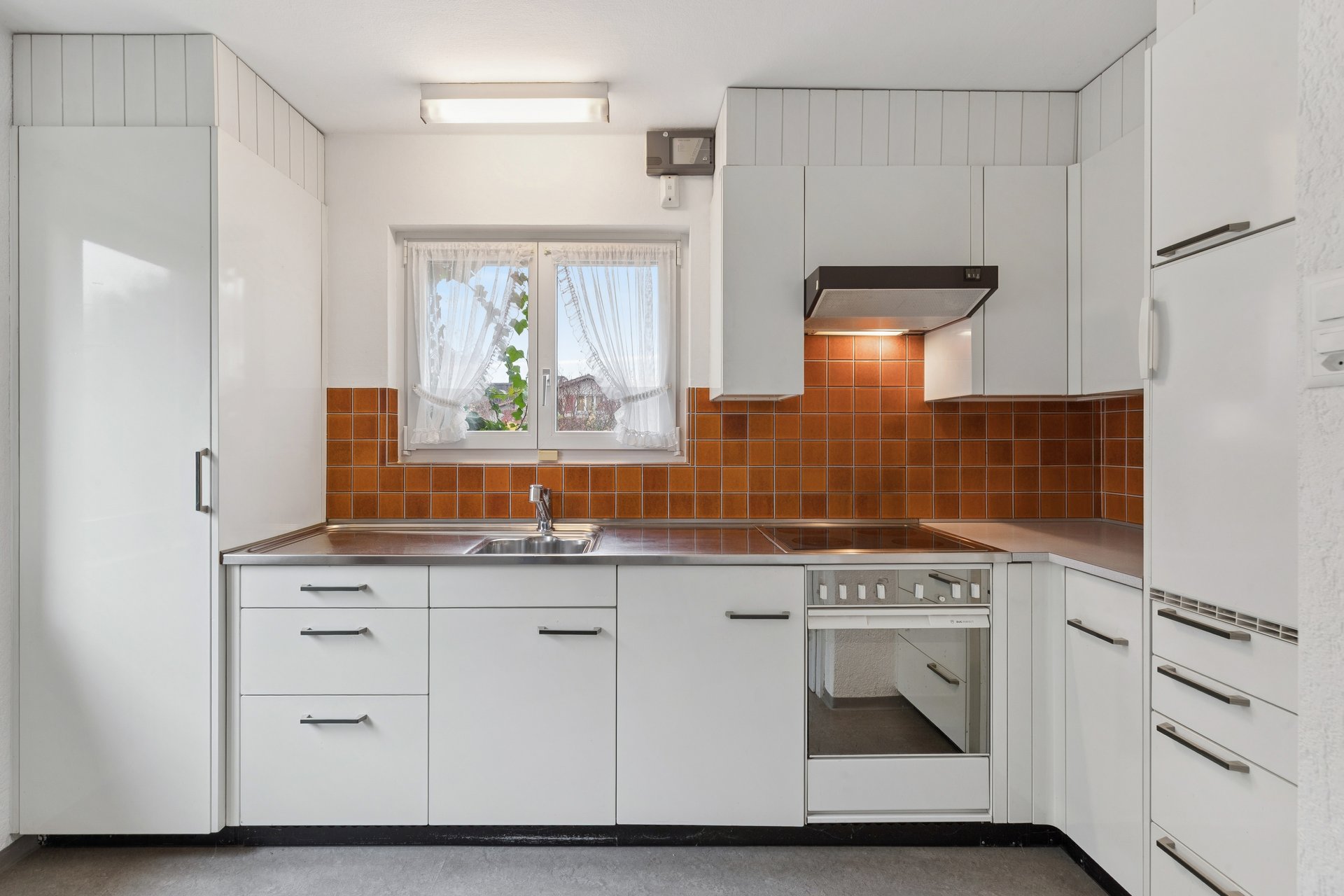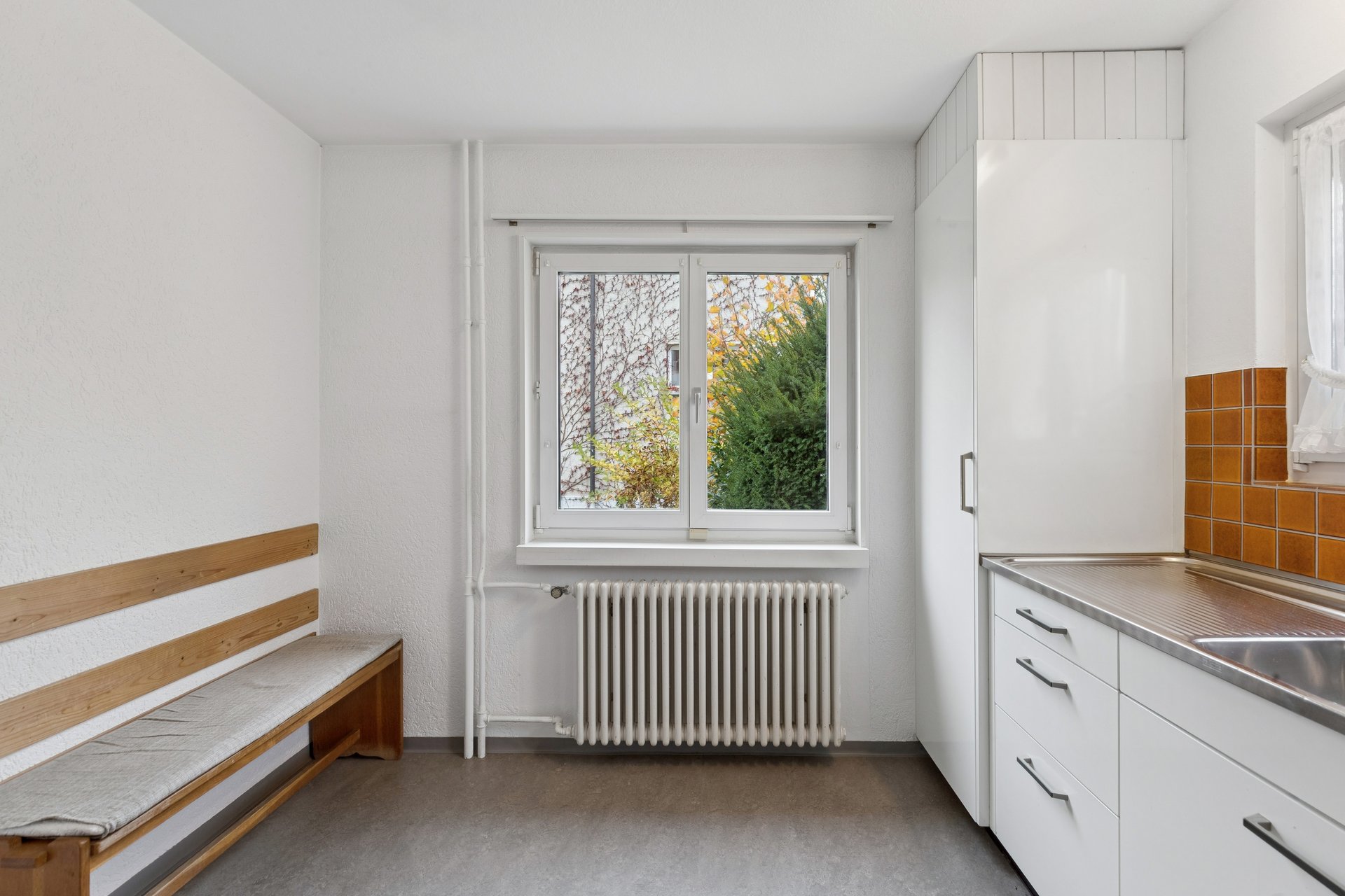 Die Küche ist grosszügig gehalten, mit einer gemütlichen Sitzbank und genügend Raum für einen Esstisch. Zwei Nassbereiche sorgen für Komfort im Alltag: ein Bad/WC im Obergeschoss sowie ein Gäste-WC im Erdgeschoss. Das Nebenraumangebot ist deutlich überdurchschnittlich: ein grosser Estrich im Dachgeschoss, zwei Kellerräume, eine Waschküche und ein Heizungsraum mit integrierter Werkbank.