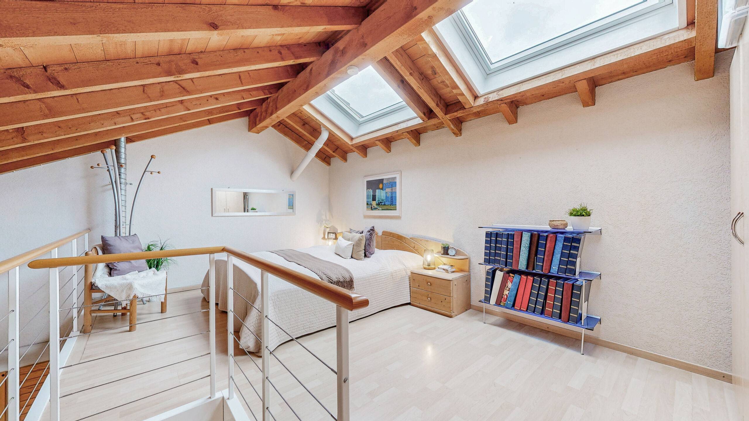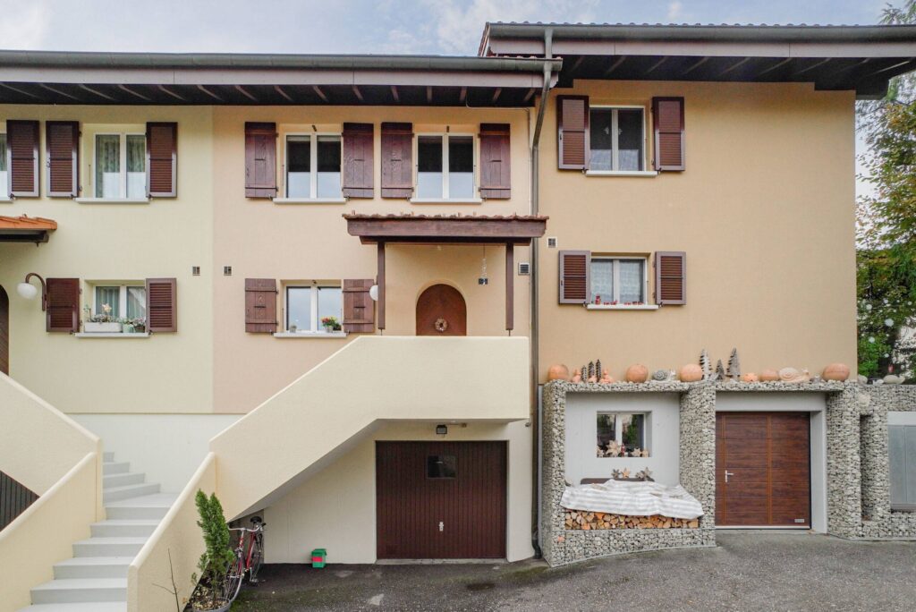 Im Untergeschoss stehen praktische Nebenräume zur Verfügung: ein Keller für Stauraum, eine funktionale Waschküche sowie eine Garage, die genügend Platz für Velos und weiteres Material bietet. Zusätzlich gehören eine separate Garagebox und ein Aussenstellplatz zum Angebot.