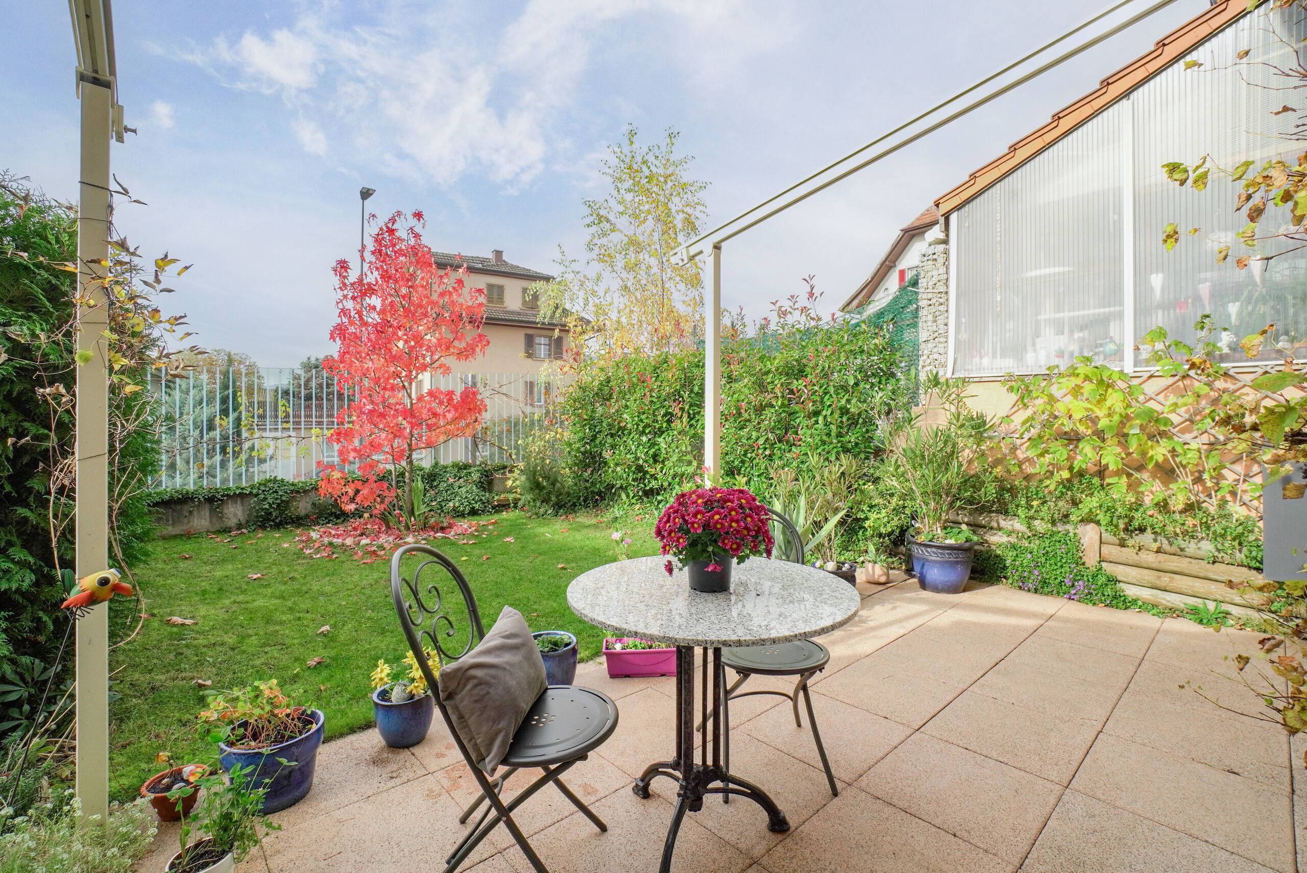 Der Garten gehört zu den Highlights des Hauses. Die Terrasse bietet Raum für entspannte Stunden im Freien, sei es beim Essen, Lesen oder Geniessen der Abendsonne. Die Gartenfläche ist überschaubar, gepflegt und dennoch vielseitig gestaltbar.