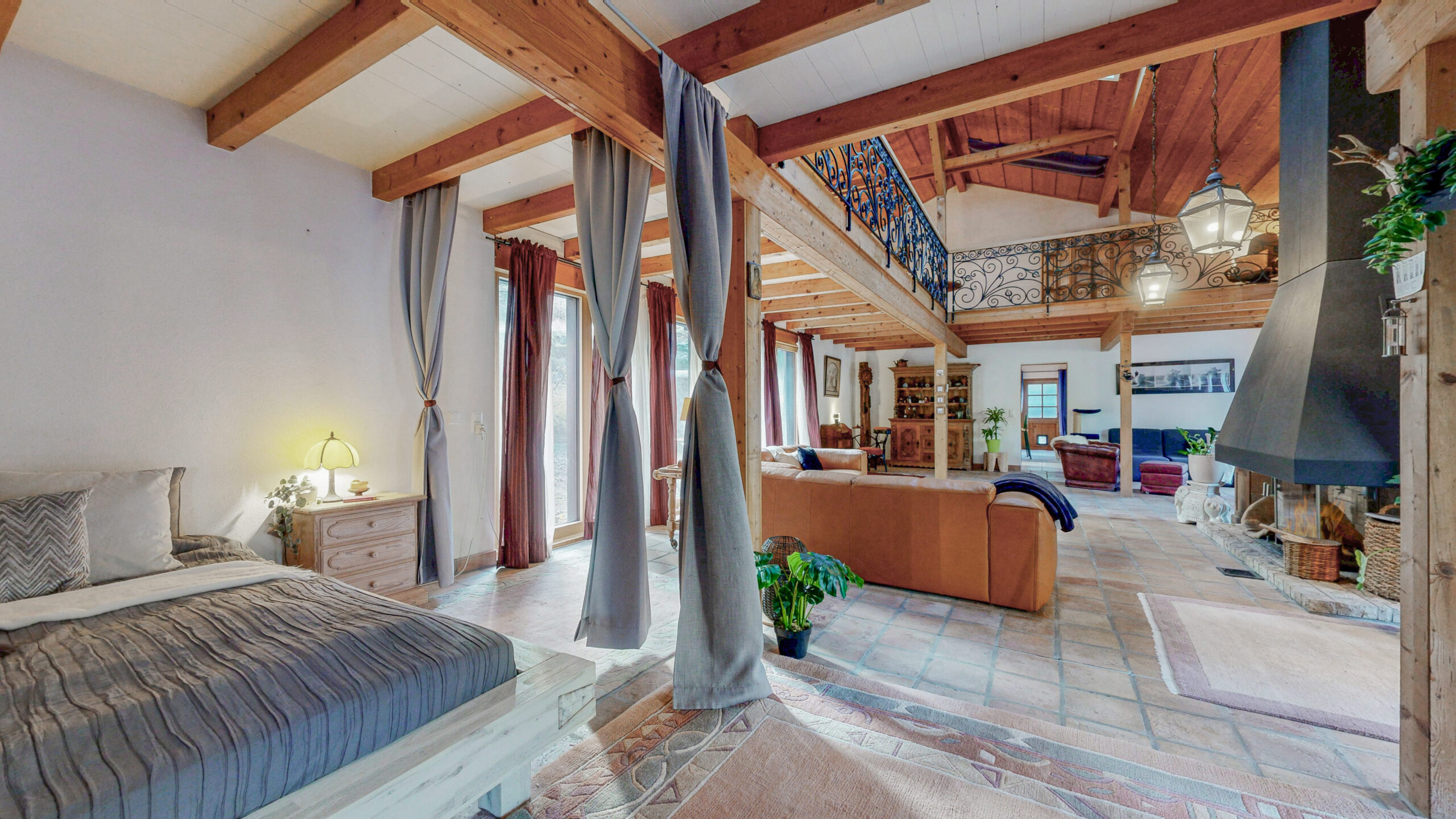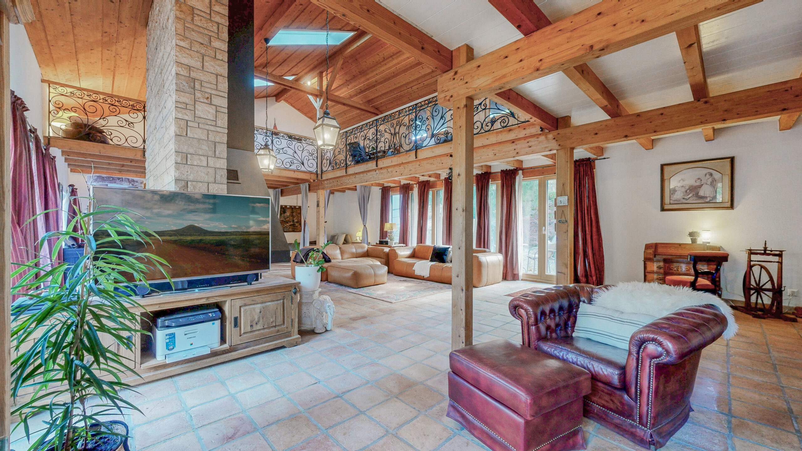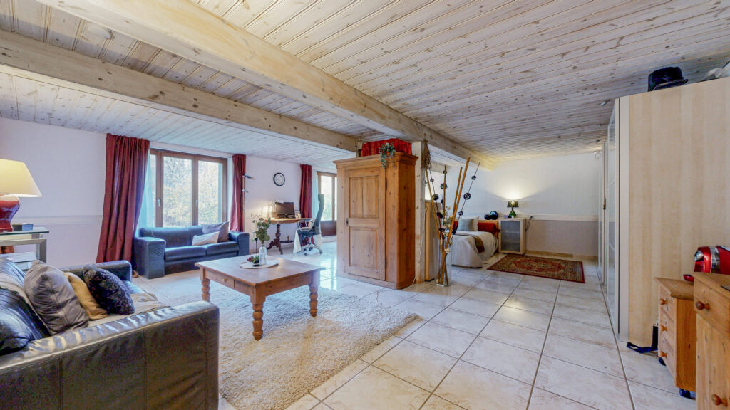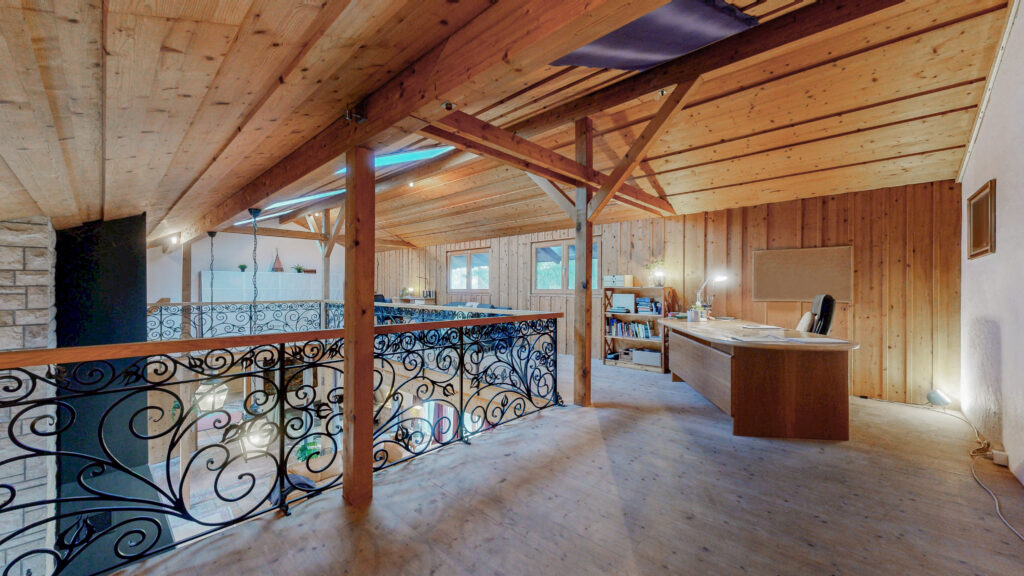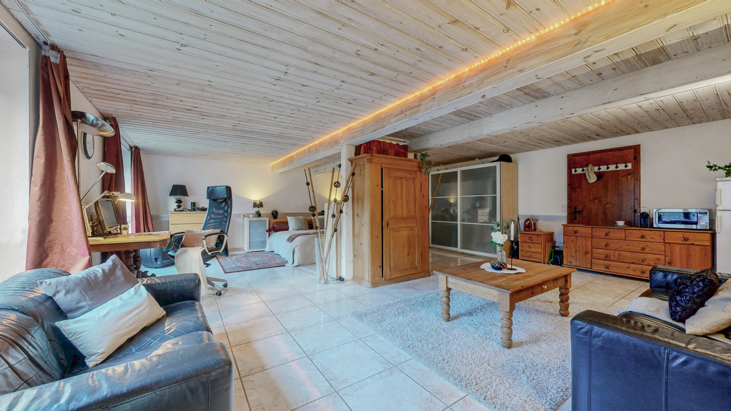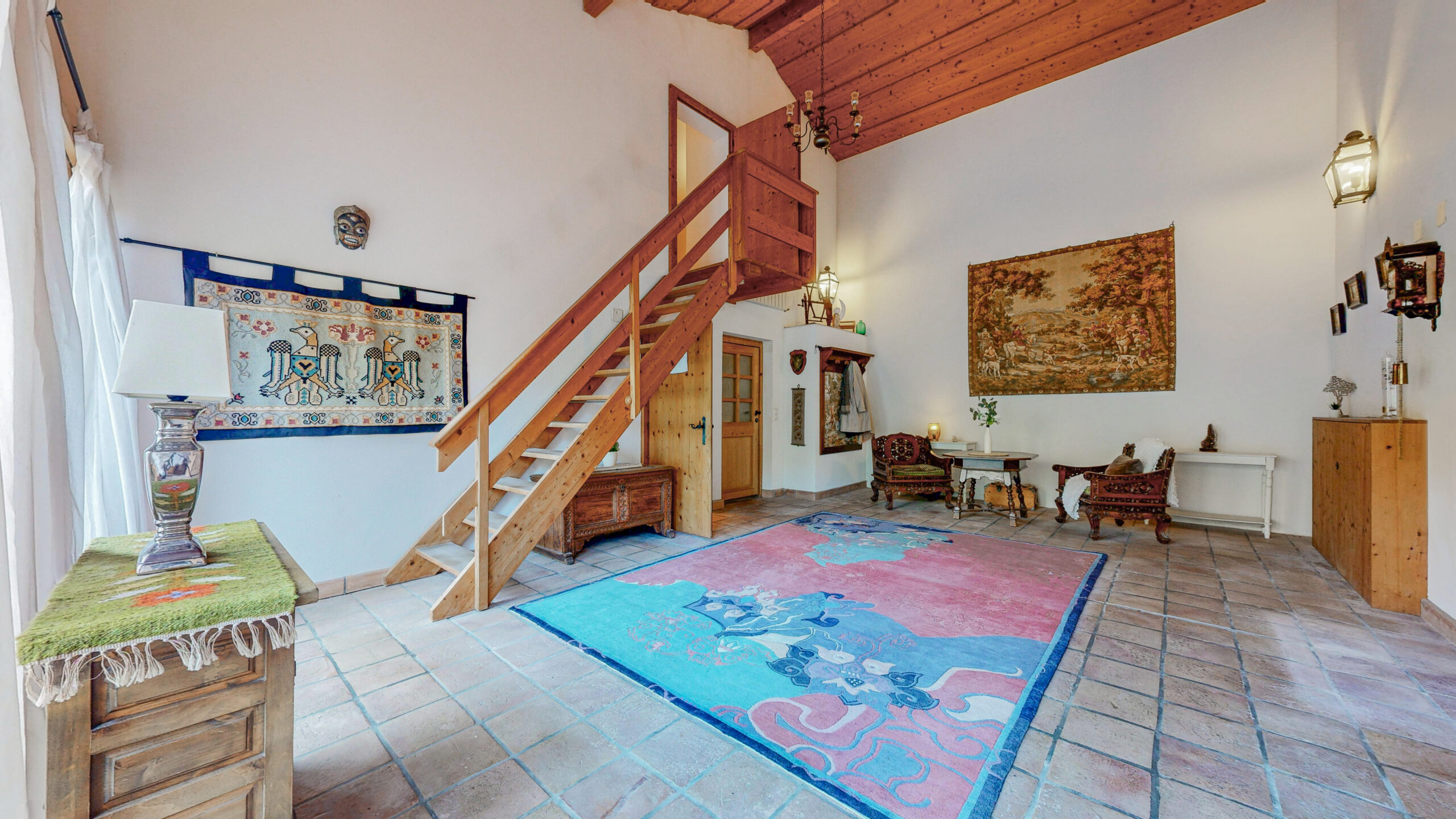 Das Anwesen bietet ein beeindruckendes Raumangebot: Insgesamt stehen rund 490 m² Wohnfläche sowie 643 m² Gesamtnutzfläche zur Verfügung. Herzstück der Liegenschaft ist ein hochwertig ausgebautes 5.5 Zimmer Wohnhaus, das aktuell vermietet ist. Die Landhausarchitektur überzeugt mit grosszügigen Raumhöhen, zwei Wohnzimmern und einer offenen Galerie auf der Südseite, die dem Wohnbereich eine besonders eindrucksvolle Atmosphäre verleiht.