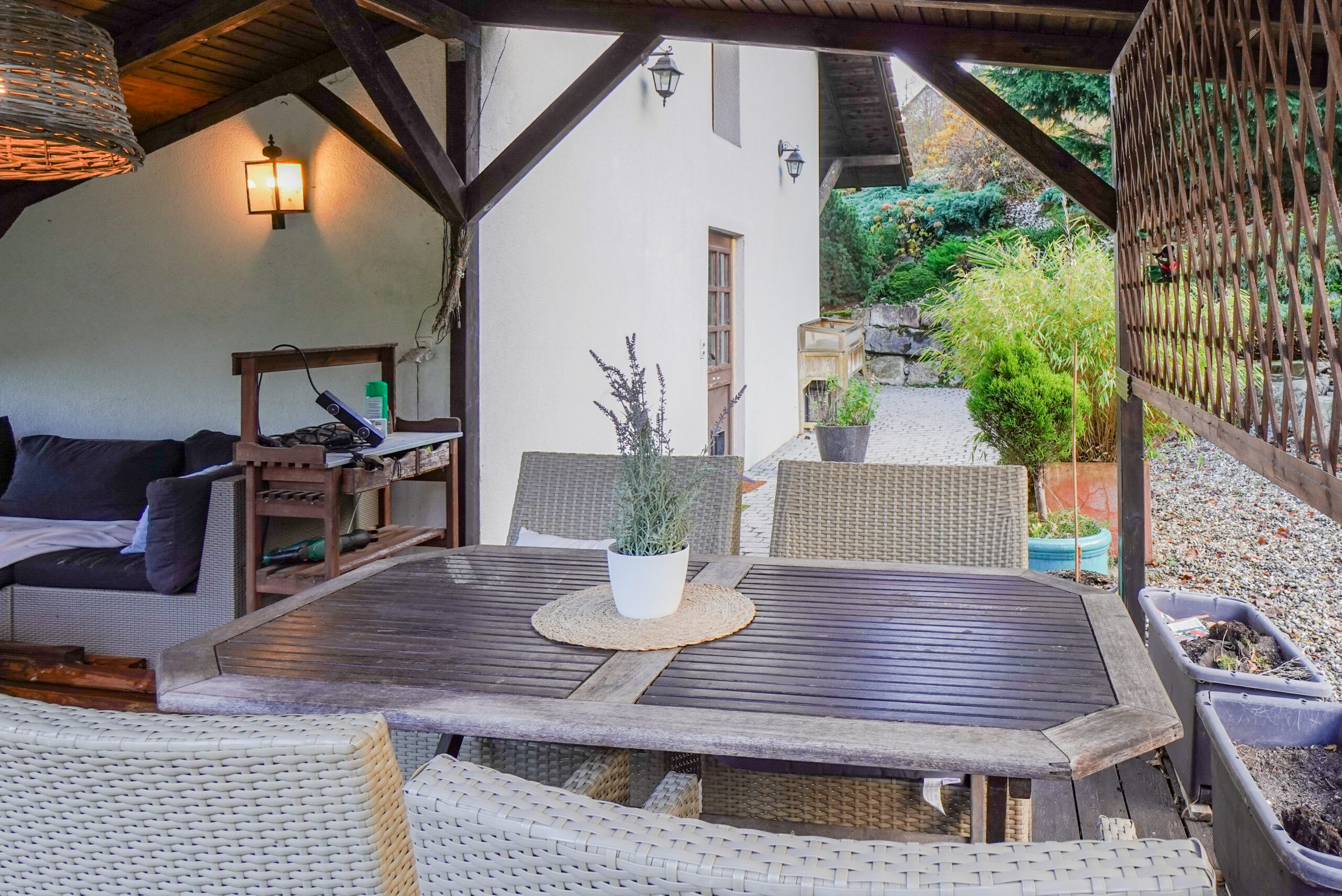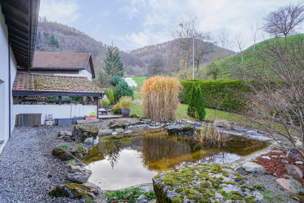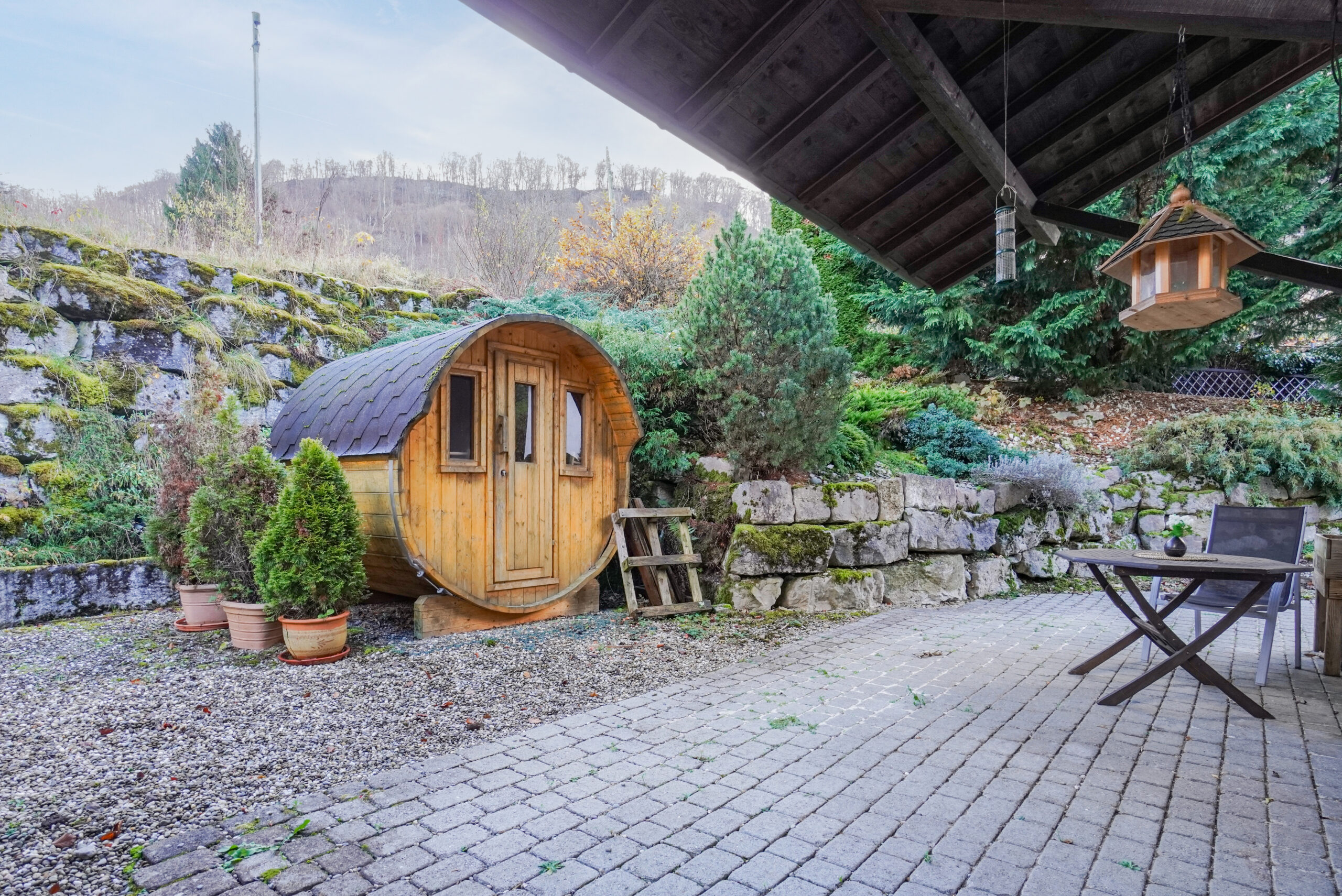 Auch der Aussenbereich überzeugt mit zahlreichen Details: Eine Pergola, ein charmantes Fasshaus sowie grosszügige Flächen laden zum Verweilen im Freien ein und schaffen eine besondere Atmosphäre rund um das Haus.