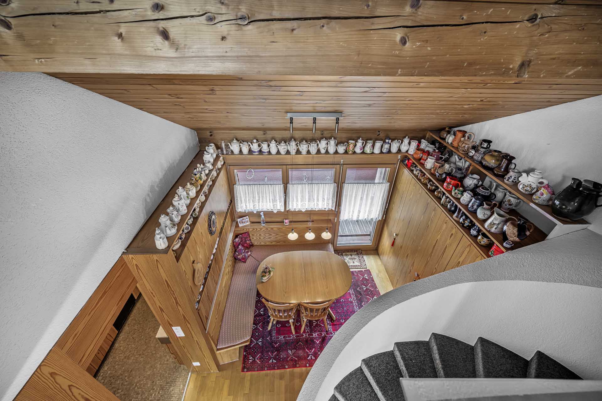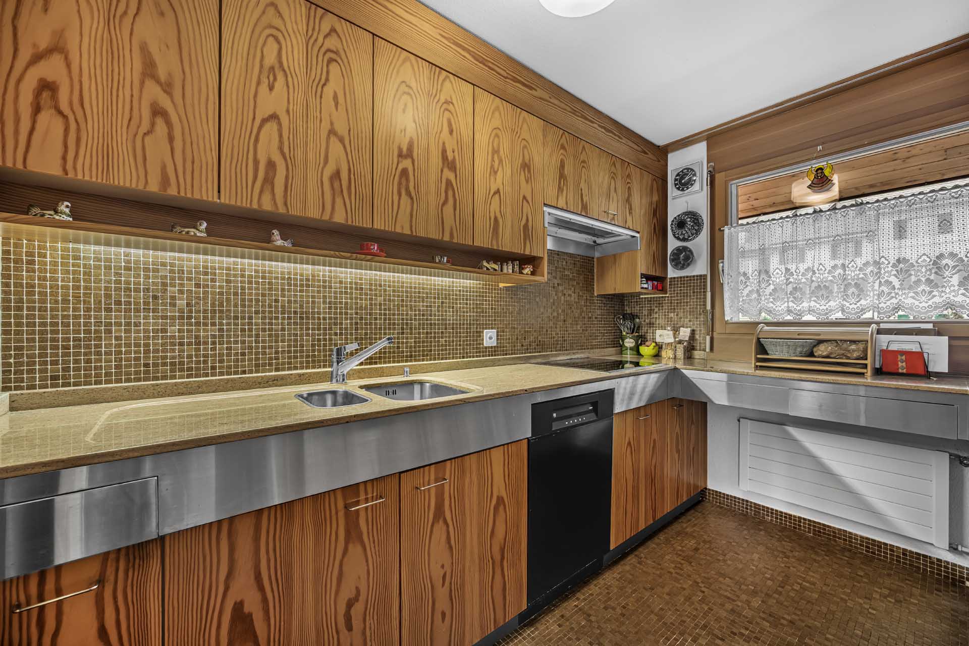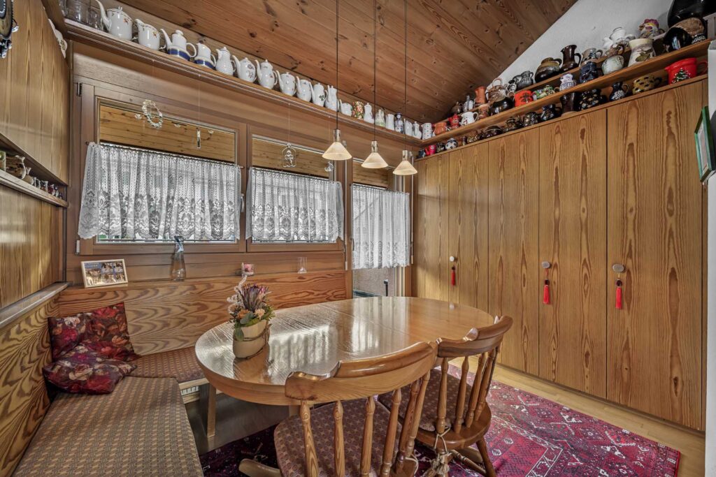 Der Wohnbereich überzeugt mit seiner grosszügigen Raumhöhe und dem gemütlichen Cheminée, das sofort für Wärme und Atmosphäre sorgt. Die angrenzende Küche ist in U-Form gestaltet und bietet viel Stauraum sowie eine ergonomische Arbeitsfläche – ideal für alle, die gerne kochen und Wert auf praktische Lösungen legen.