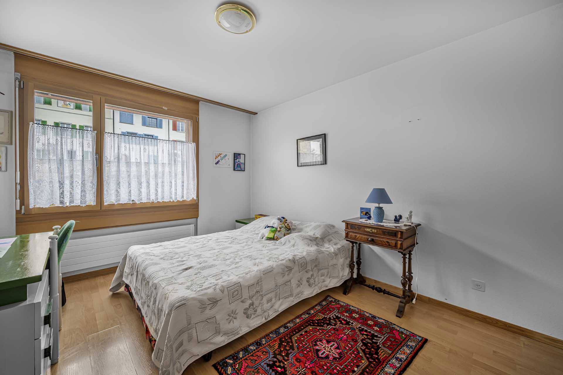 Im Schlaf- und Badbereich stehen ein WC/Lavabo sowie eine separate Dusche zur Verfügung. Zwei grosszügige Balkone erweitern den Wohnraum nach draussen und bieten eine schöne Sicht auf die Altstadt und in den ruhigen Innenhof.
