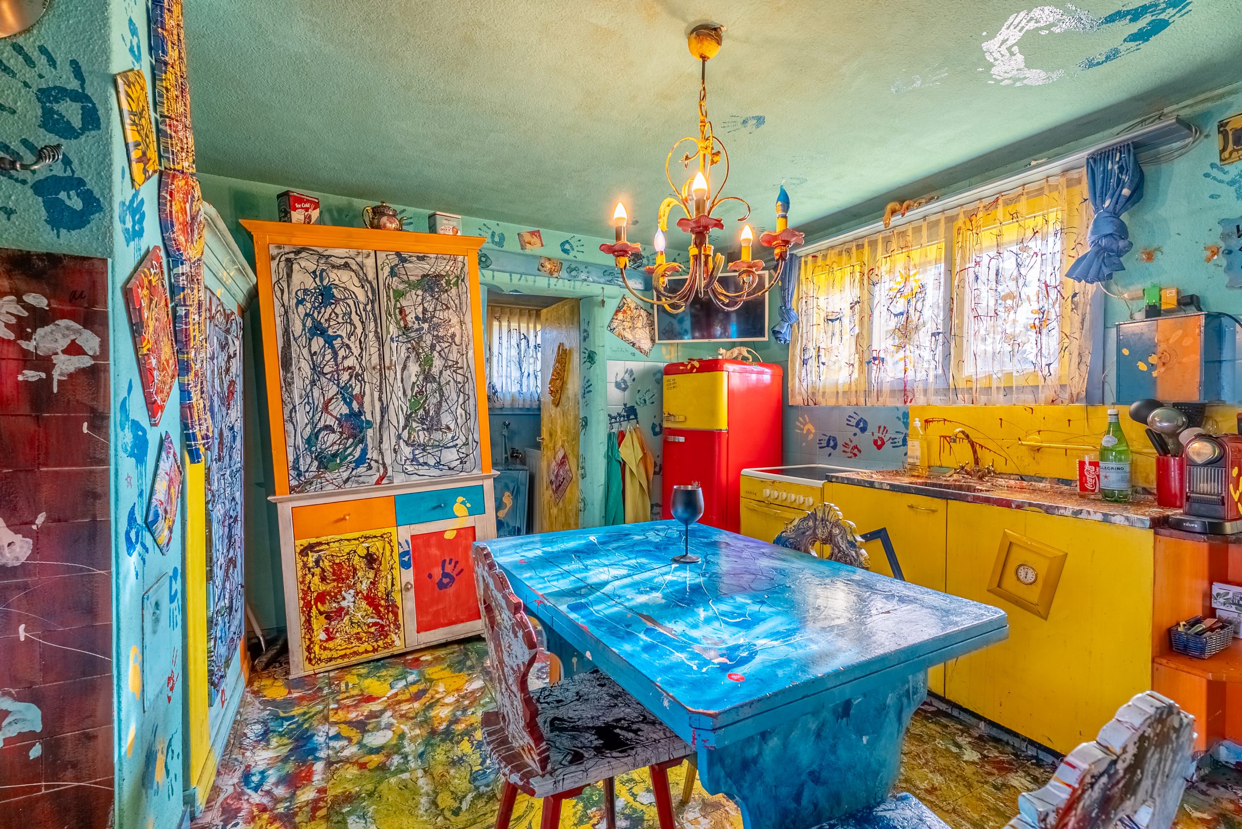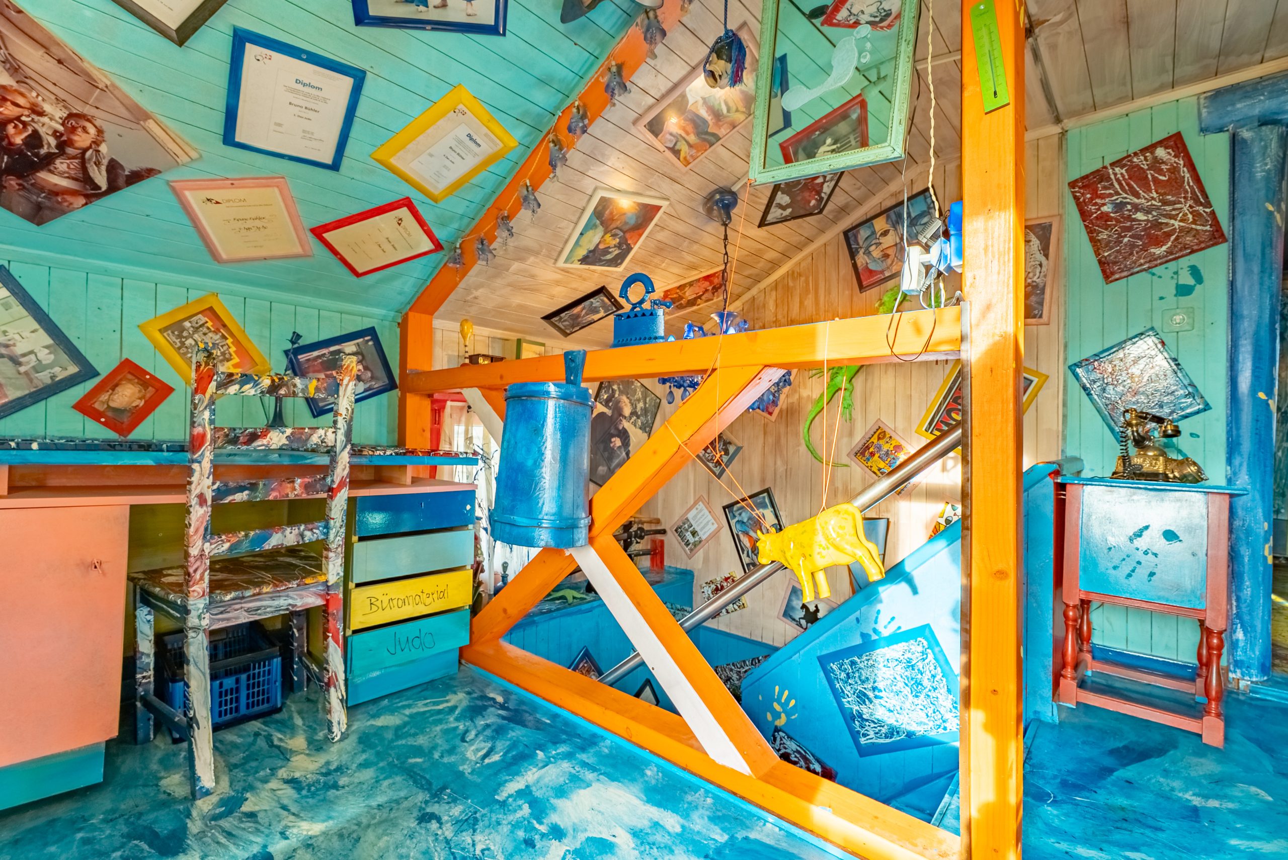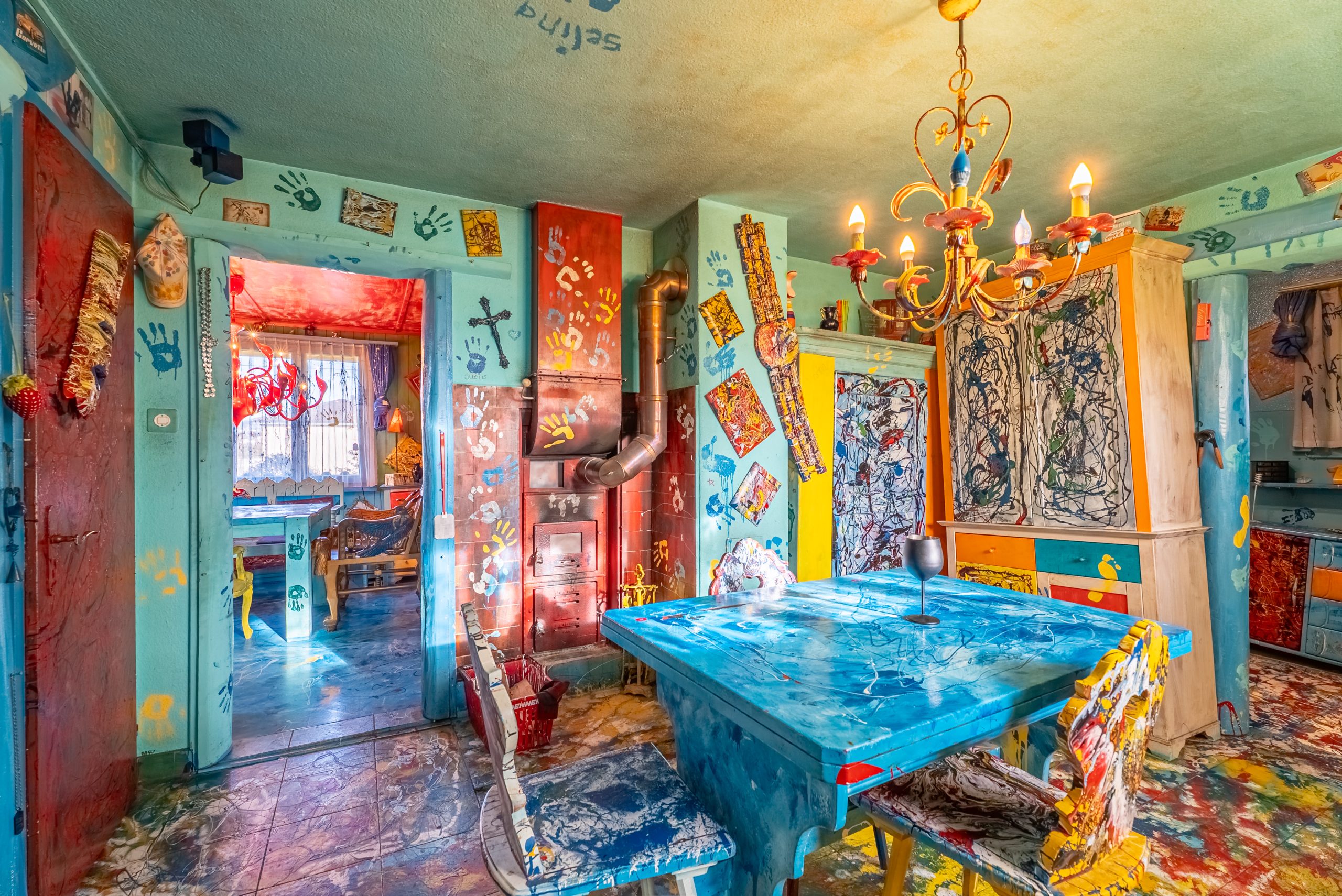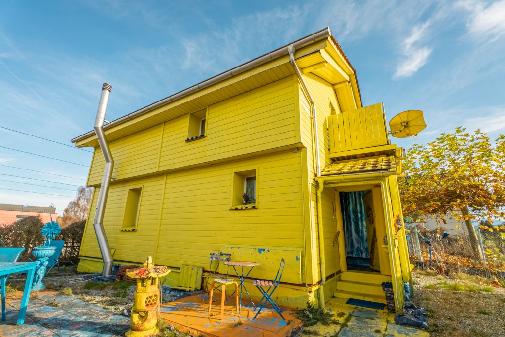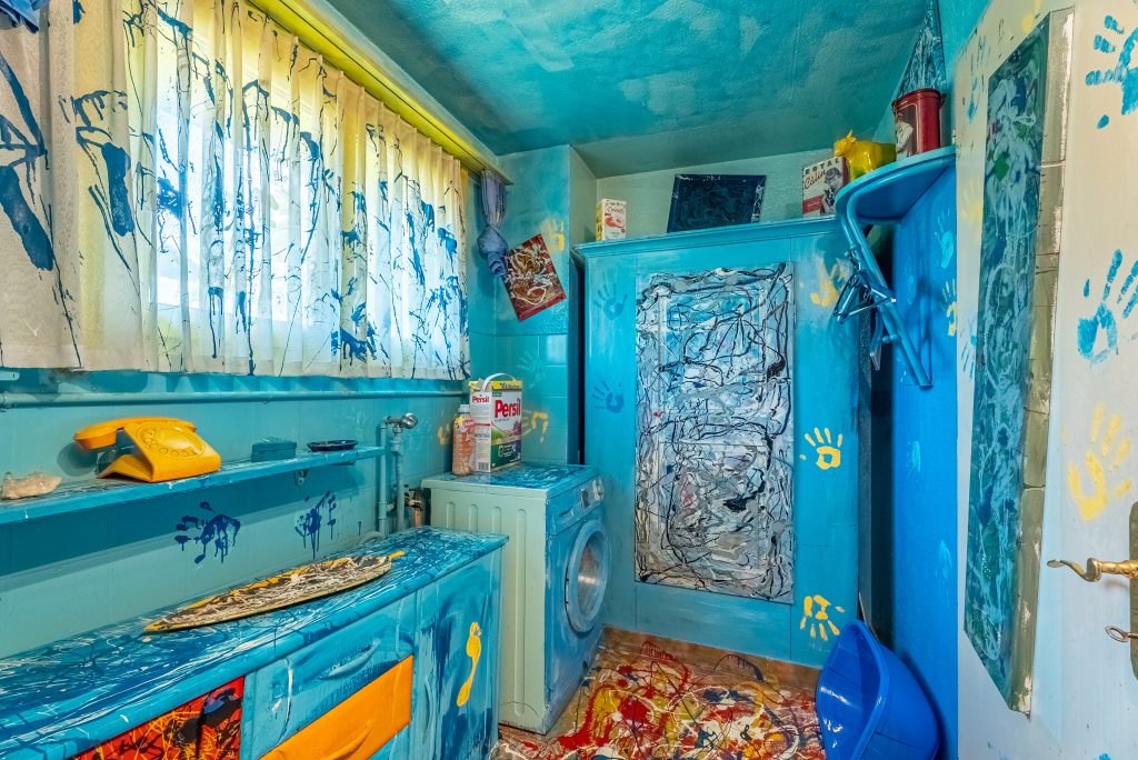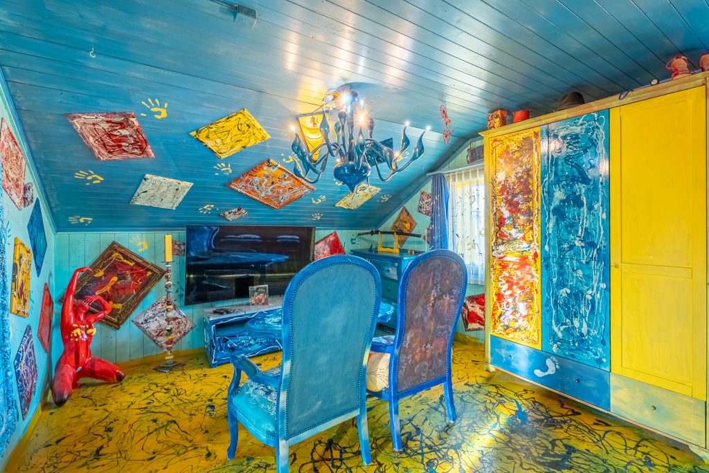 Das Wohnhaus präsentiert sich mit einem Pop-Art-inspirierten Farbkonzept in leuchtendem Gelb und tiefem Blau. Nichts ist zufällig, nichts ist gerade – und genau das macht den Charme aus. Schräge Linien, verspielte Übergänge und bewusst gesetzte Brüche schaffen ein Ambiente, das jeden Raum lebendig macht. Die gelbe Küche bietet genügend Platz für einen Esstisch und lädt zu Gesprächen ein, die genauso bunt sind wie die Umgebung. Im Untergeschoss wartet ein gemütlicher Ess- oder Partyraum, perfekt für lange Abende, gute Musik und Menschen, die das Leben feiern.