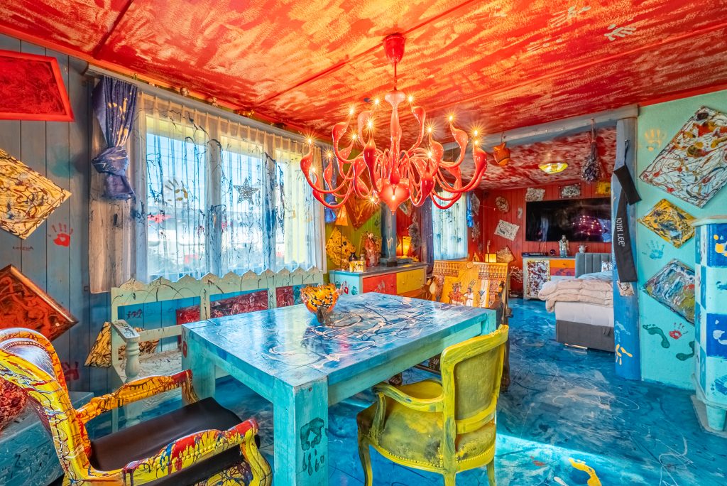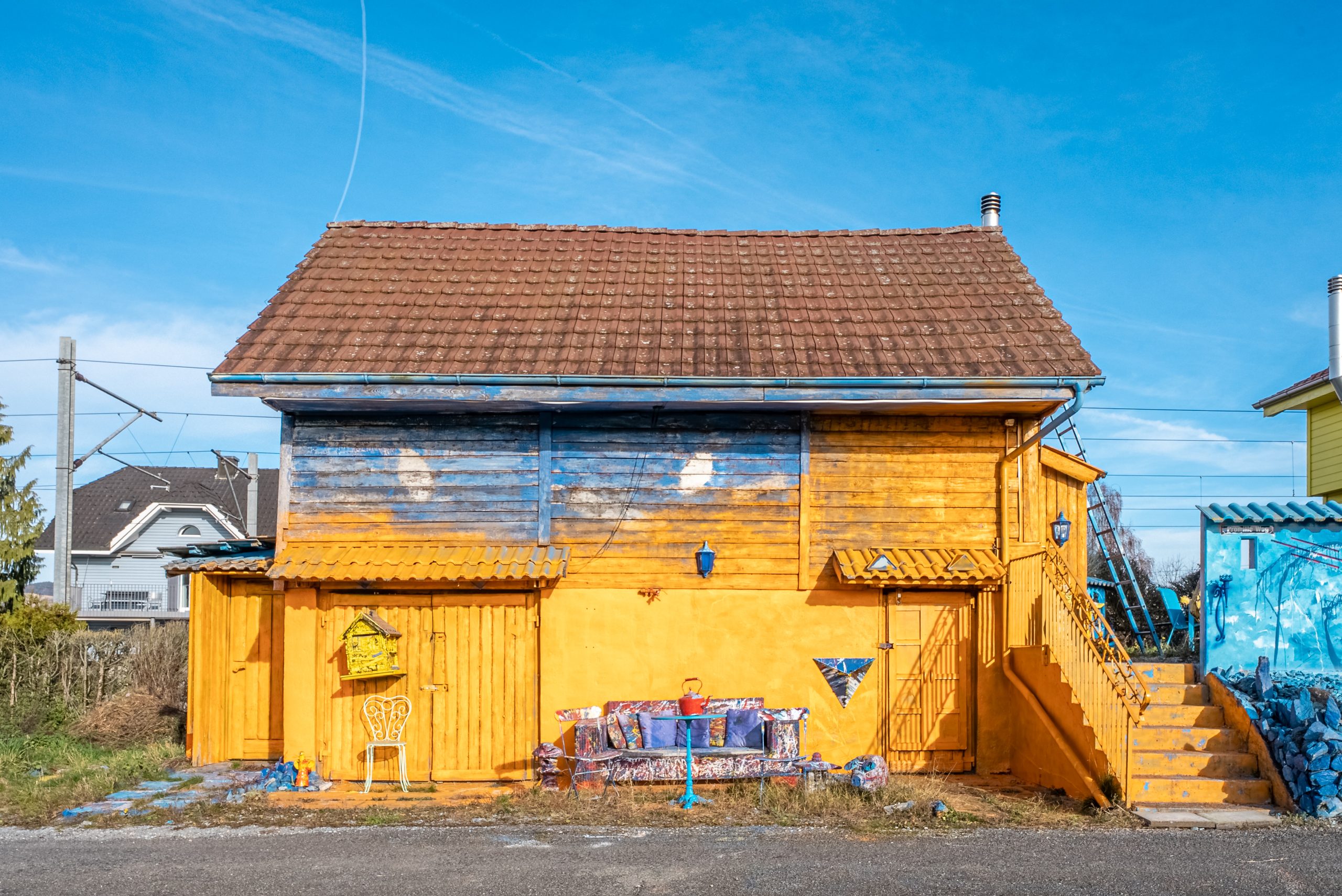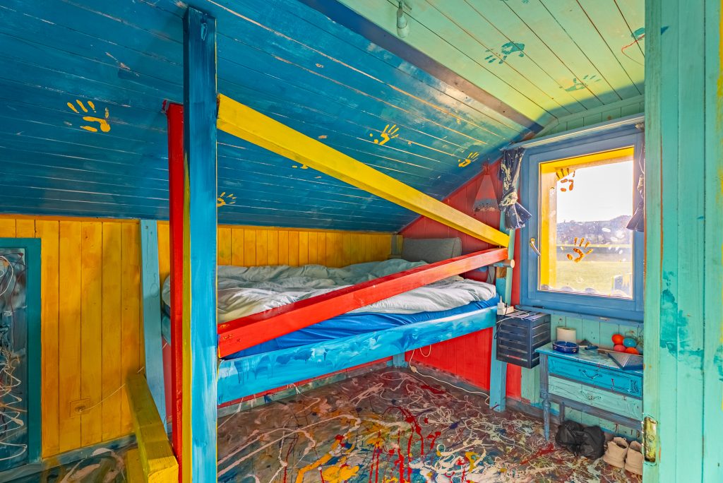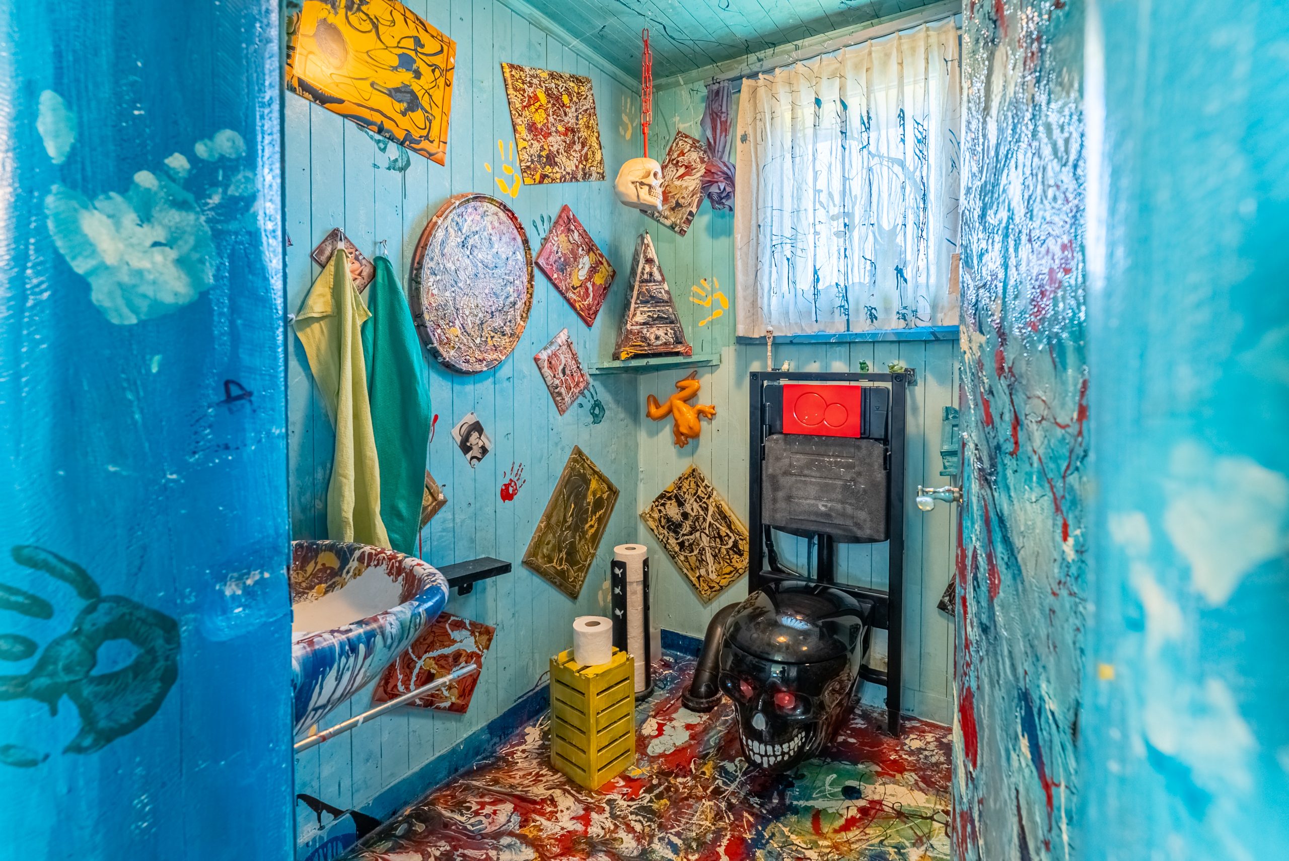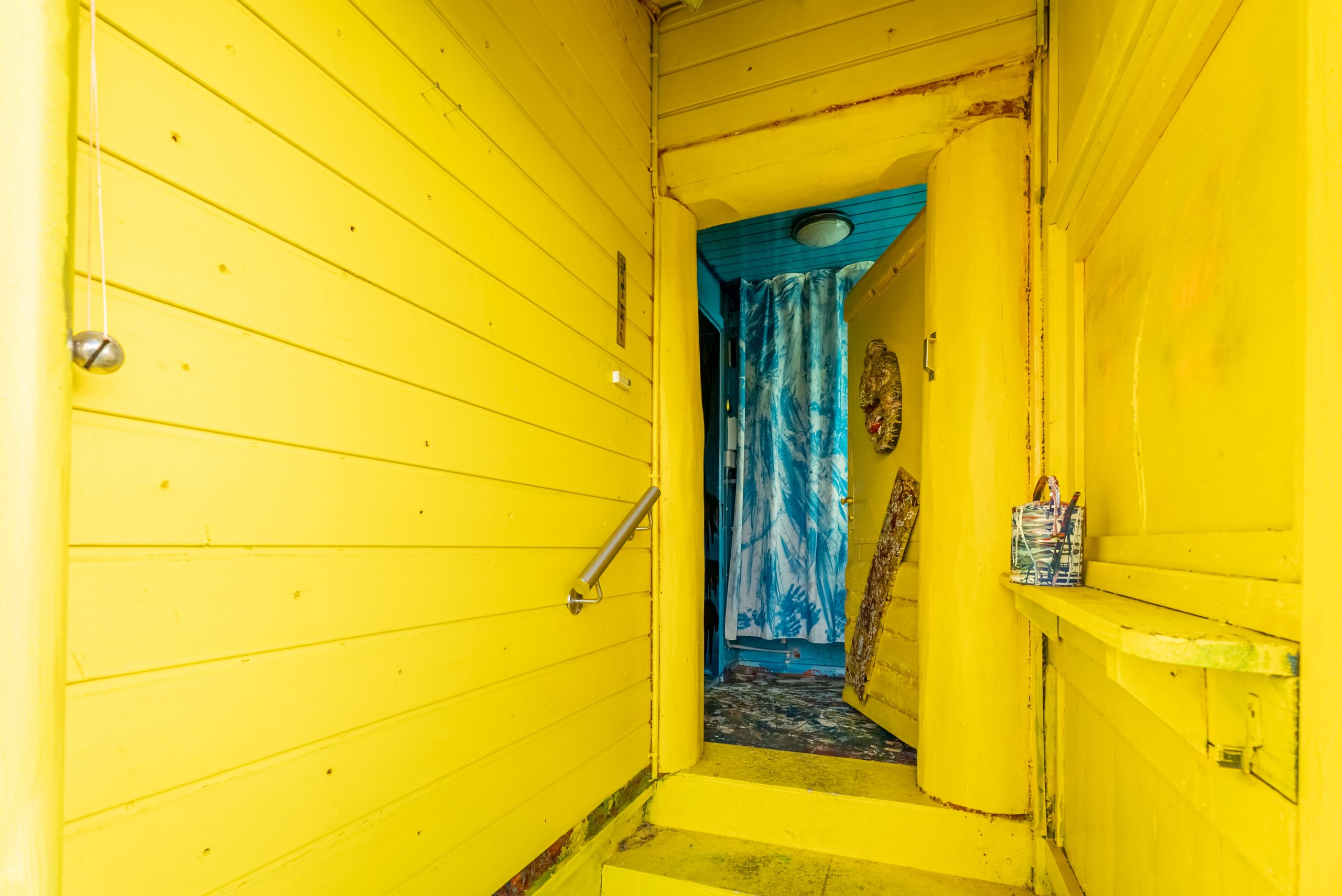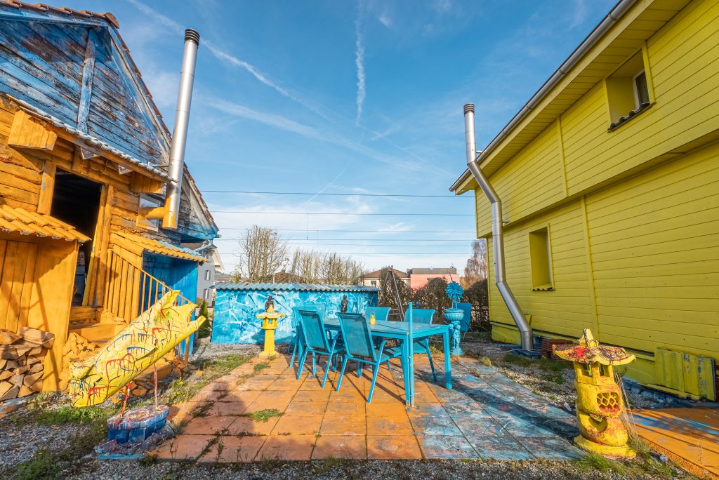 Das Wohnhaus präsentiert sich mit einem Pop-Art-inspirierten Farbkonzept in leuchtendem Gelb und tiefem Blau. Nichts ist zufällig, nichts ist gerade – und genau das macht den Charme aus. Schräge Linien, verspielte Übergänge und bewusst gesetzte Brüche schaffen ein Ambiente, das jeden Raum lebendig macht. Die gelbe Küche bietet genügend Platz für einen Esstisch und lädt zu Gesprächen ein, die genauso bunt sind wie die Umgebung. Im Untergeschoss wartet ein gemütlicher Ess- oder Partyraum, perfekt für lange Abende, gute Musik und Menschen, die das Leben feiern.