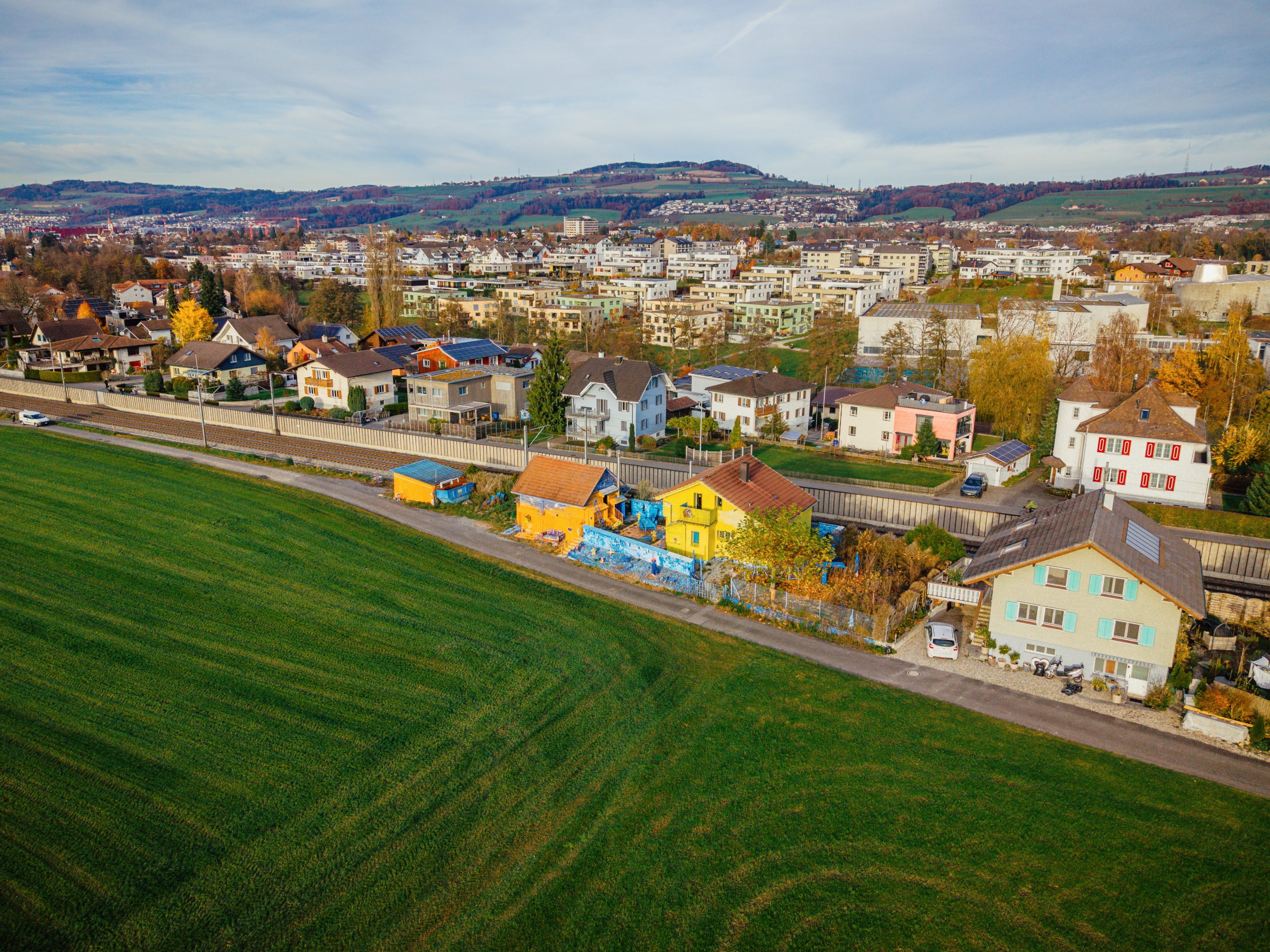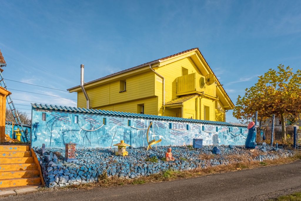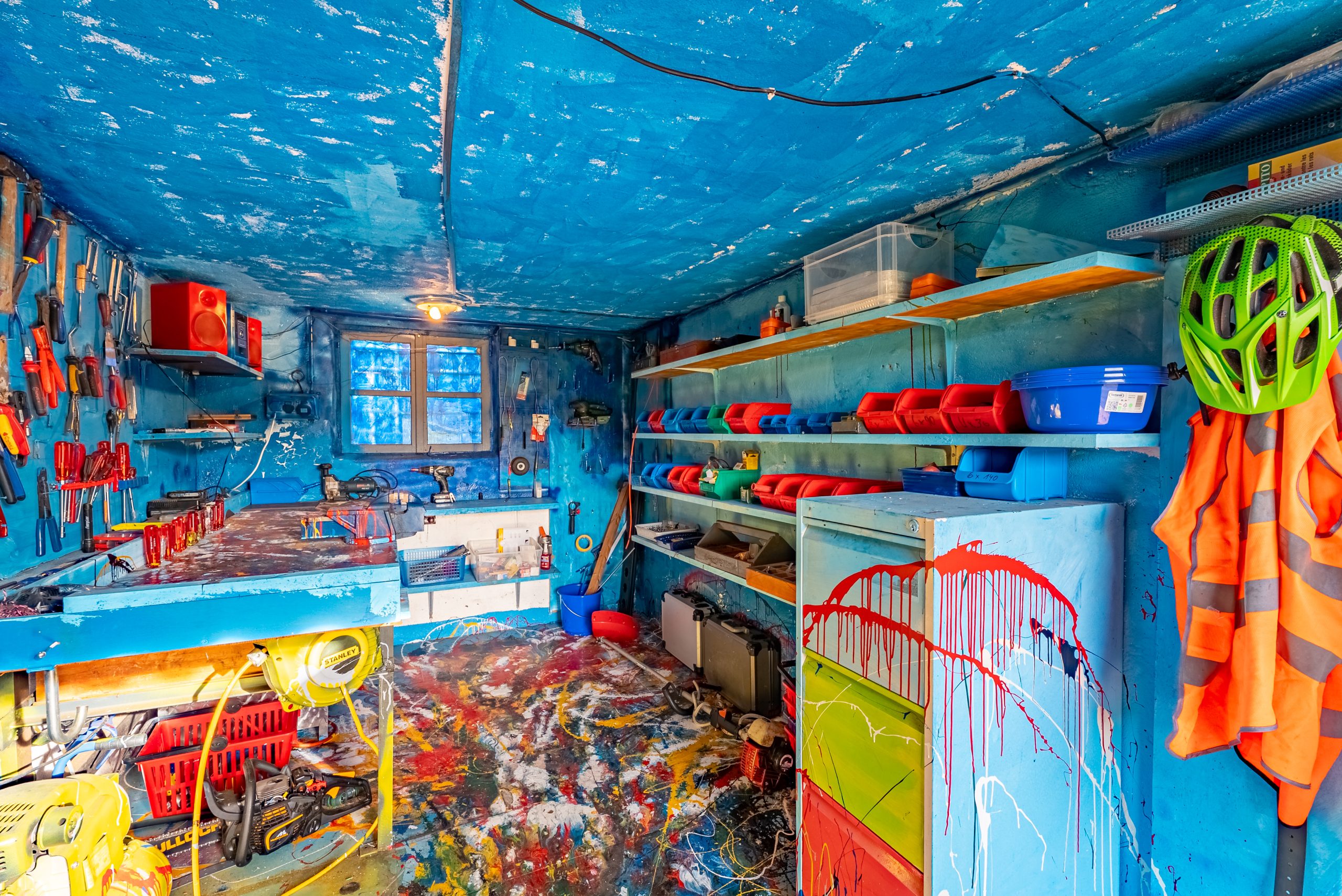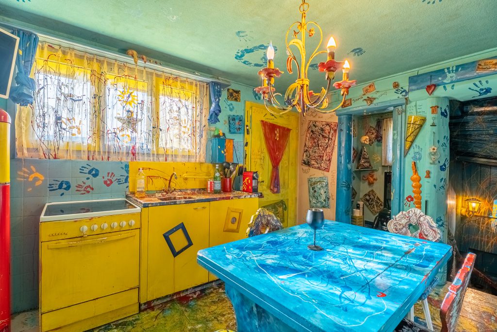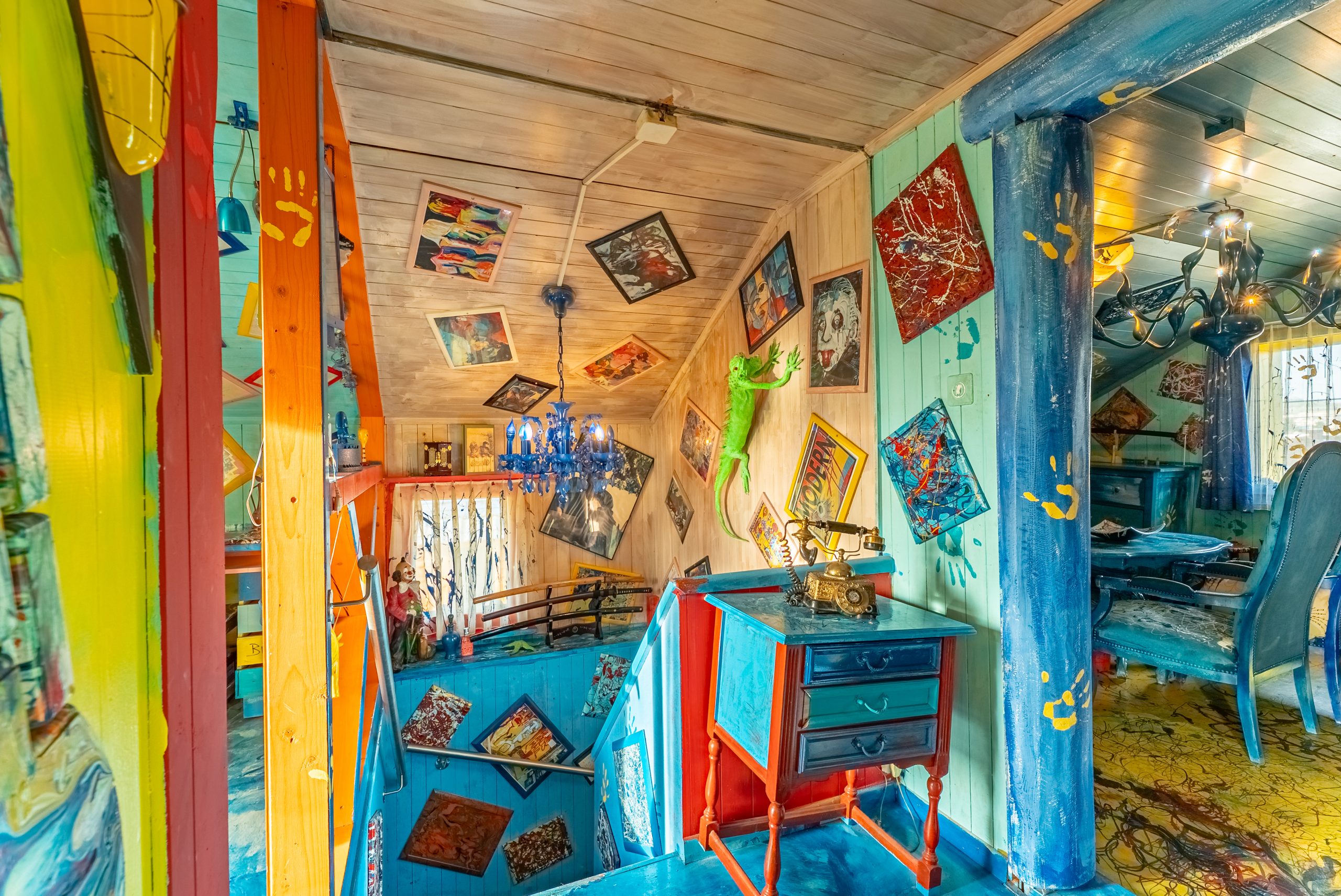 Das Wohnhaus präsentiert sich mit einem Pop-Art-inspirierten Farbkonzept in leuchtendem Gelb und tiefem Blau. Nichts ist zufällig, nichts ist gerade – und genau das macht den Charme aus. Schräge Linien, verspielte Übergänge und bewusst gesetzte Brüche schaffen ein Ambiente, das jeden Raum lebendig macht. Die gelbe Küche bietet genügend Platz für einen Esstisch und lädt zu Gesprächen ein, die genauso bunt sind wie die Umgebung. Im Untergeschoss wartet ein gemütlicher Ess- oder Partyraum, perfekt für lange Abende, gute Musik und Menschen, die das Leben feiern.