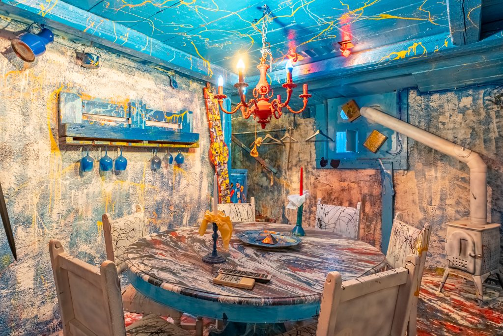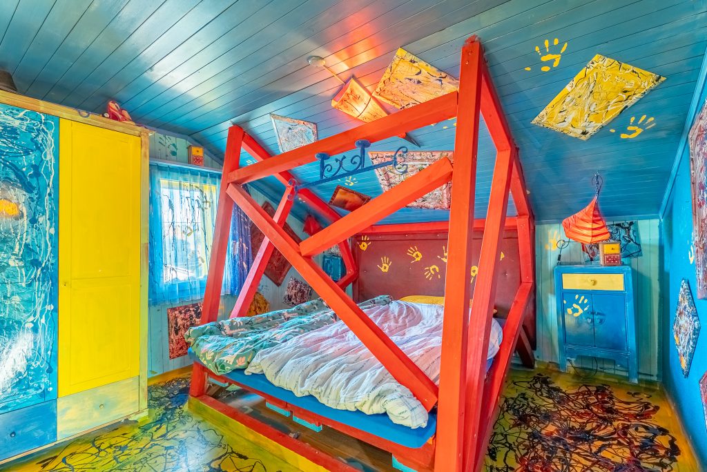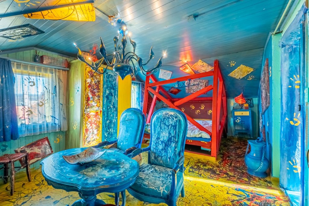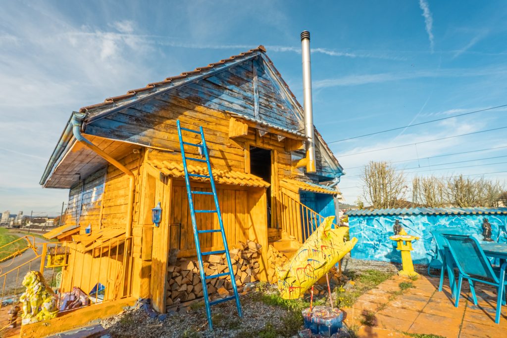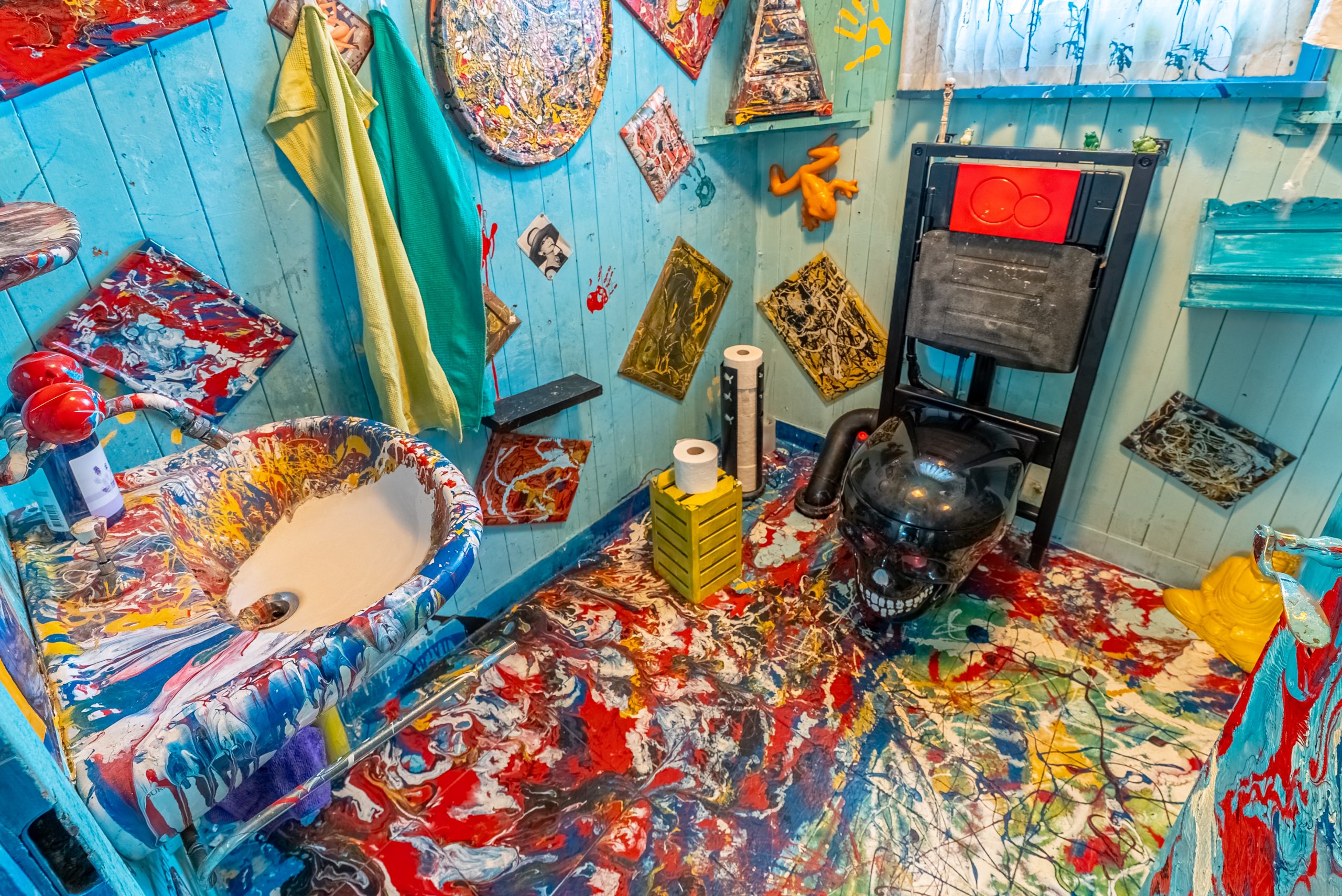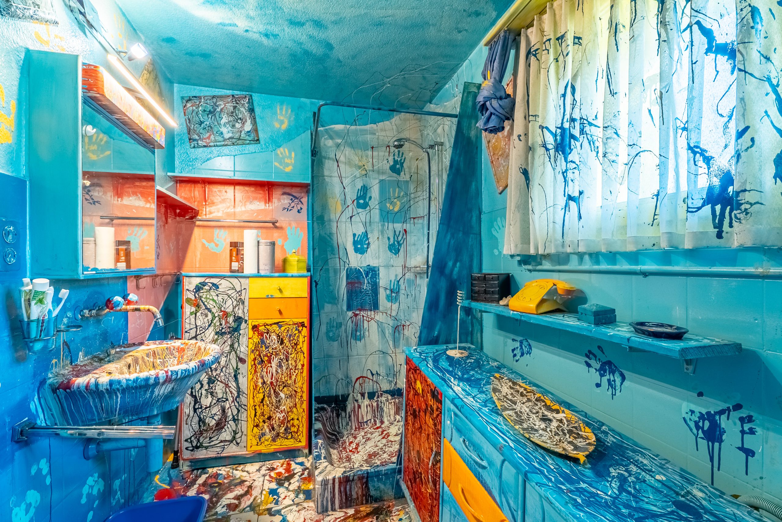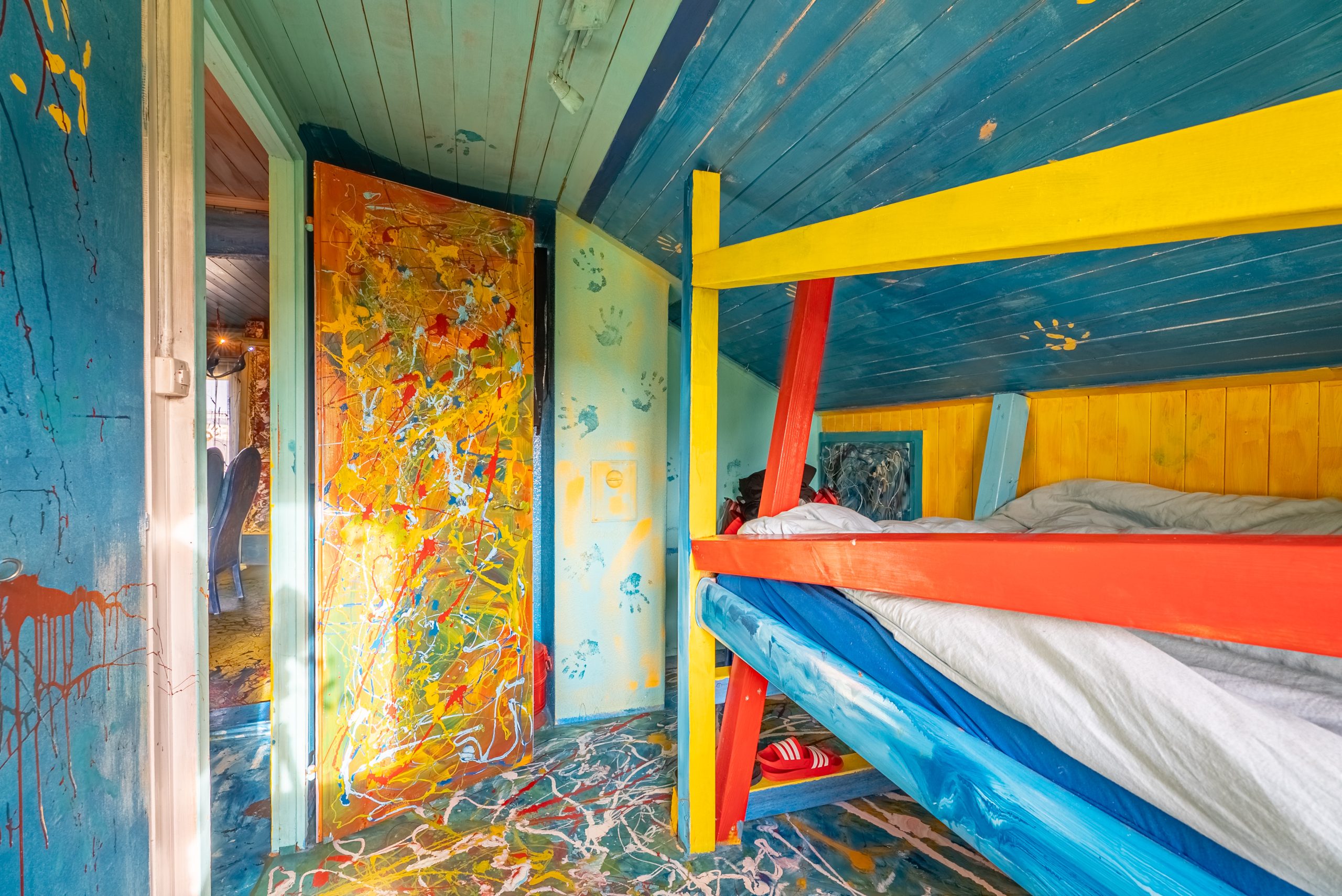 Das Wohnhaus präsentiert sich mit einem Pop-Art-inspirierten Farbkonzept in leuchtendem Gelb und tiefem Blau. Nichts ist zufällig, nichts ist gerade – und genau das macht den Charme aus. Schräge Linien, verspielte Übergänge und bewusst gesetzte Brüche schaffen ein Ambiente, das jeden Raum lebendig macht. Die gelbe Küche bietet genügend Platz für einen Esstisch und lädt zu Gesprächen ein, die genauso bunt sind wie die Umgebung. Im Untergeschoss wartet ein gemütlicher Ess- oder Partyraum, perfekt für lange Abende, gute Musik und Menschen, die das Leben feiern.
