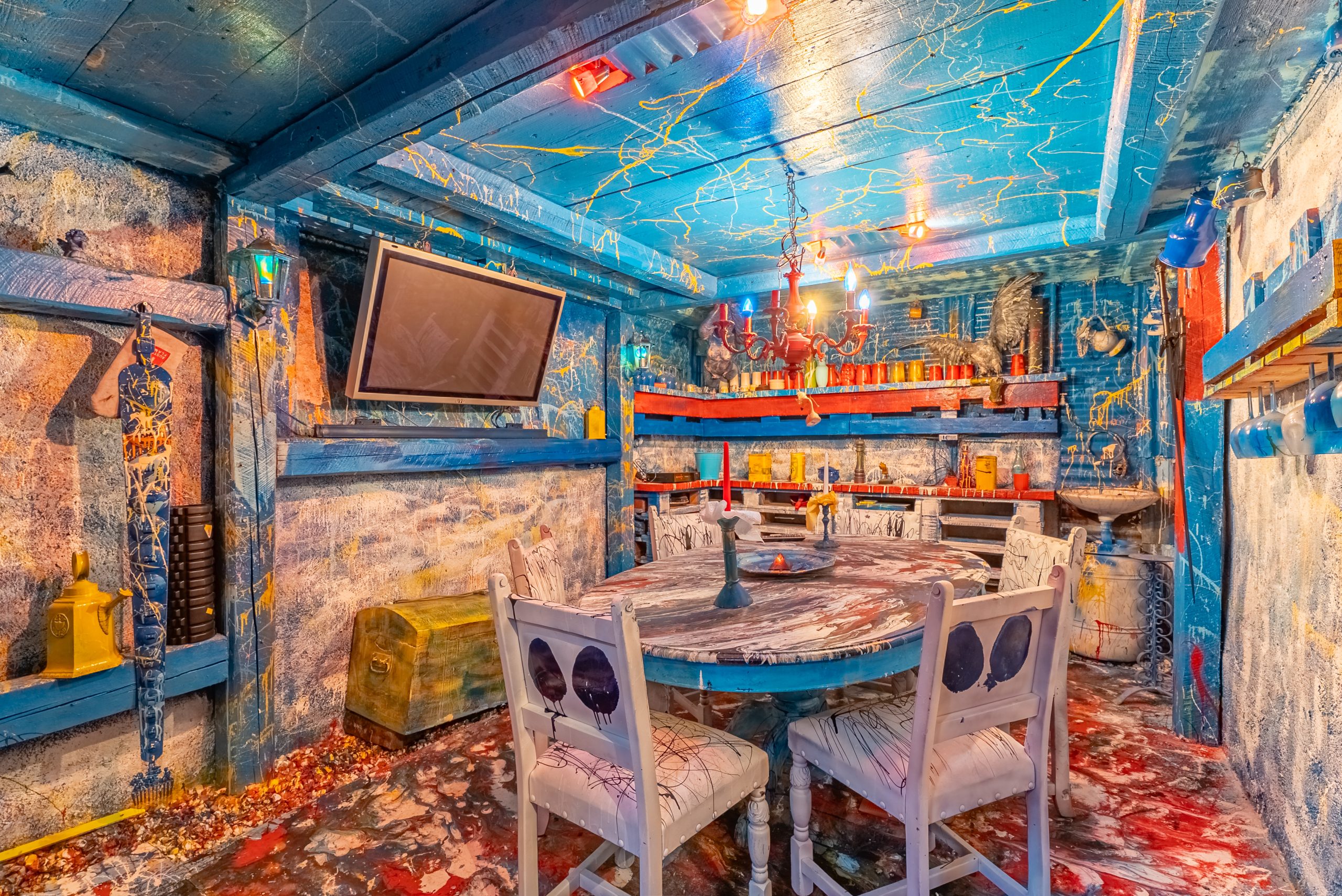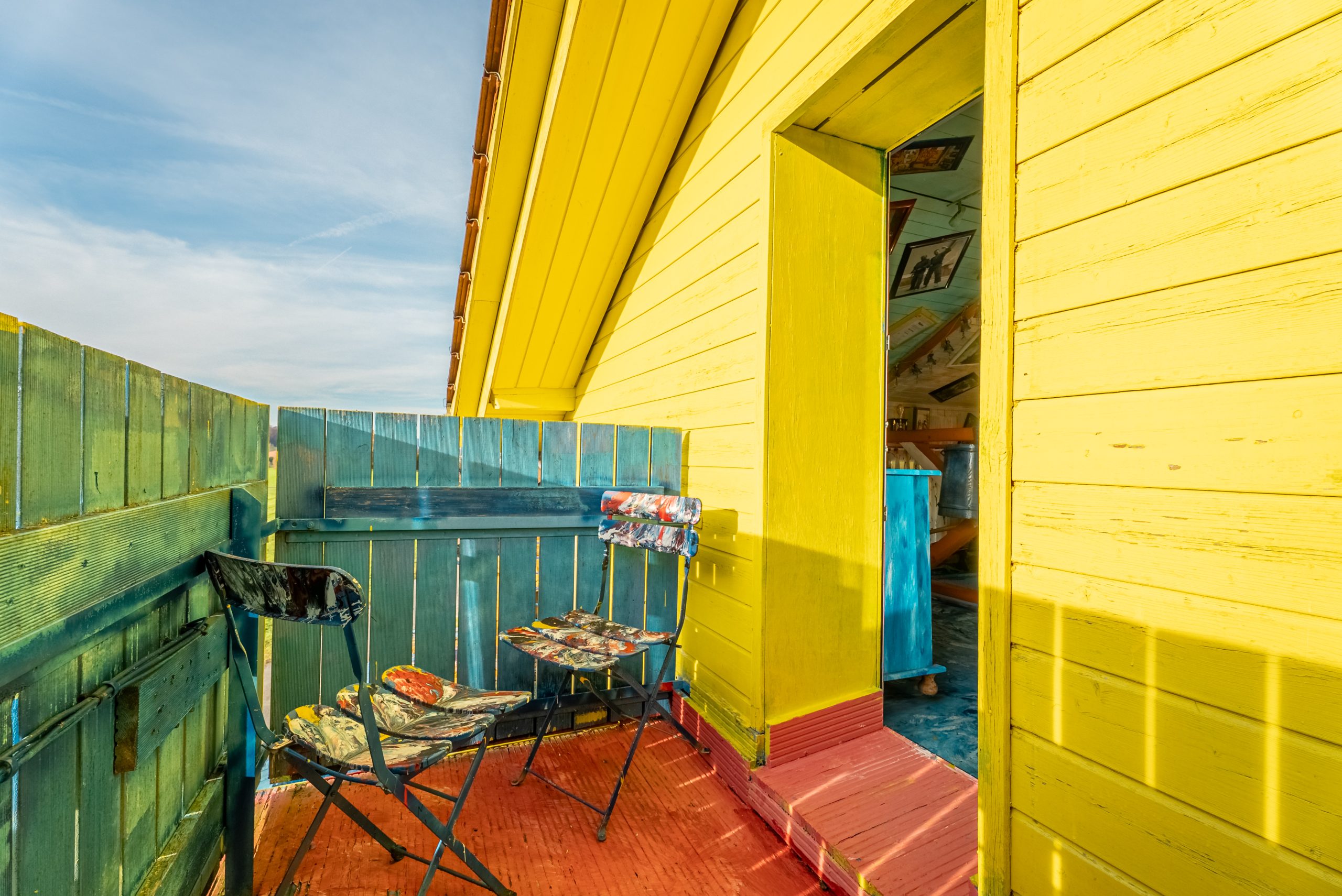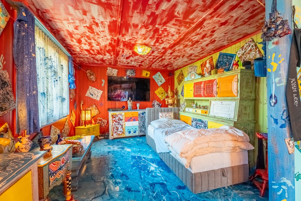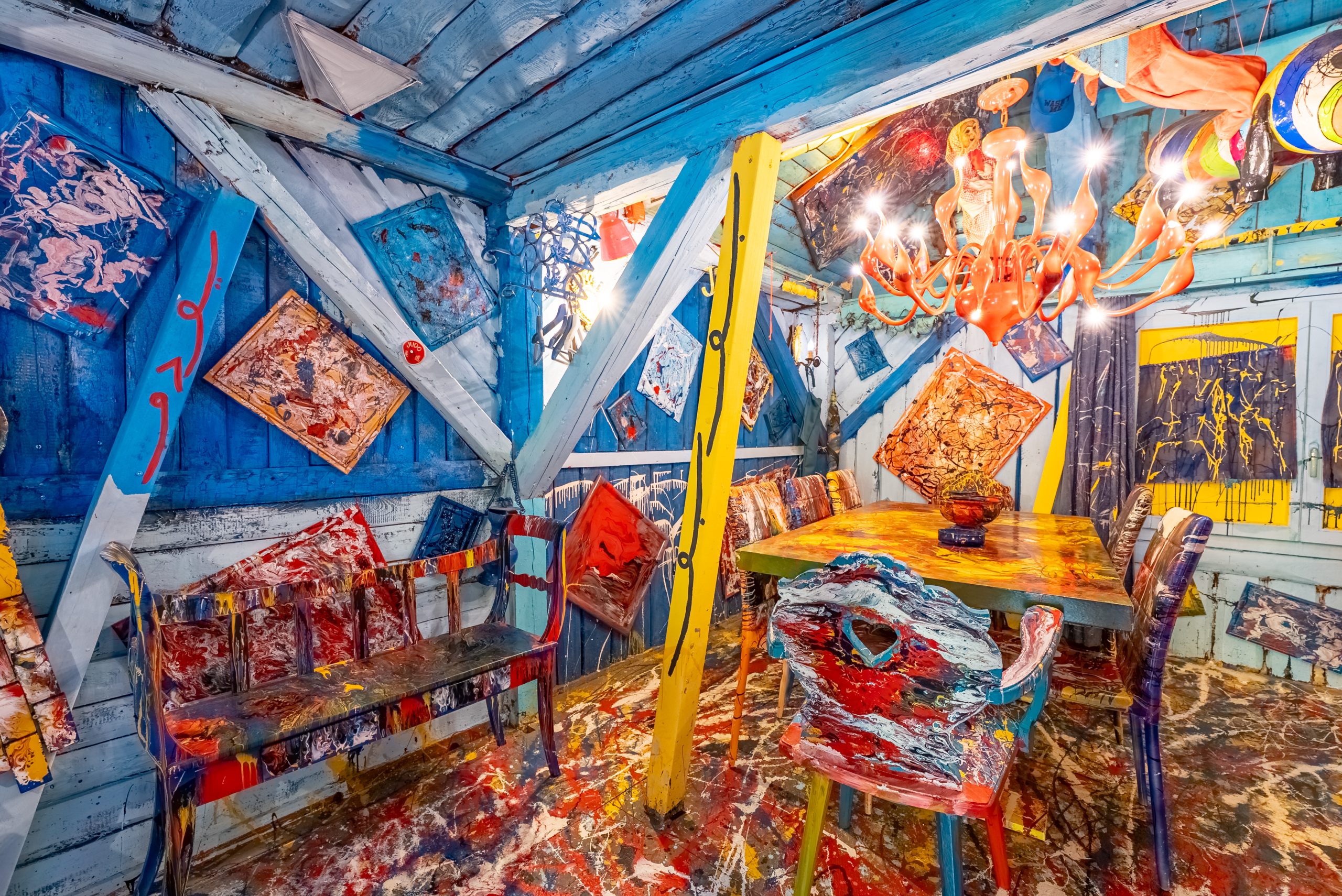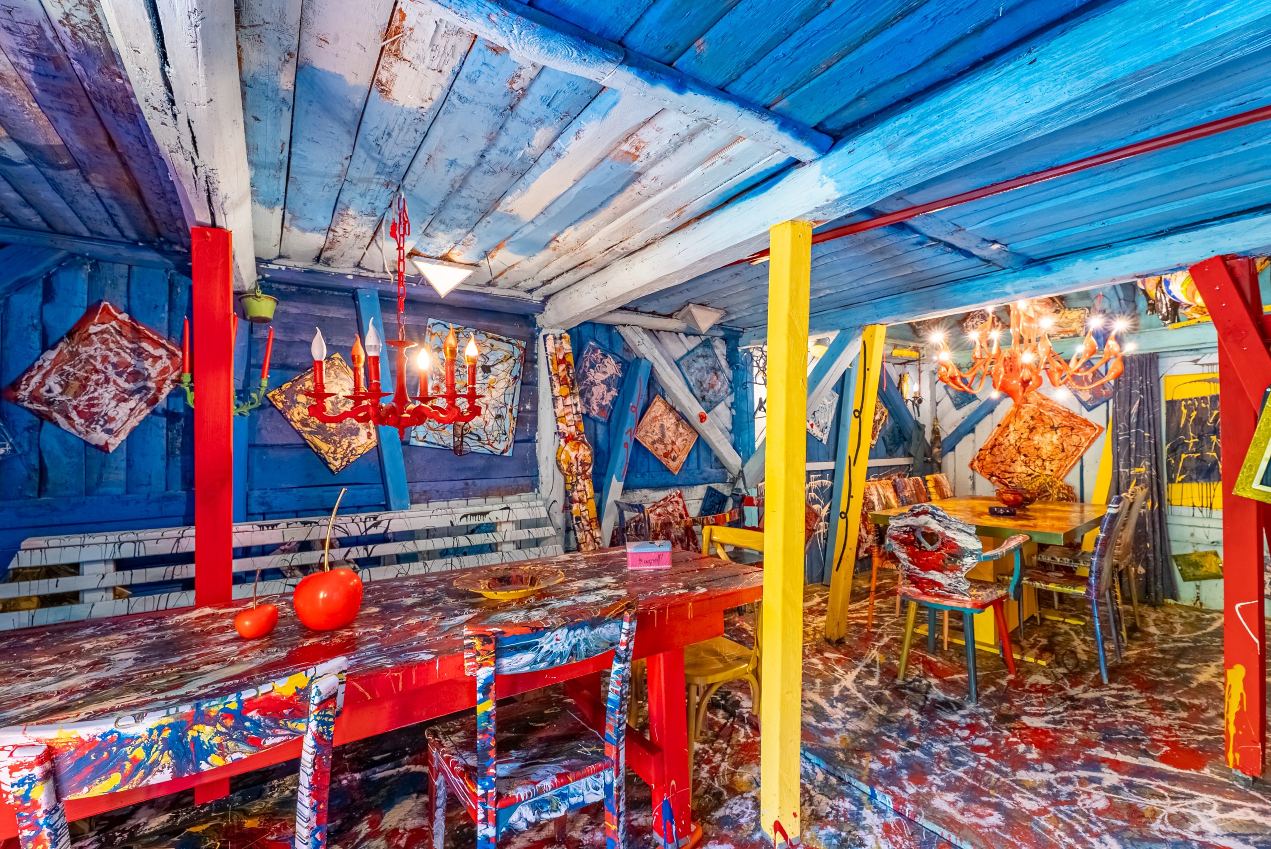 Das Wohnhaus präsentiert sich mit einem Pop-Art-inspirierten Farbkonzept in leuchtendem Gelb und tiefem Blau. Nichts ist zufällig, nichts ist gerade – und genau das macht den Charme aus. Schräge Linien, verspielte Übergänge und bewusst gesetzte Brüche schaffen ein Ambiente, das jeden Raum lebendig macht. Die gelbe Küche bietet genügend Platz für einen Esstisch und lädt zu Gesprächen ein, die genauso bunt sind wie die Umgebung. Im Untergeschoss wartet ein gemütlicher Ess- oder Partyraum, perfekt für lange Abende, gute Musik und Menschen, die das Leben feiern.