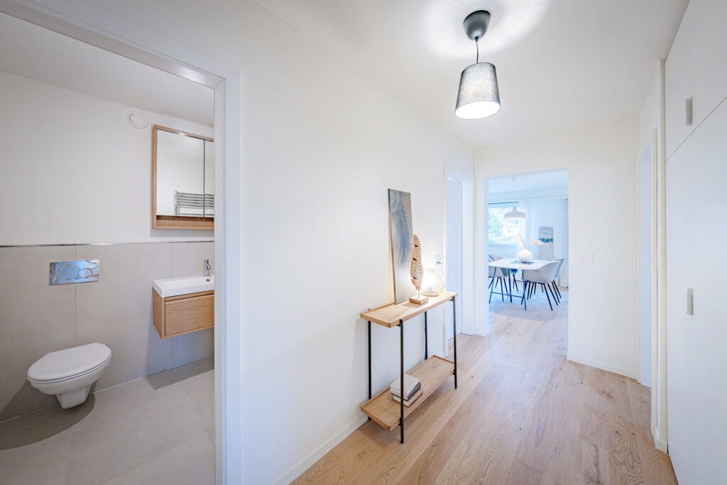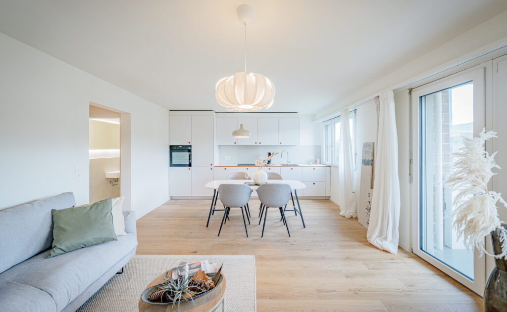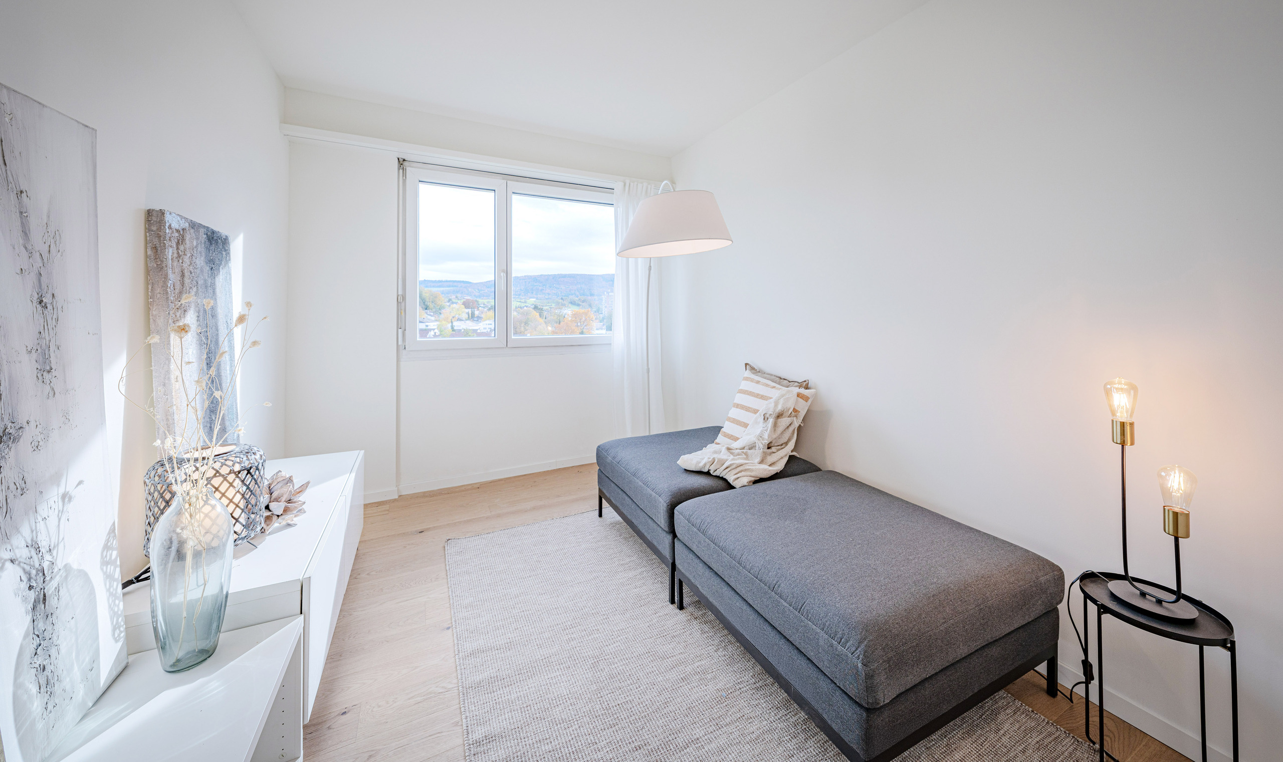 • 80 m² Wohnfläche mit neuem Eichenparkett und glatten, weiss gestrichenen Wänden für ein modernes Wohngefühl