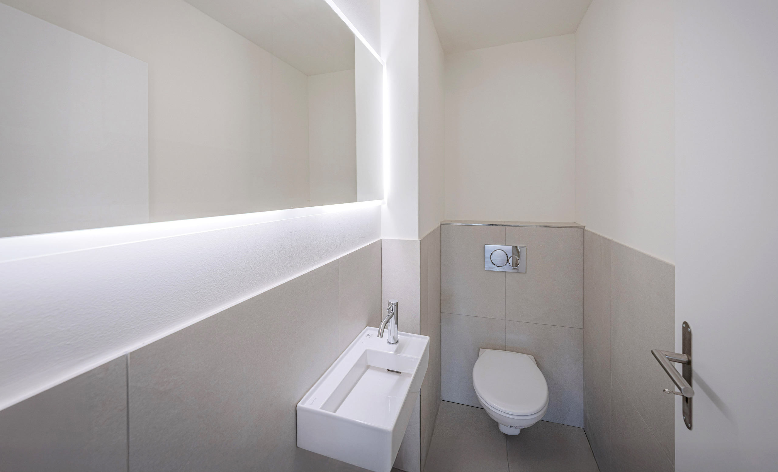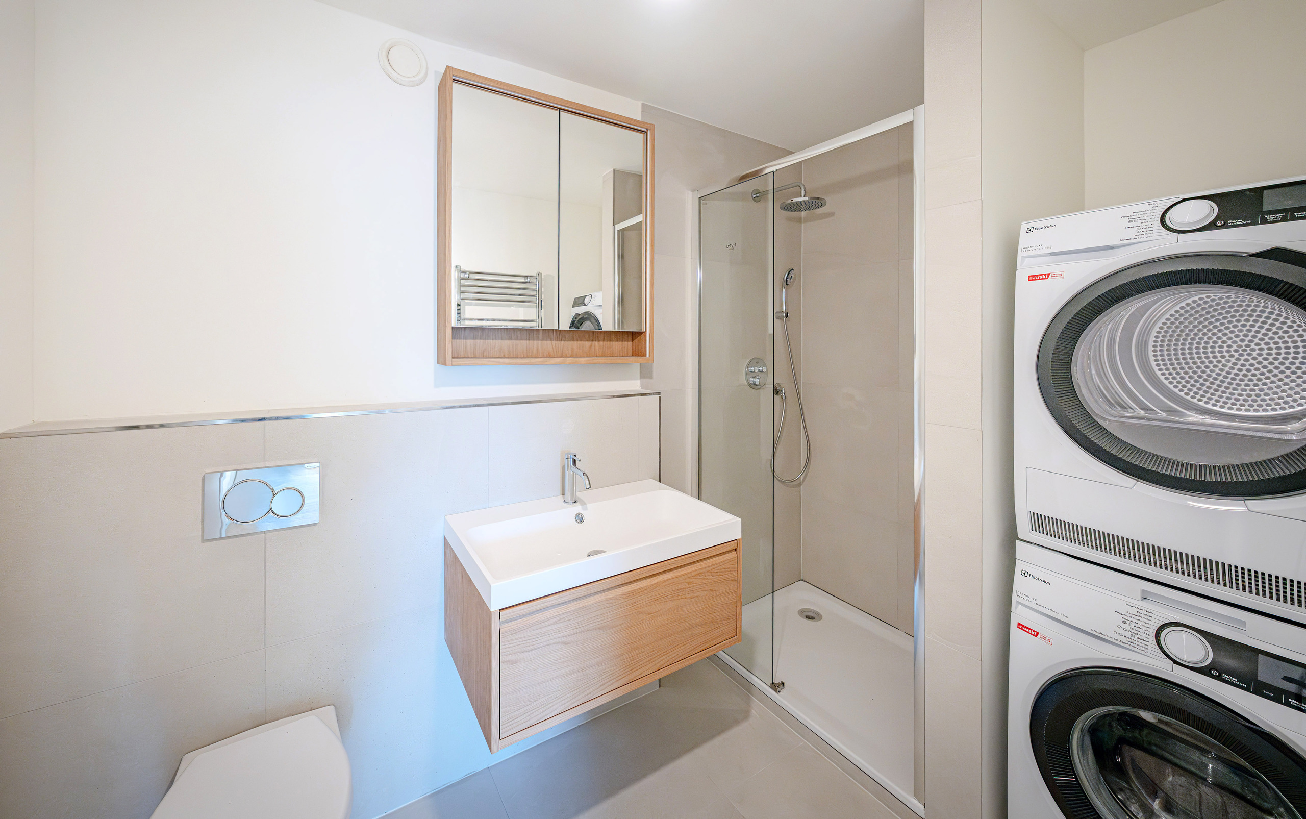 • Zwei komplett erneuerte Nasszellen mit eleganten Feinsteinzeugplatten, grosszügiger Dusche mit Duschglas und neuen Apparaten