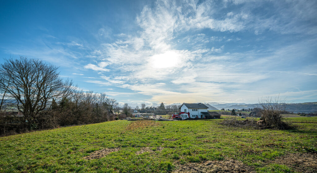In Allmendingen bei Bern entsteht ein Neubauprojekt, das modernen Wohnkomfort mit ländlichem Charme vereint. Anstelle einer maximalen Ausnutzung des Grundstücks wurde bewusst auf eine durchdachte Architektur mit grosszügigen Freiräumen gesetzt. So geniessen die künftigen Bewohner nicht nur viel Platz, sondern auch eine beeindruckende Aussicht auf die Voralpen und Alpen.