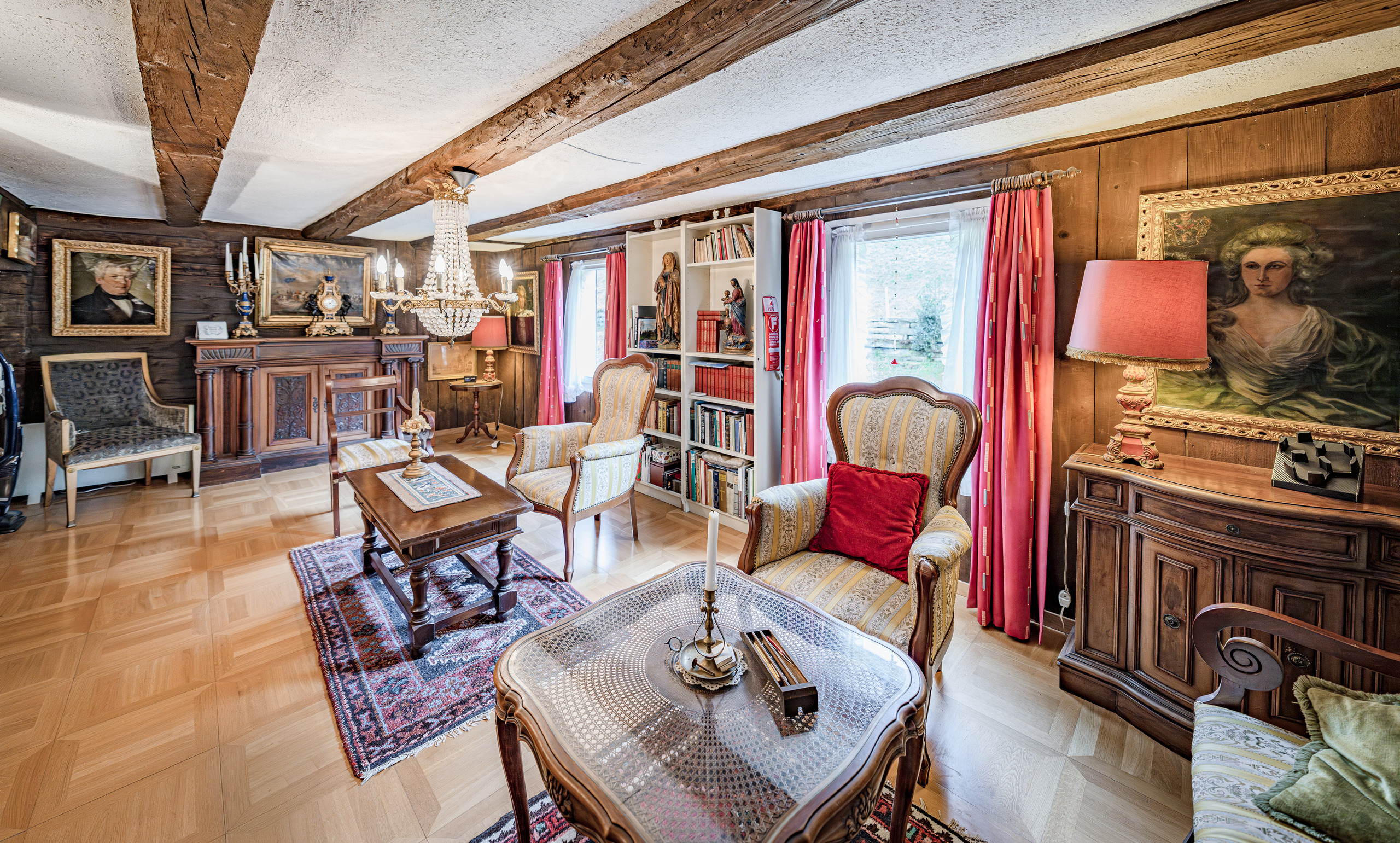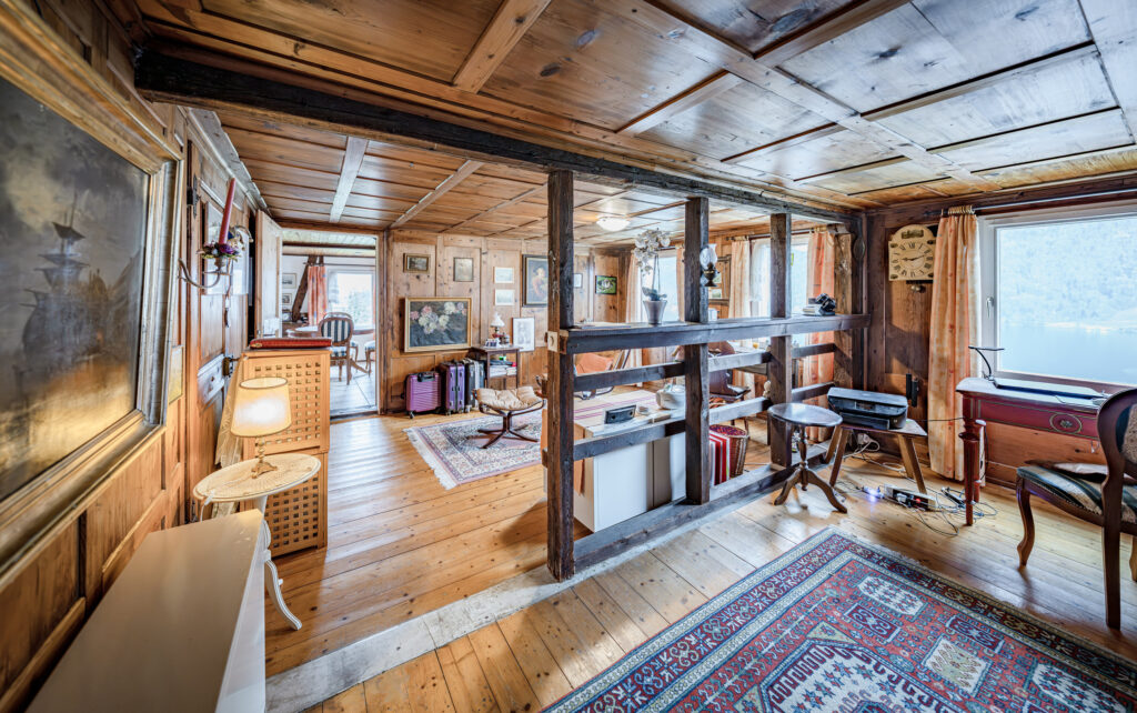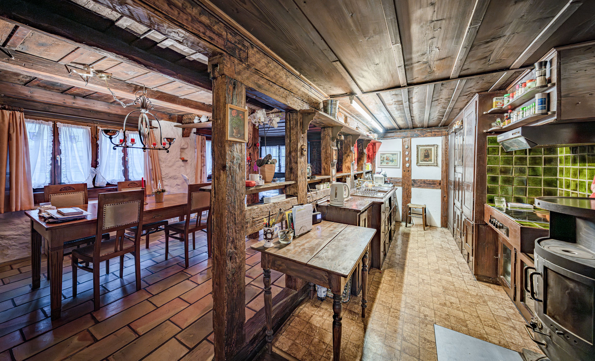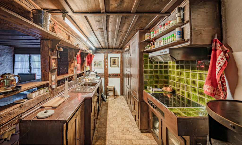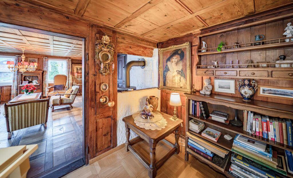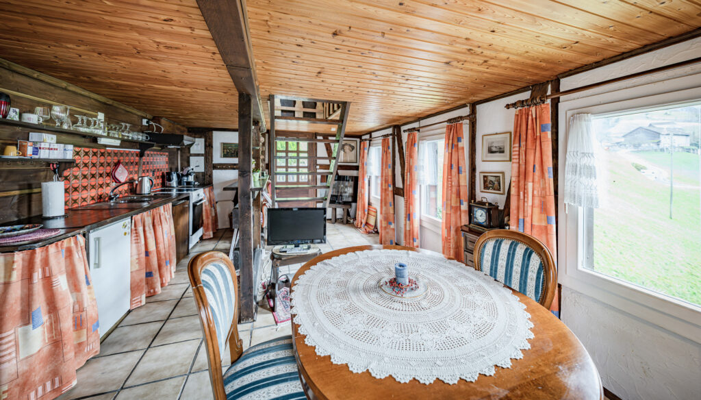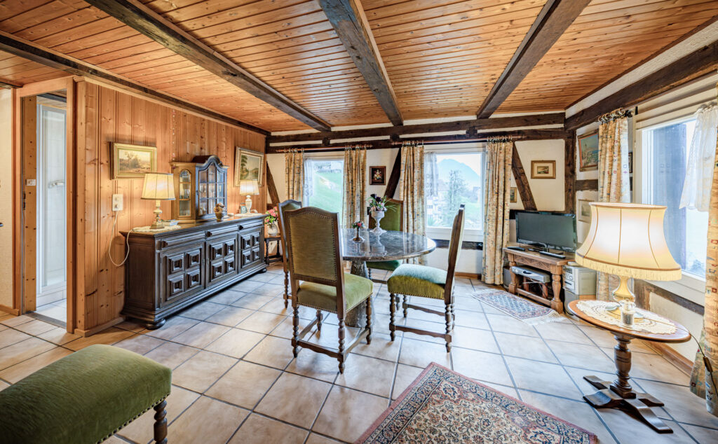 Die Liegenschaft präsentiert sich in typischer Innerschweizer Bauweise mit massivem Naturstein-Fundament und darauf aufgebautem Riegelbau. Im Inneren prägen sichtbare Balken, rustikales Mauerwerk und mehrere Holzöfen das wohnliche Ambiente. Verschiedene Wohn- und Essbereiche mit Schweden- und Trittofen schaffen eine warme, einladende Atmosphäre.
