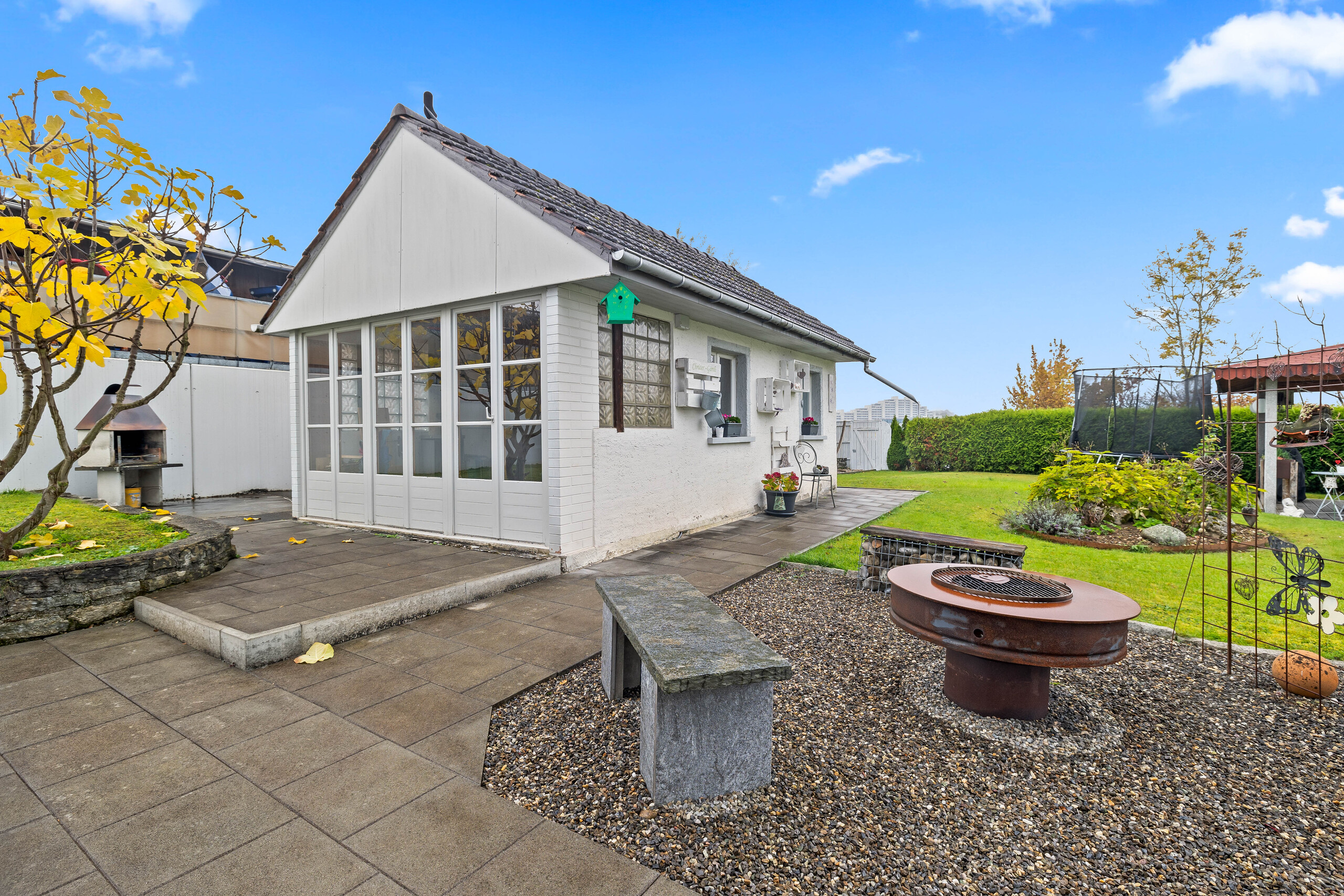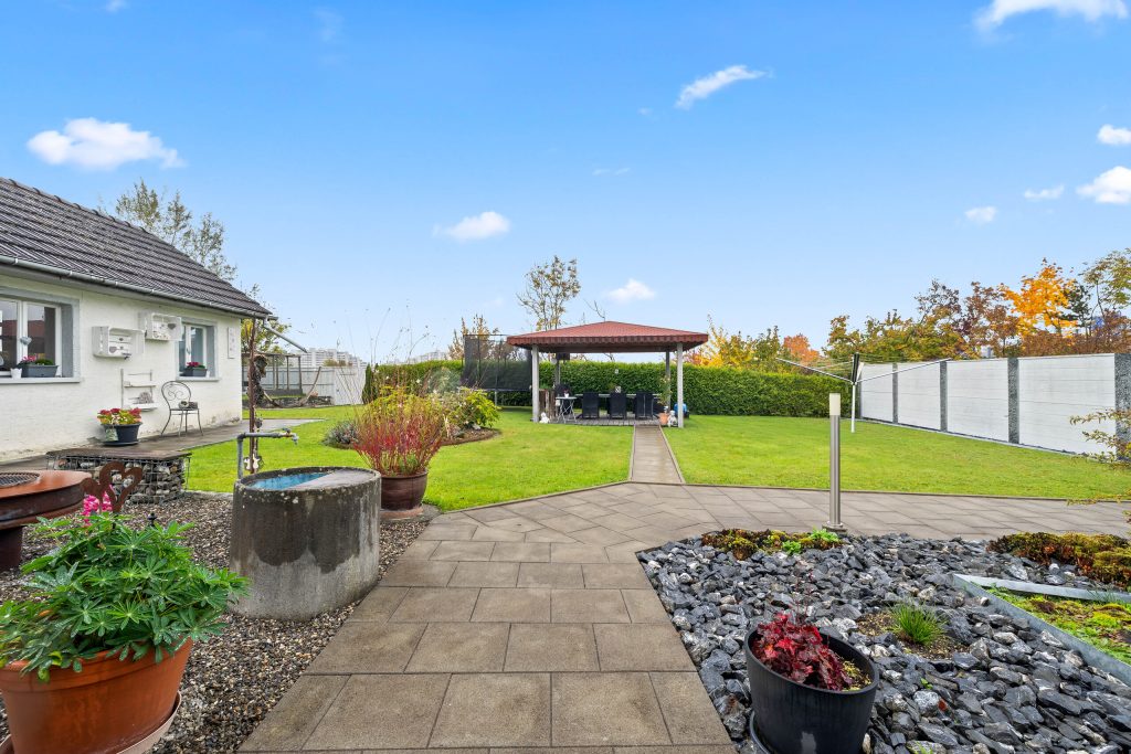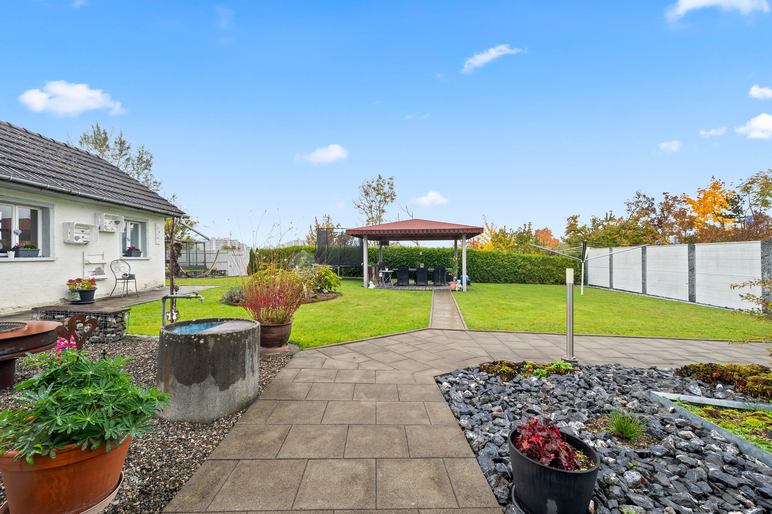 Richtig beeindruckend ist der Garten. Hier lässt sich der Alltag wunderbar ausblenden: Biotop, Grillstelle, Rasenflächen und eine Pergola schaffen eine vielseitige Umgebung zum Geniessen. Das besondere Highlight bildet das stilvolle Garten- bzw. Saunahaus. Ausgestattet mit Schwedenofen, Essecke und Dusche eignet es sich perfekt als Rückzugsort, Atelier oder Ort für entspannte Abende mit Freunden.