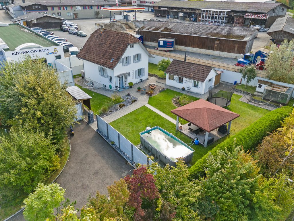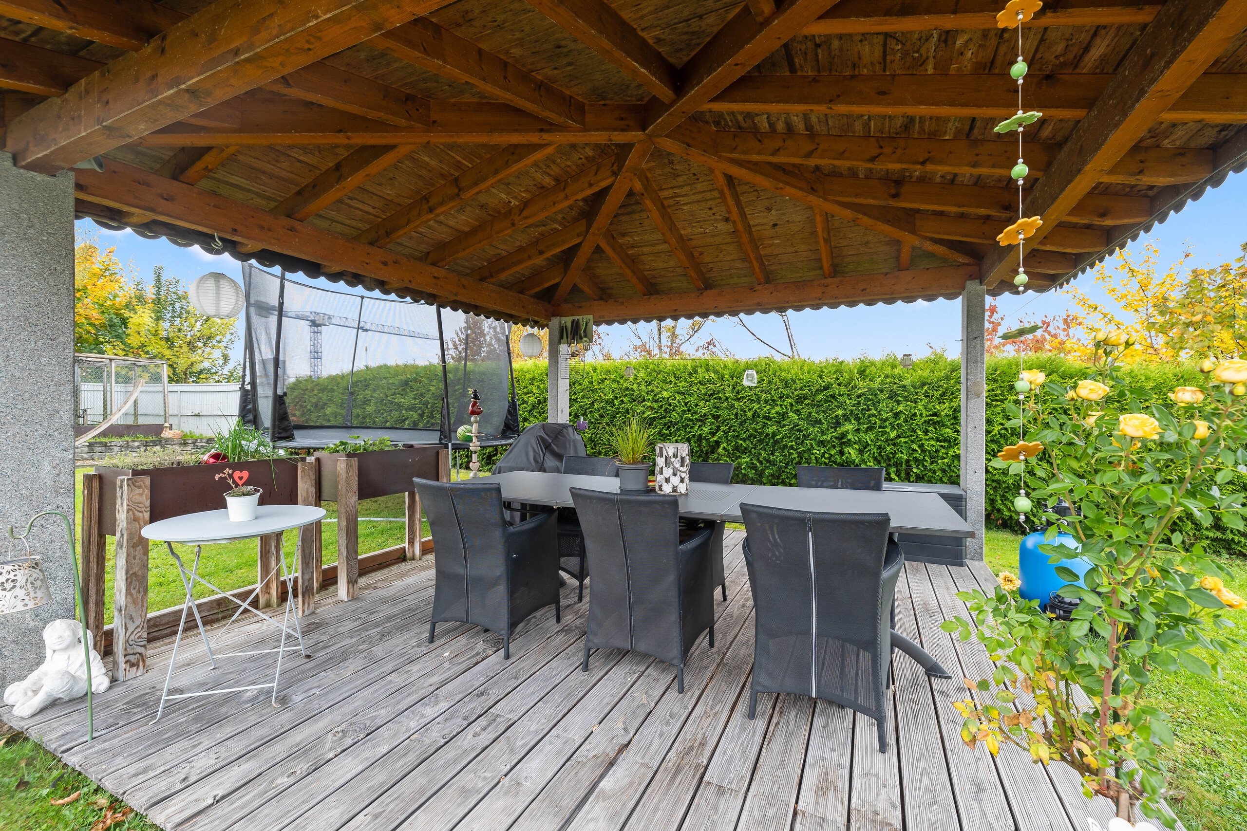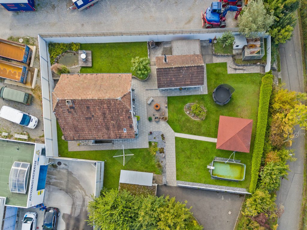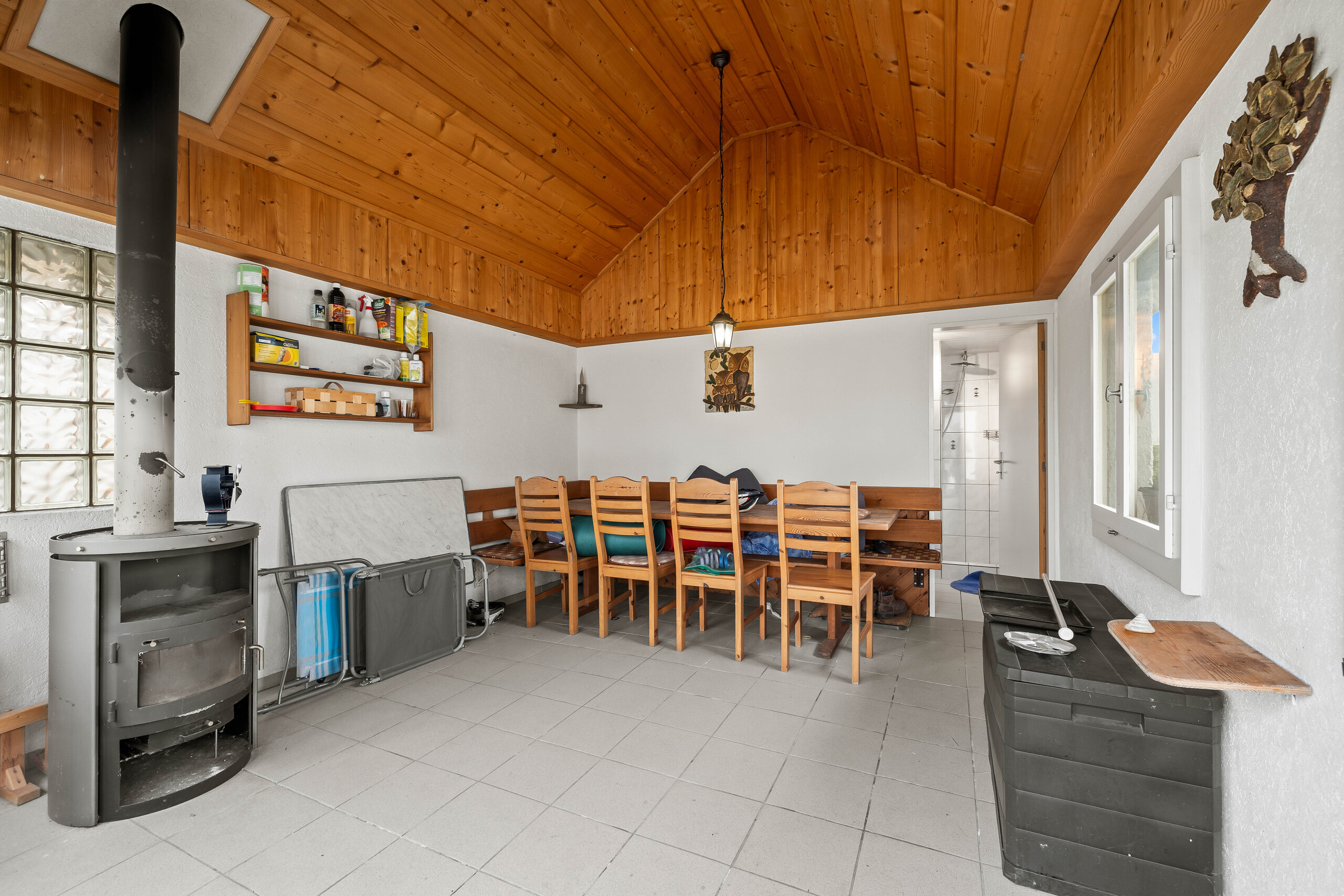 Richtig beeindruckend ist der Garten. Hier lässt sich der Alltag wunderbar ausblenden: Biotop, Grillstelle, Rasenflächen und eine Pergola schaffen eine vielseitige Umgebung zum Geniessen. Das besondere Highlight bildet das stilvolle Garten- bzw. Saunahaus. Ausgestattet mit Schwedenofen, Essecke und Dusche eignet es sich perfekt als Rückzugsort, Atelier oder Ort für entspannte Abende mit Freunden.