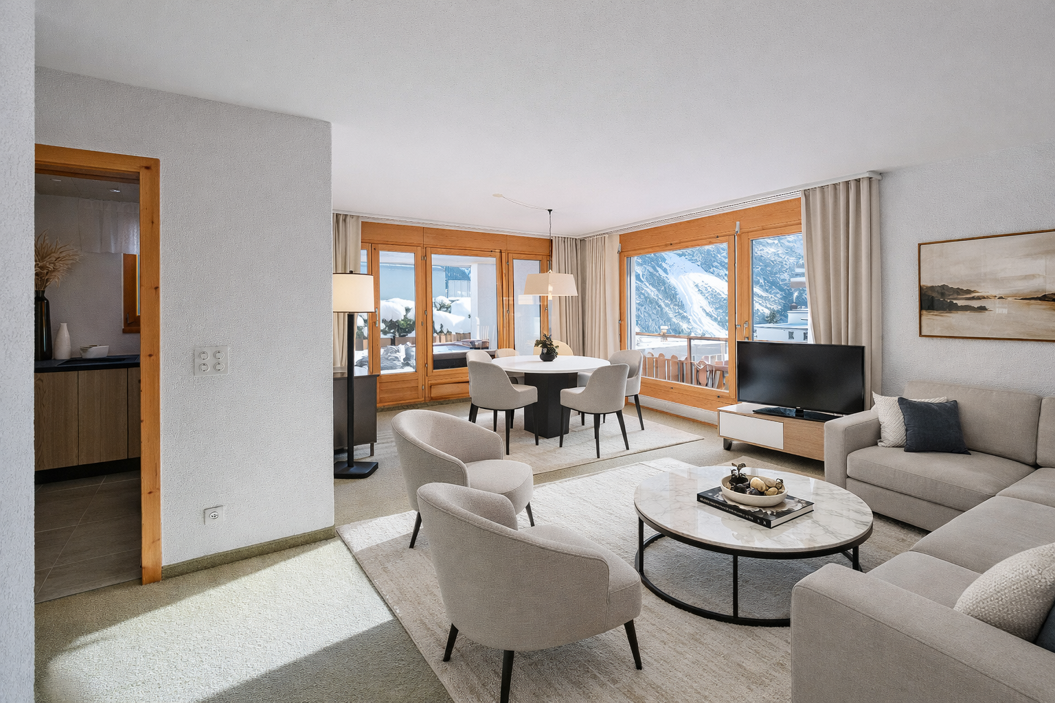 Das Platzangebot umfasst rund 74 m² Gesamtnutzfläche, ergänzt durch eine aussergewöhnlich grosszügige Balkon- und Terrassenfläche von insgesamt ca. 48 m². Hier geniessen Sie Sonne, Ruhe und einen unverbaubaren Blick auf die umliegende Bergwelt – zu jeder Jahreszeit.