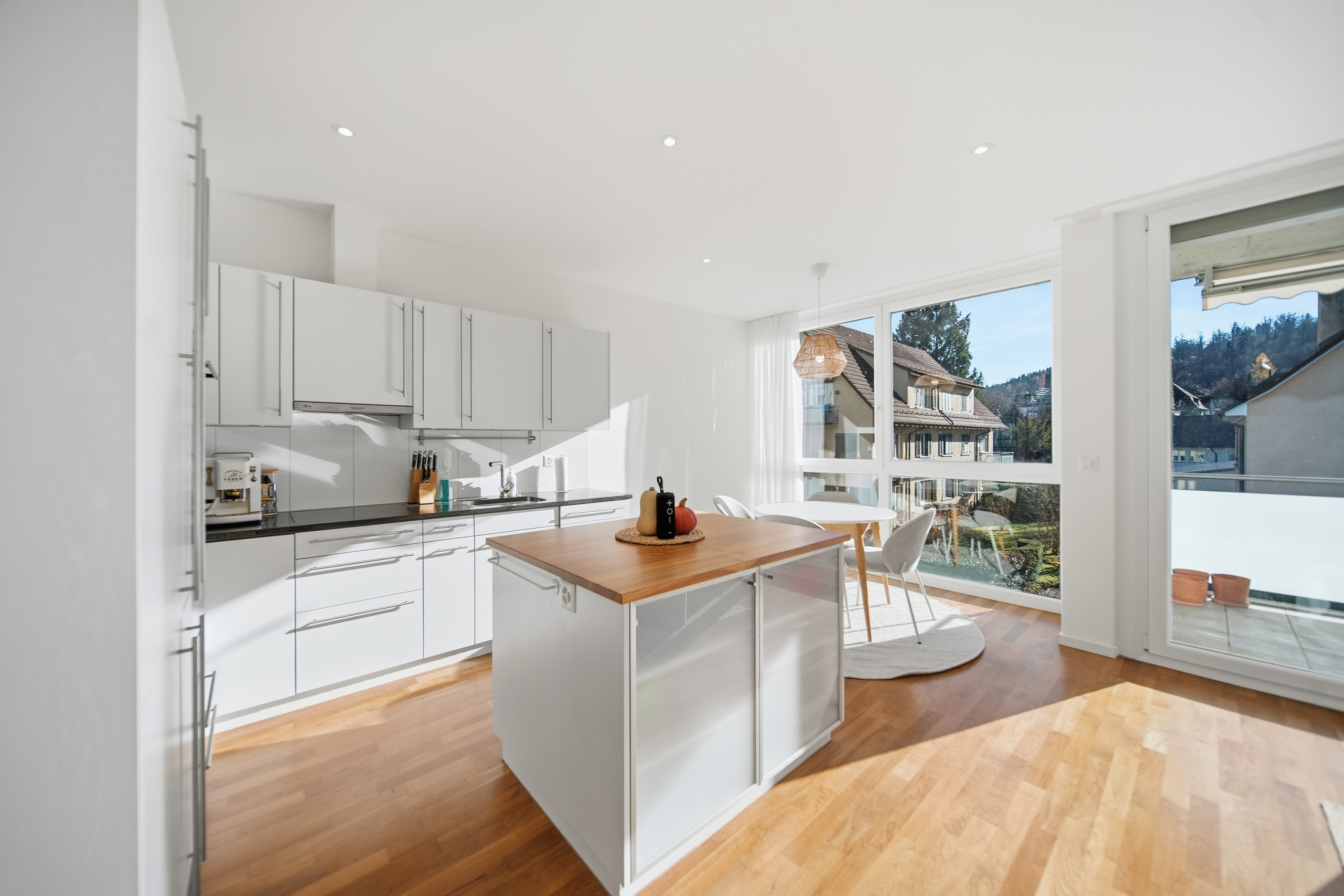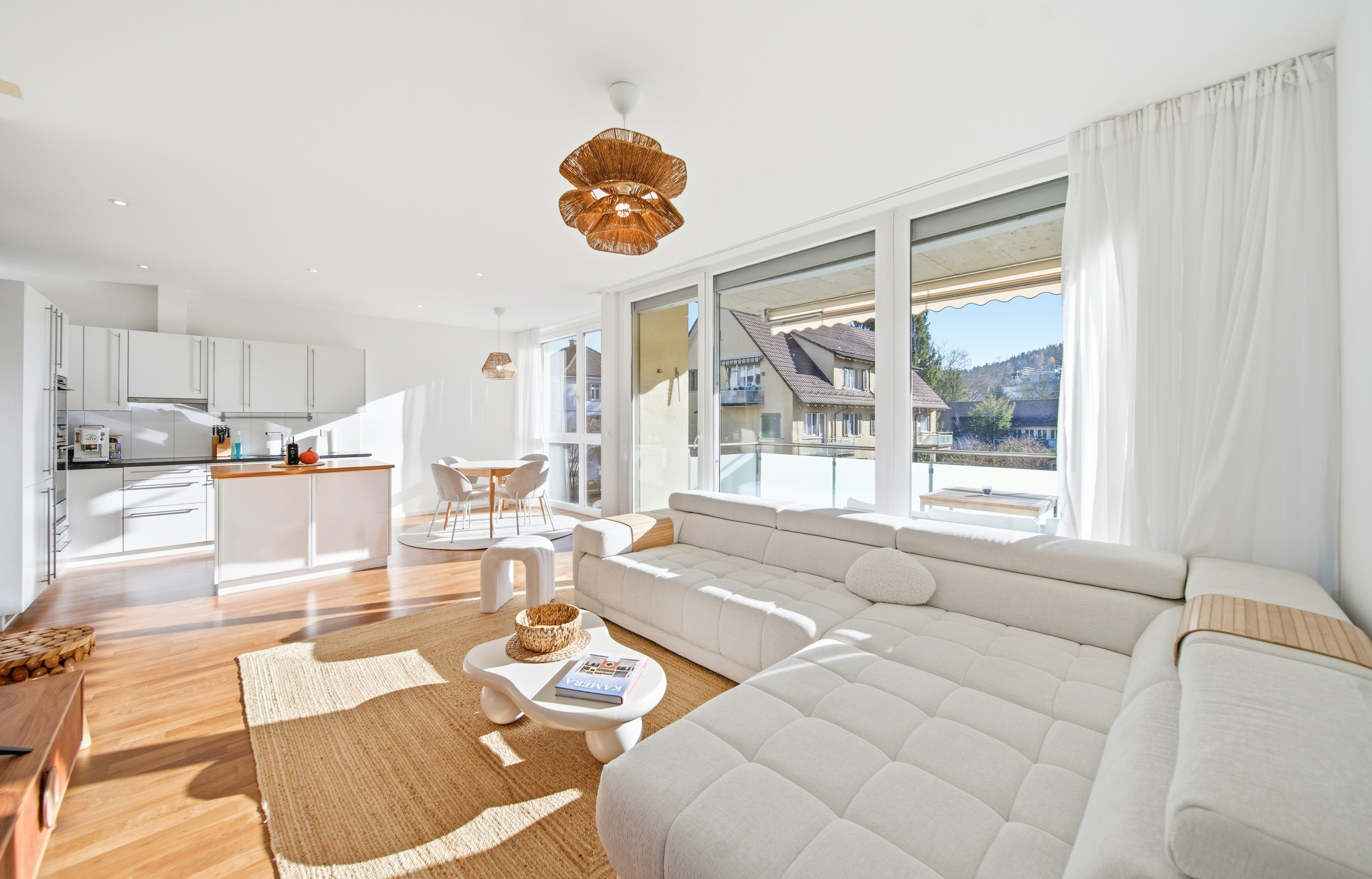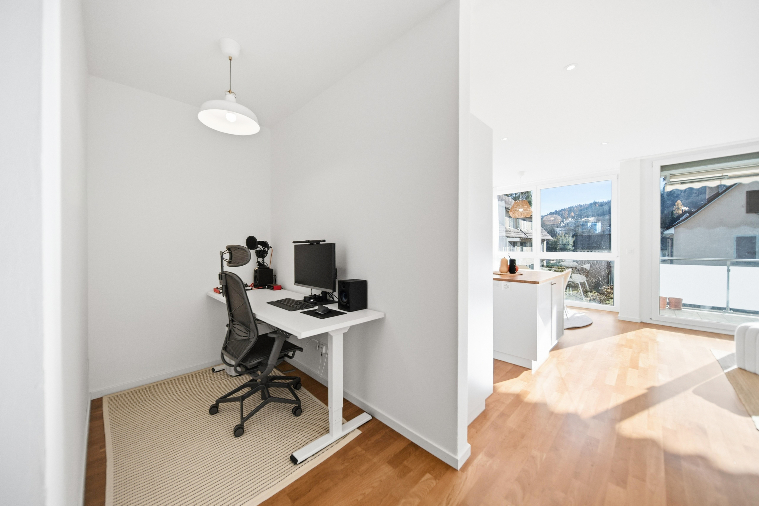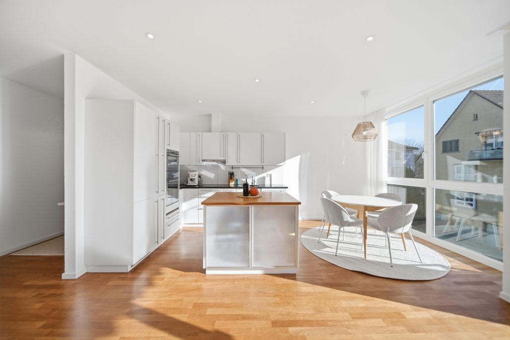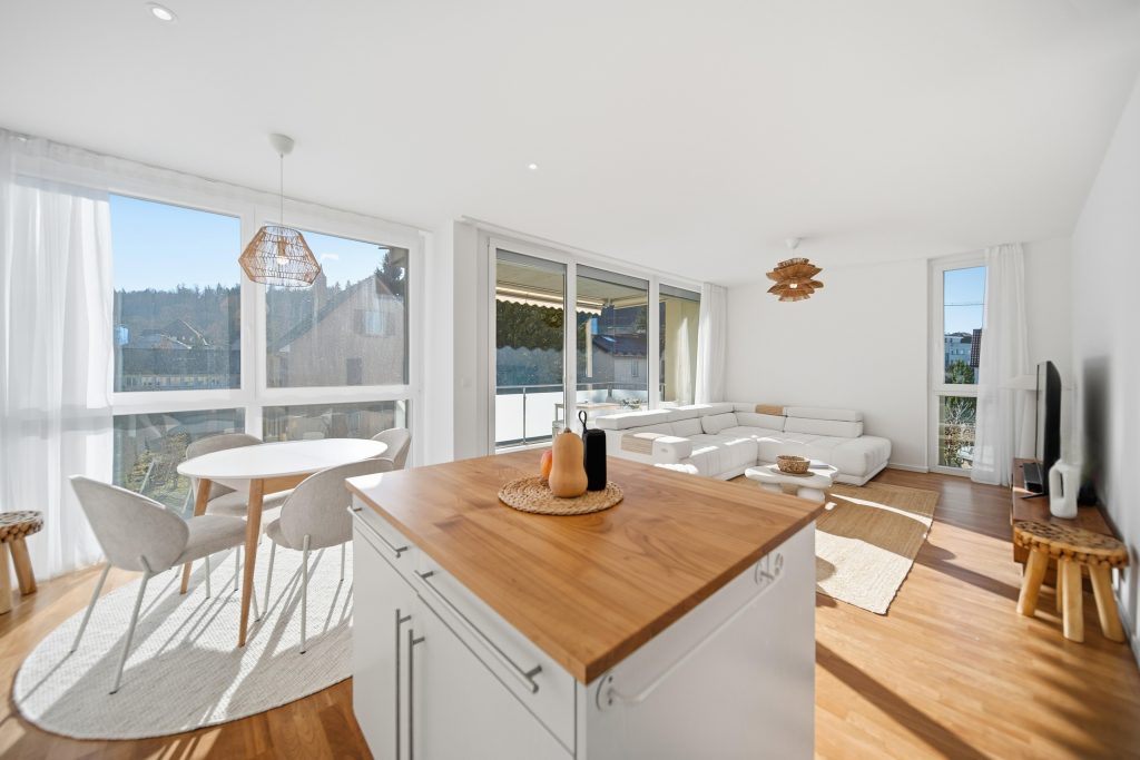 Der Wohn- und Essbereich ist dank grosszügiger Fensterfronten lichtdurchflutet und bildet den natürlichen Mittelpunkt der Wohnung. Die offene, modern ausgestattete Wohnküche mit Kücheninsel lädt zum Kochen, Verweilen und Zusammensein ein. Clever integrierte Nischen bieten Platz für ein Homeoffice oder praktische Stauraumlösungen, ohne den Wohnraum zu dominieren.