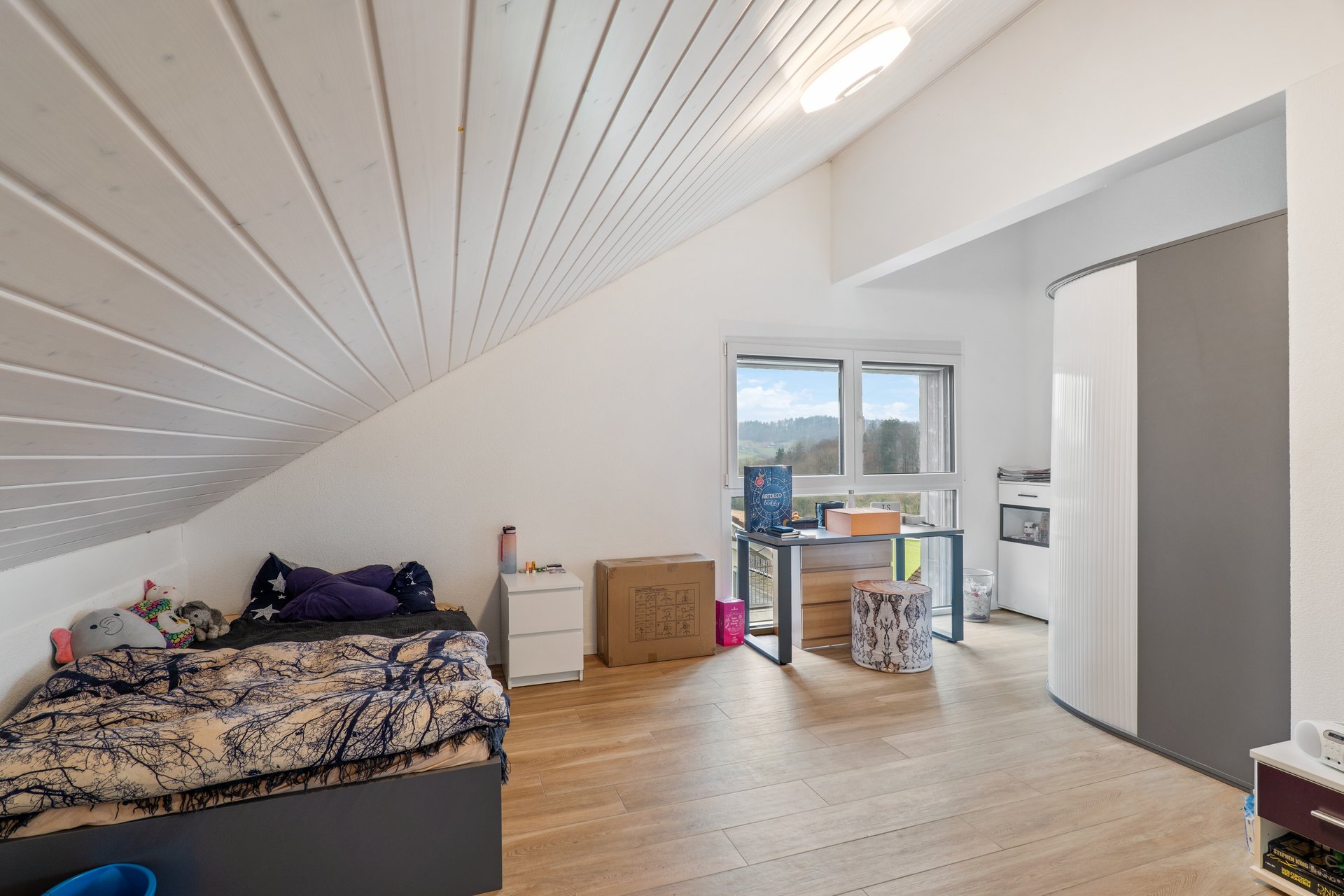 Auf rund 119 m² Wohnfläche entfaltet sich ein grosszügiges Raumgefühl, das besonders durch die beeindruckende Raumhöhe in der Dachschräge geprägt ist. Der helle und grosszügig ausgemessene Wohnbereich bildet das Herz der Wohnung und bietet direkten Zugang zum gedeckten Balkon. Von hier aus geniessen Sie einen schönen Weitblick – ideal für entspannte Stunden im Freien.
