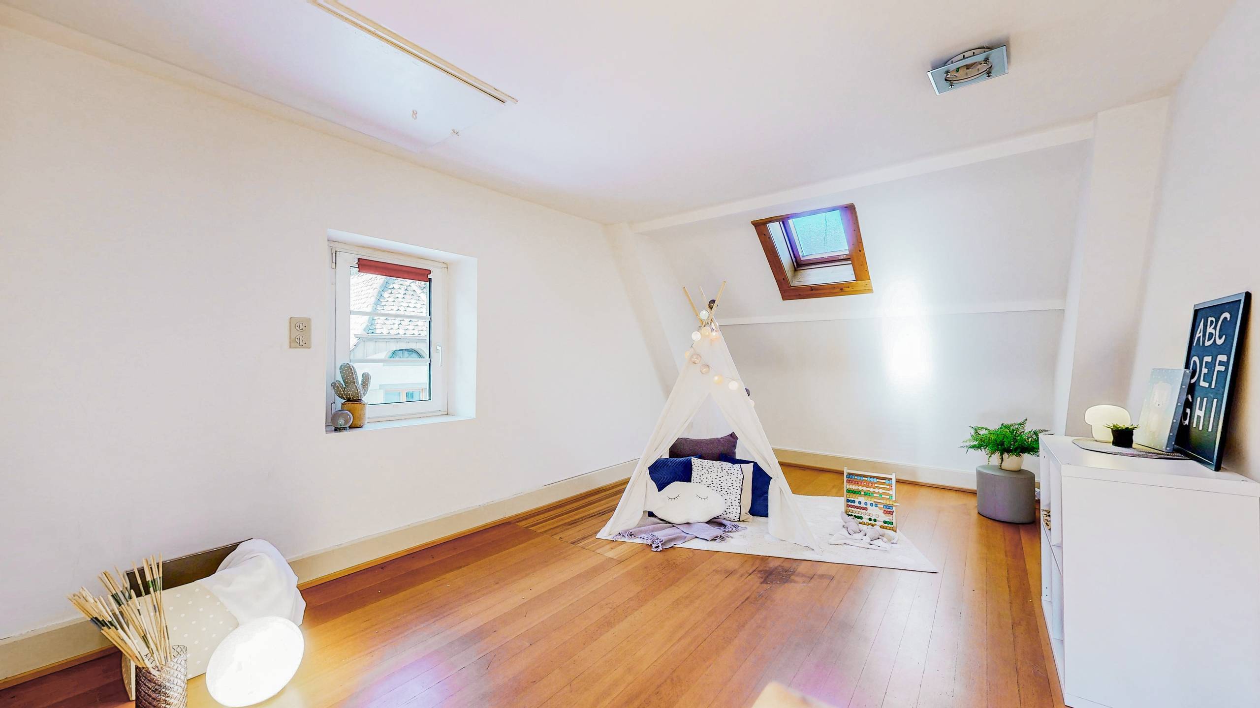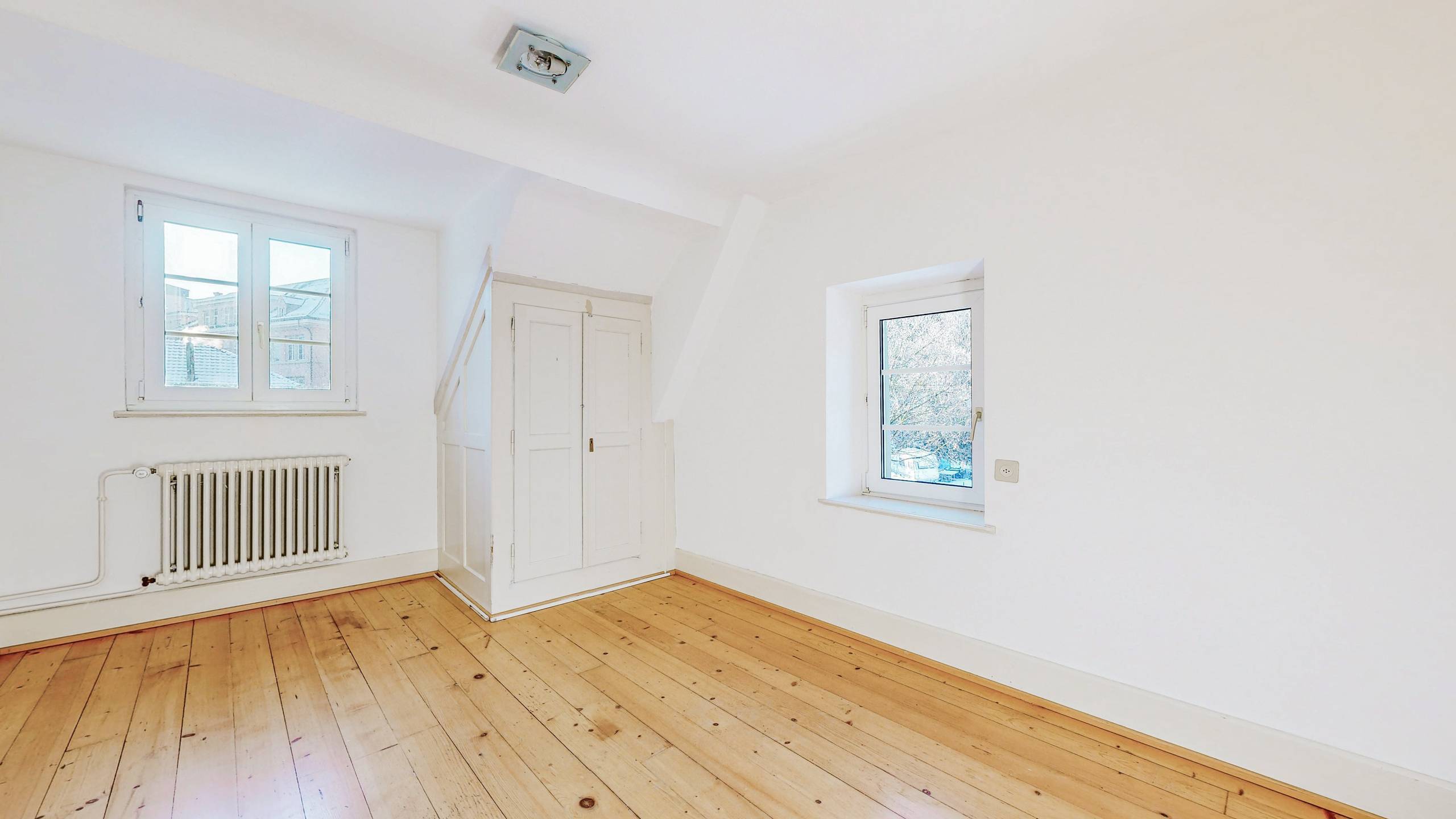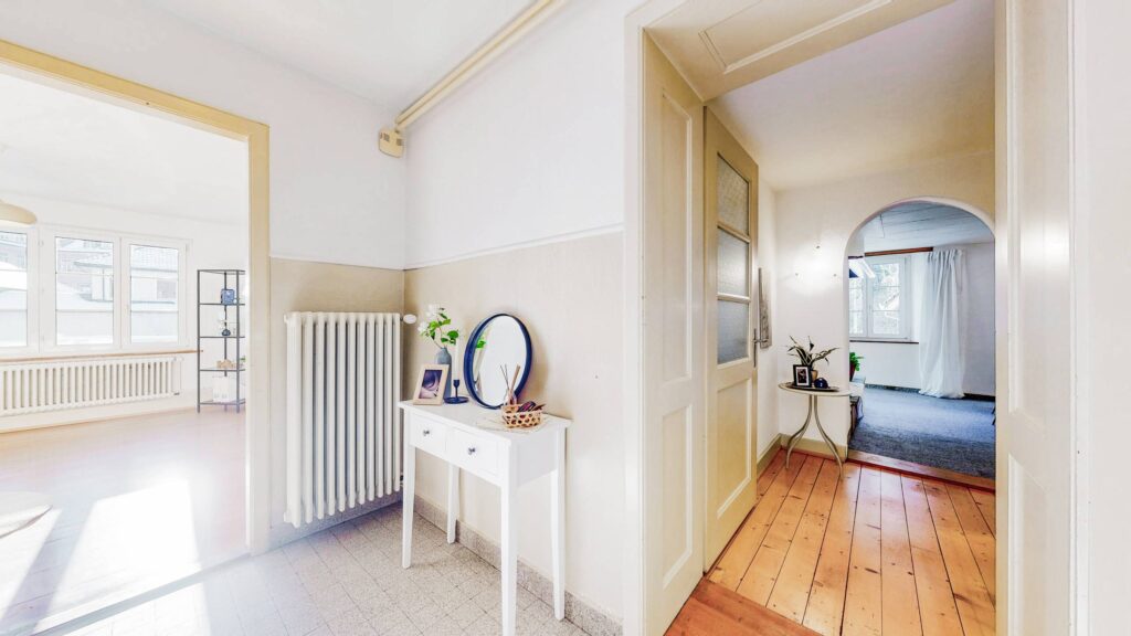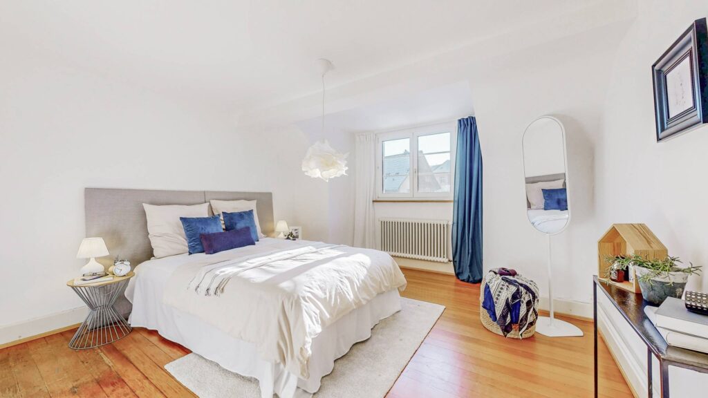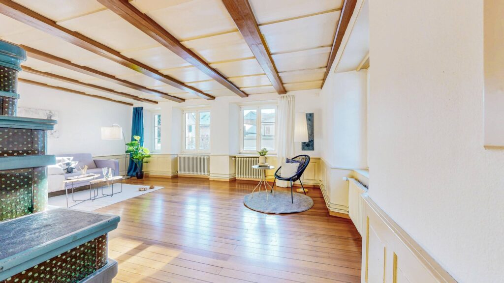 Im Ober- und Dachgeschoss erstreckt sich eine 9 Zimmer Wohnung mit 177 m² Wohnfläche über zwei Etagen.