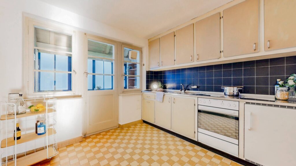 Ein grosszügiges Wohnzimmer mit Trittofen, eine Küche mit viel Stauraum sowie ein Duschbad/WC sorgen für angenehmen Wohnkomfort. Der Innenausbau mit zahlreichen Holzelementen unterstreicht den Charakter der Liegenschaft.