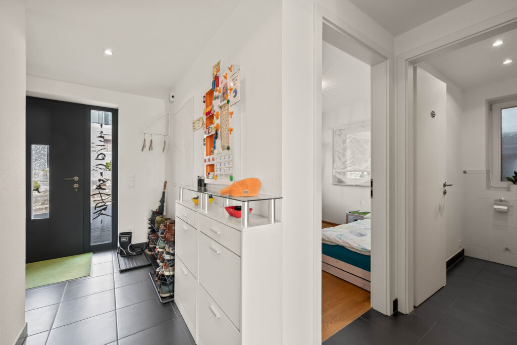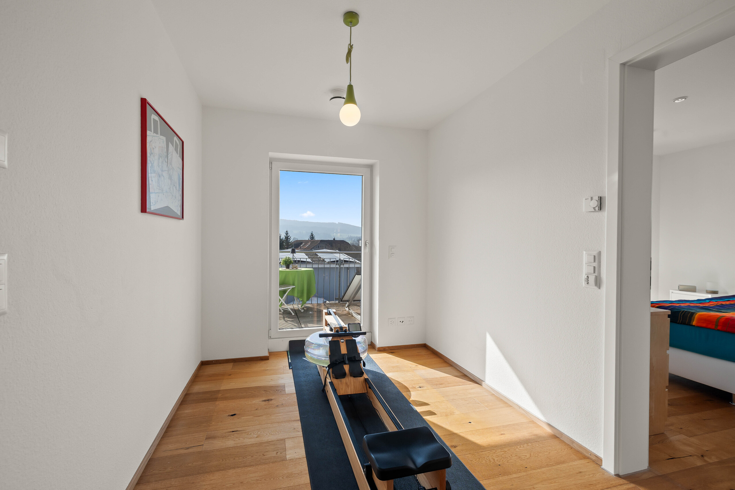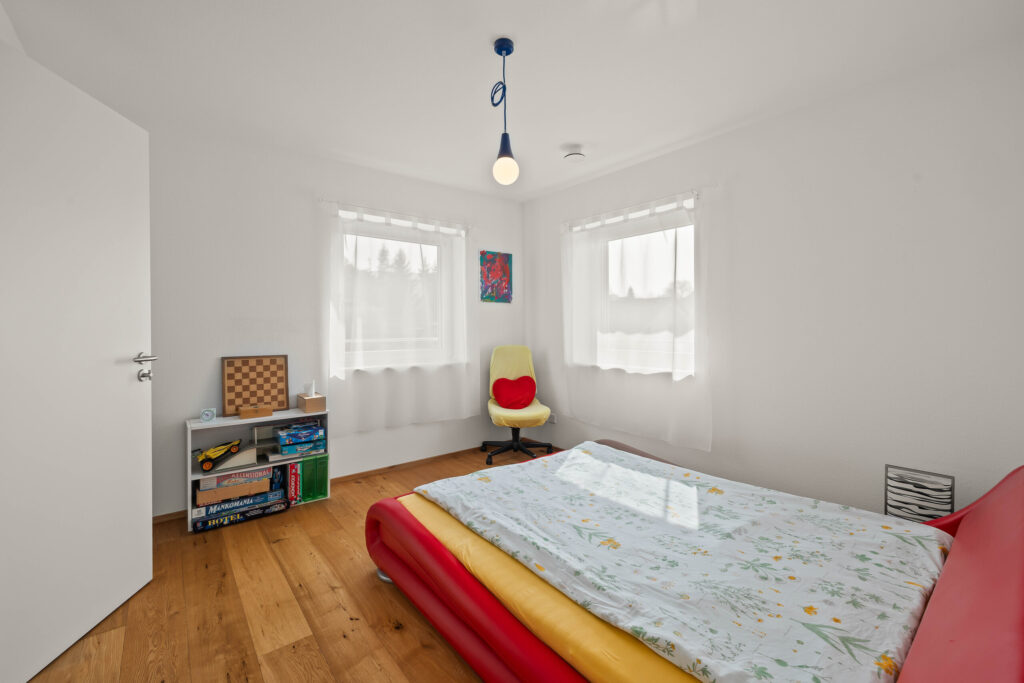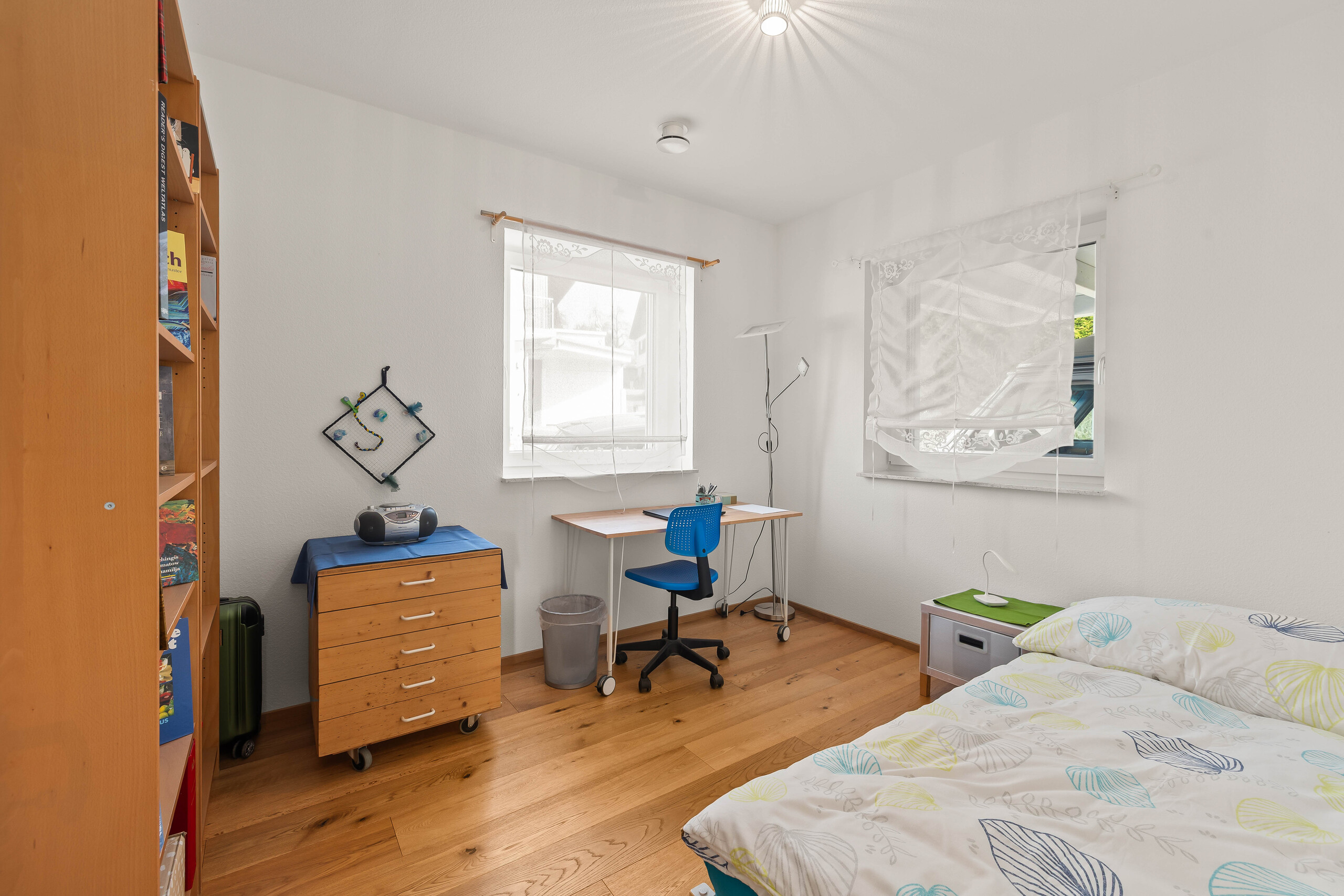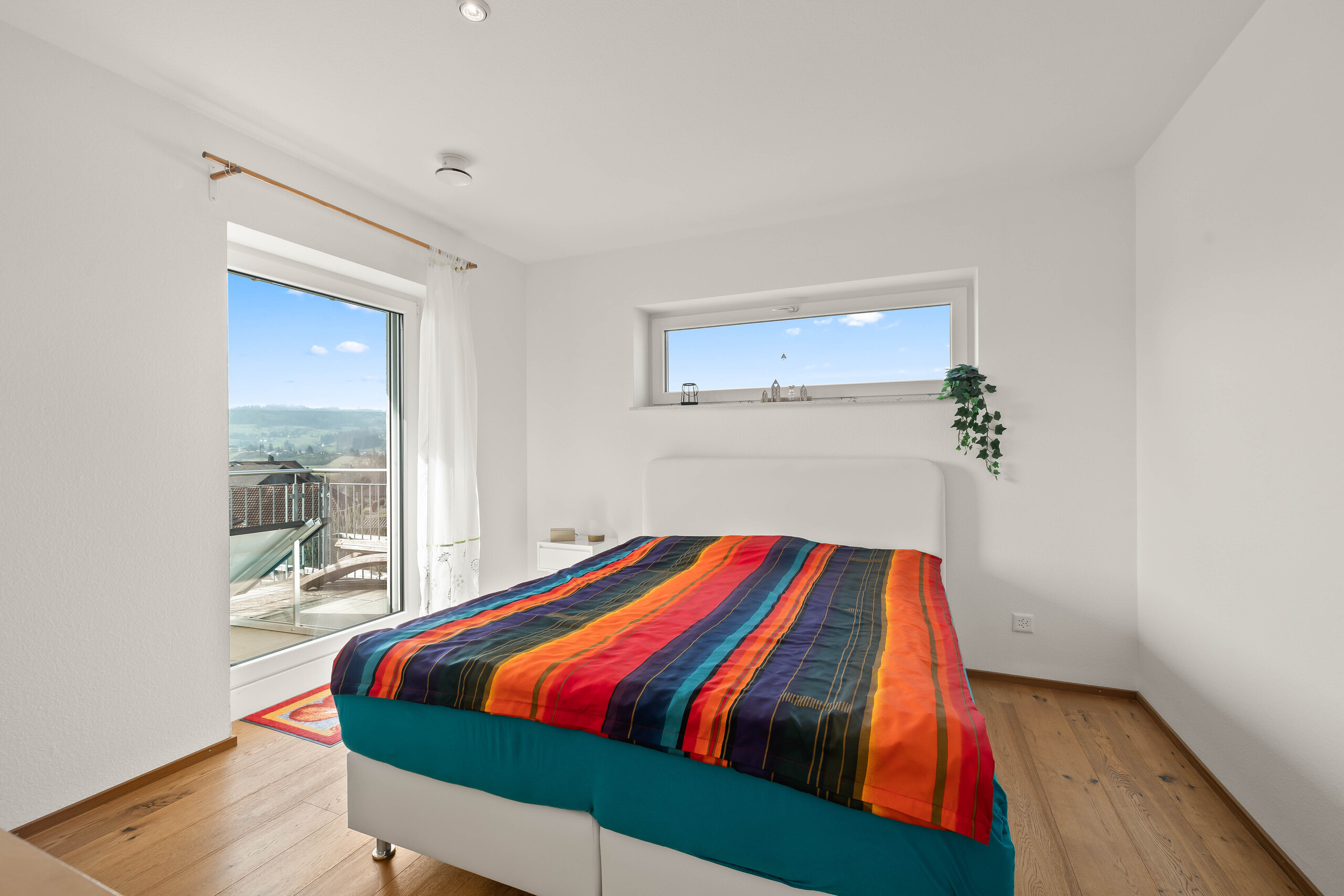 Im Obergeschoss erwartet Sie ein Balkon mit schöner Weitsicht – ein ruhiger Rückzugsort mit Blick ins Grüne. Die Nassbereiche sind hochwertig ausgestattet: Ein grosszügiges Badezimmer mit Badewanne inklusive Sprudelfunktion, Dusche und WC, eine separate Dusche/WC sowie ein zusätzliches Gäste-WC sorgen für Komfort im Alltag.