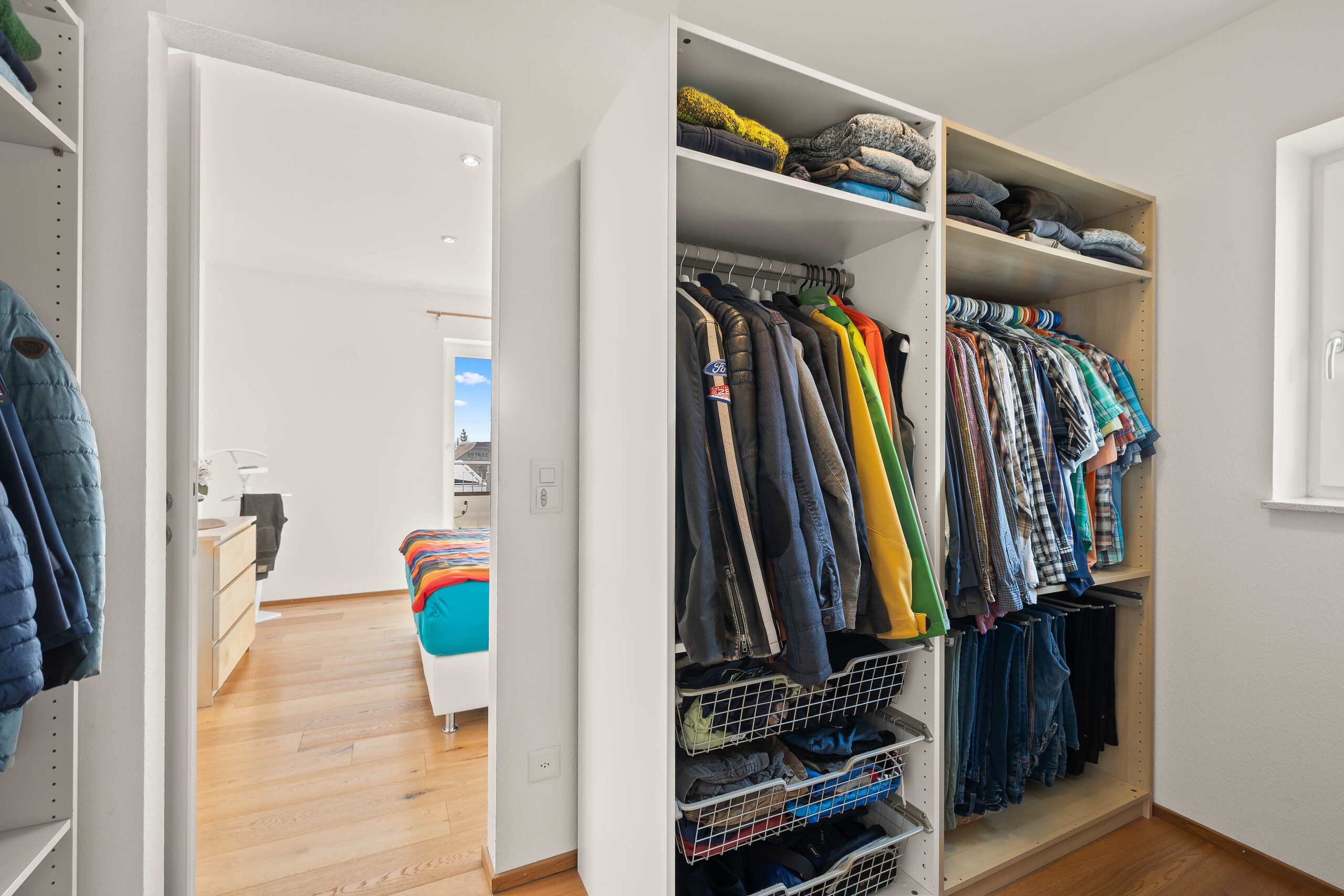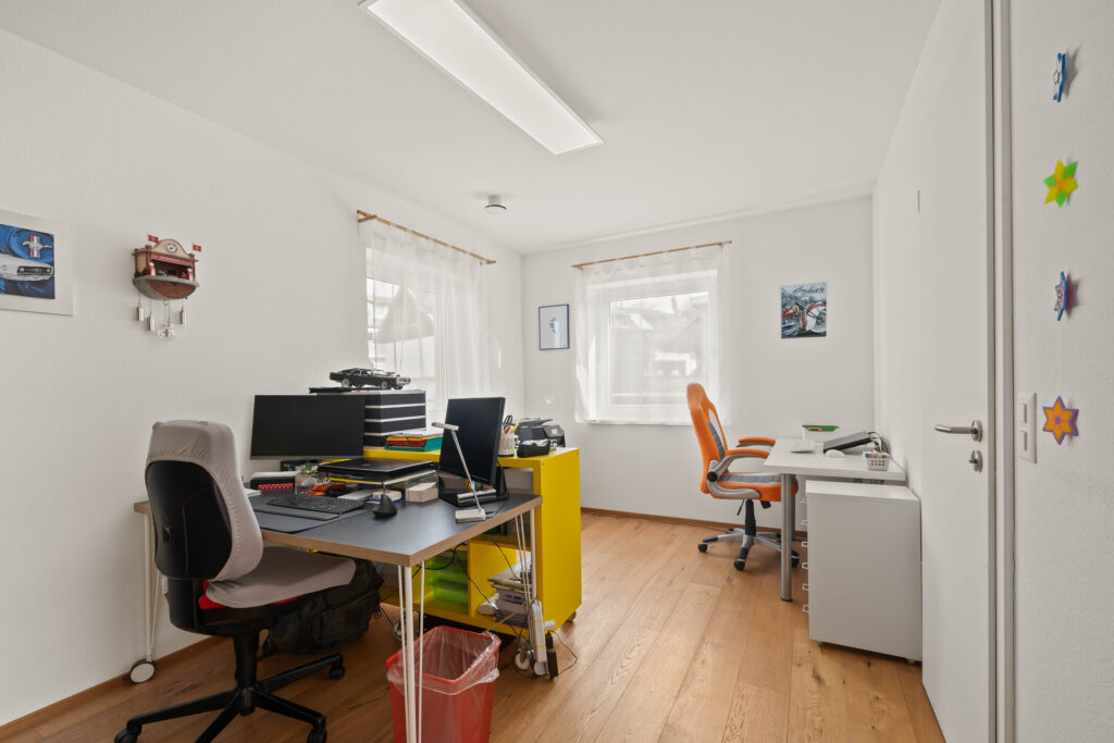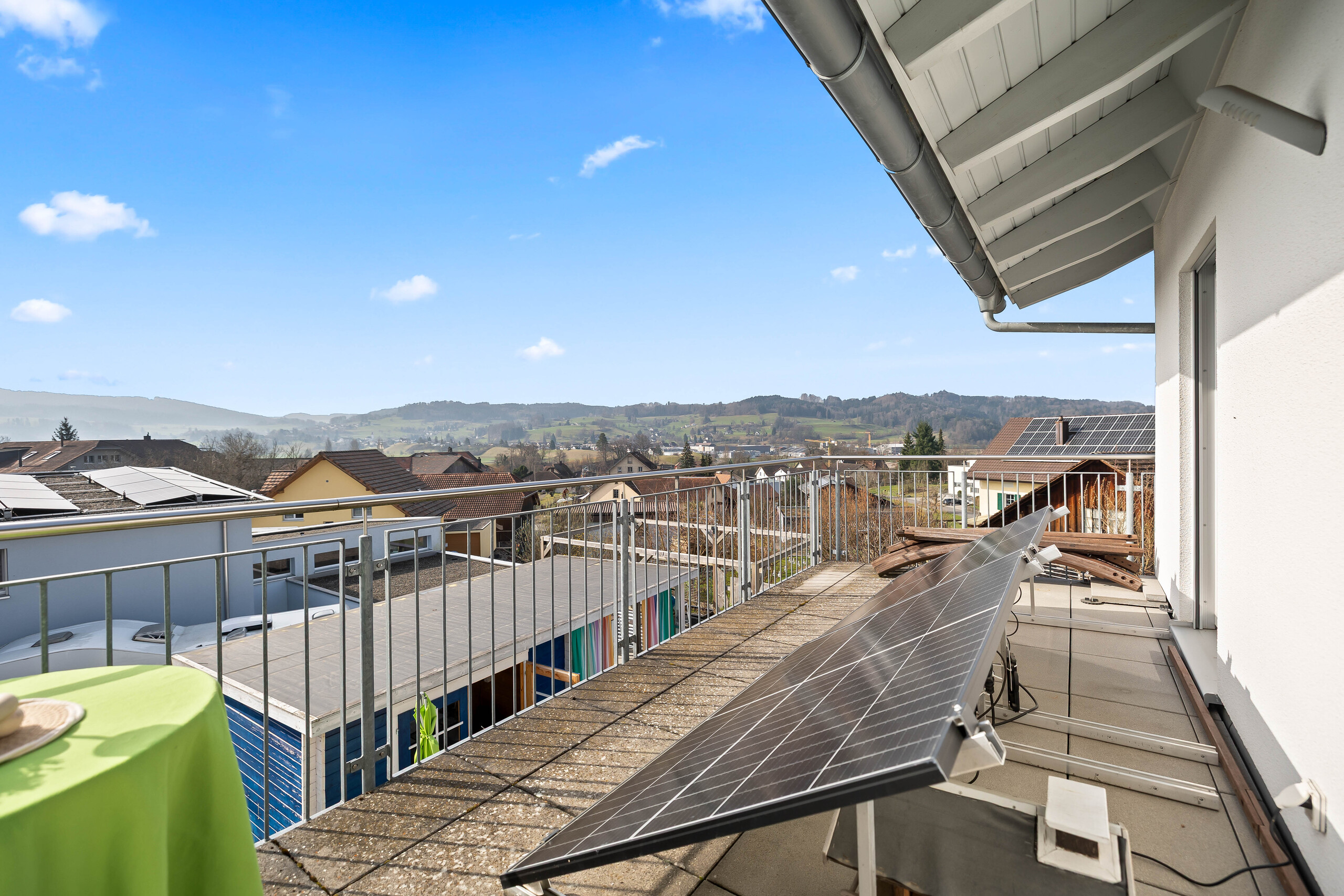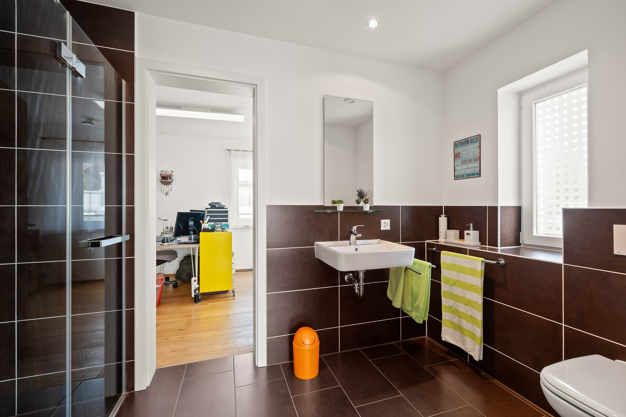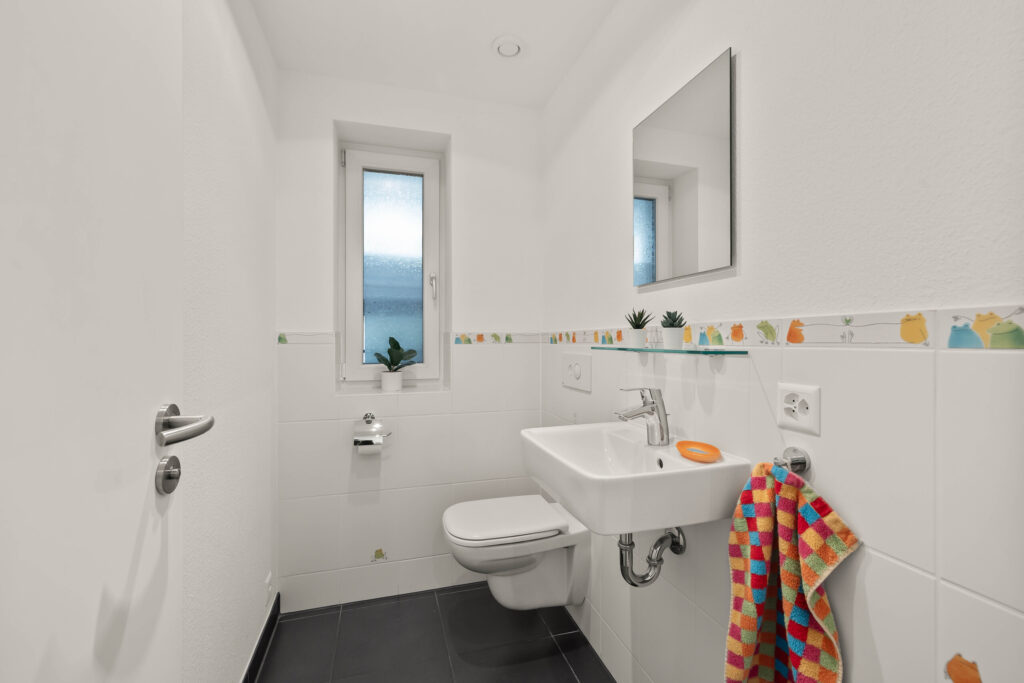 Im Obergeschoss erwartet Sie ein Balkon mit schöner Weitsicht – ein ruhiger Rückzugsort mit Blick ins Grüne. Die Nassbereiche sind hochwertig ausgestattet: Ein grosszügiges Badezimmer mit Badewanne inklusive Sprudelfunktion, Dusche und WC, eine separate Dusche/WC sowie ein zusätzliches Gäste-WC sorgen für Komfort im Alltag.