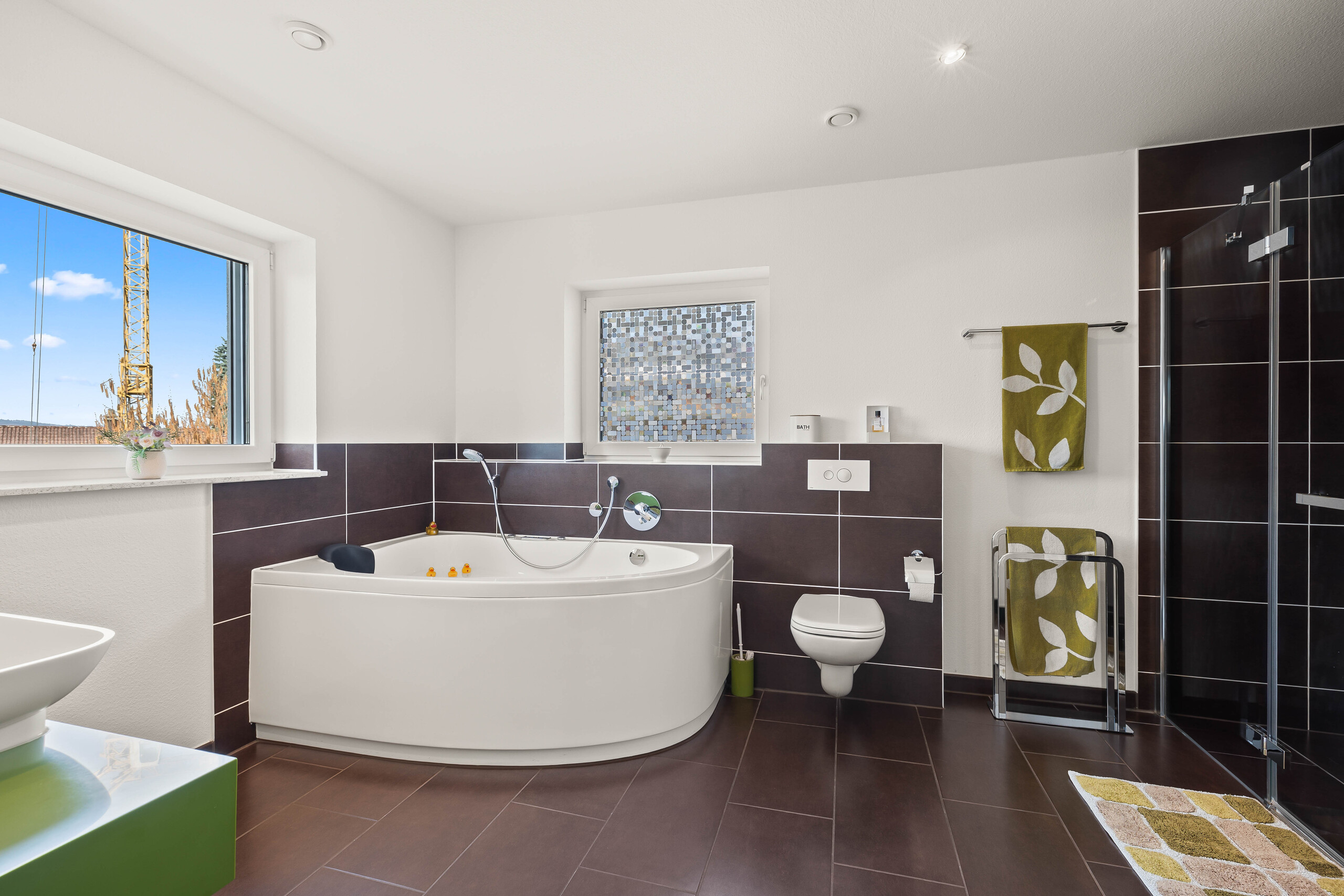 • Nassbereich: Moderner Nassbereich mit Bad/Dusche/WC (Badewanne mit Sprudelfunktion), separate Dusche/WC sowie zusätzliches Gäste- WC