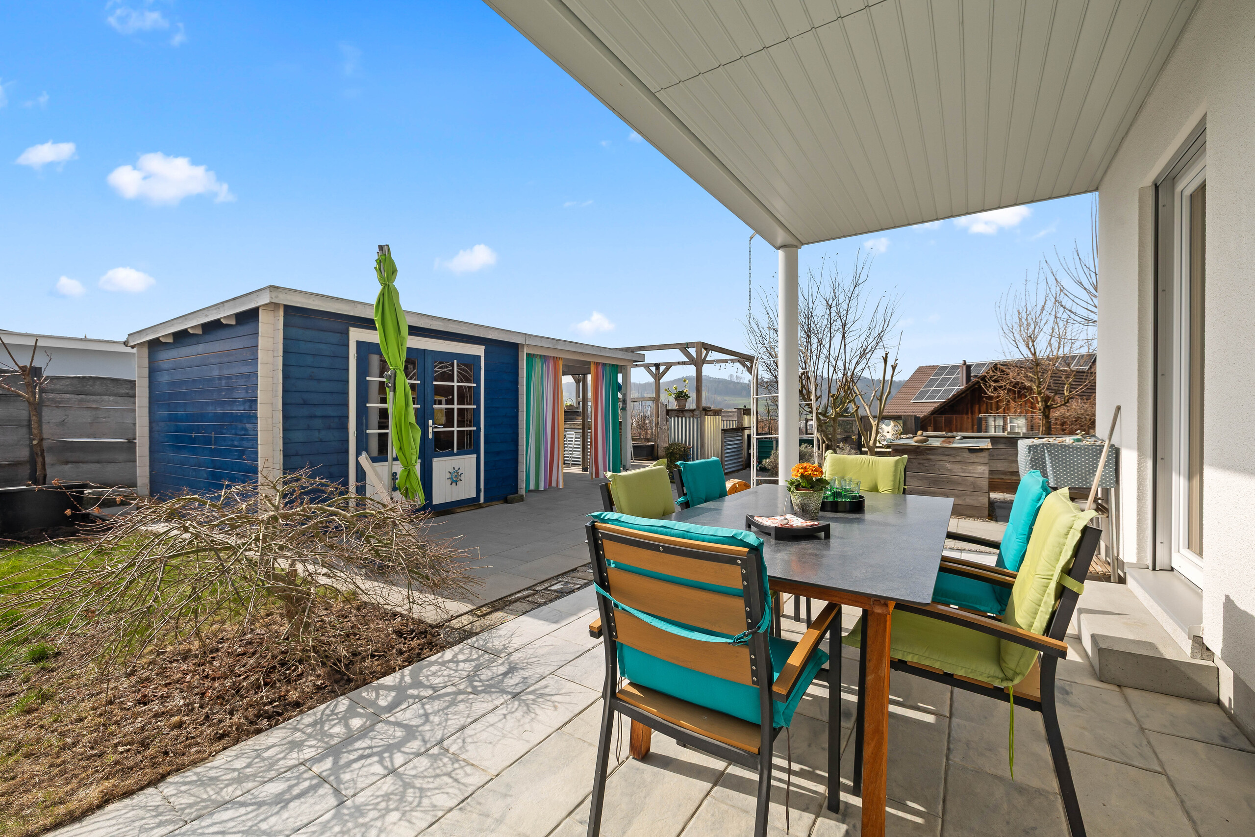 • Aussenbereich: Grossflächige Terrasse mit schöner Grünfläche und praktischer Schopf im Garten
