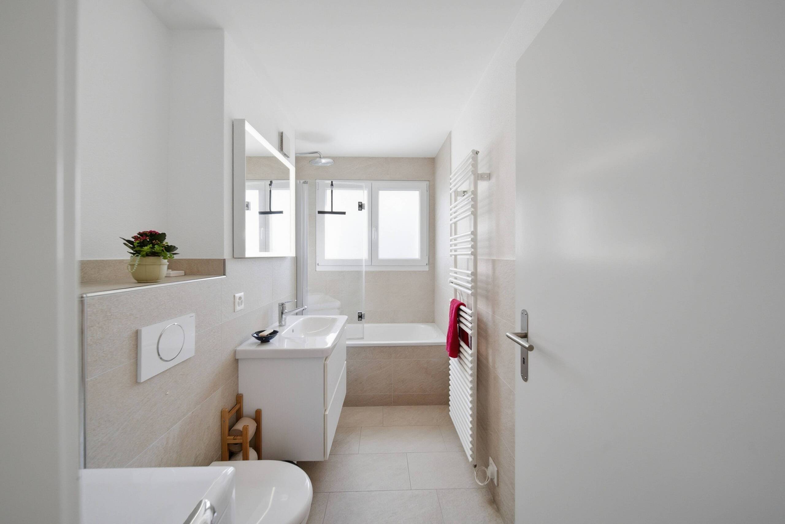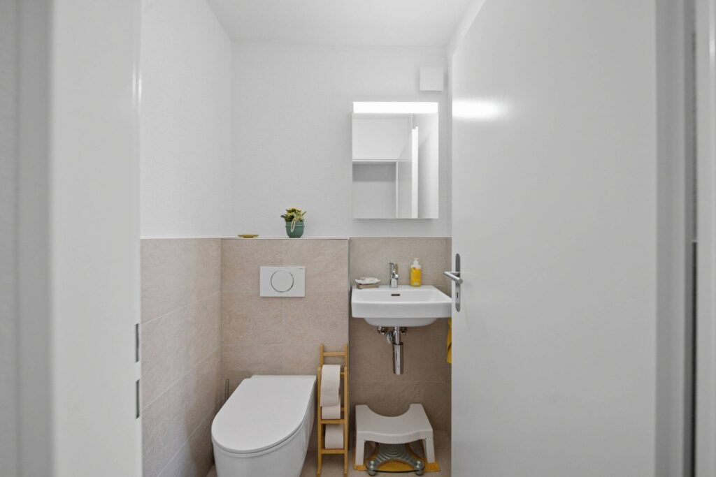 Die Wohnung befindet sich dank kontinuierlicher Investitionen der letzten zehn Jahre in einem guten Zustand. Der moderne, sandsteinfarbene Nassbereich mit Bad/WC wirkt zeitlos und gepflegt, ergänzt durch eine separate Gästetoilette. Eine praktische Garderobe im Eingangsbereich sowie ein Reduit sorgen für zusätzlichen Stauraum.