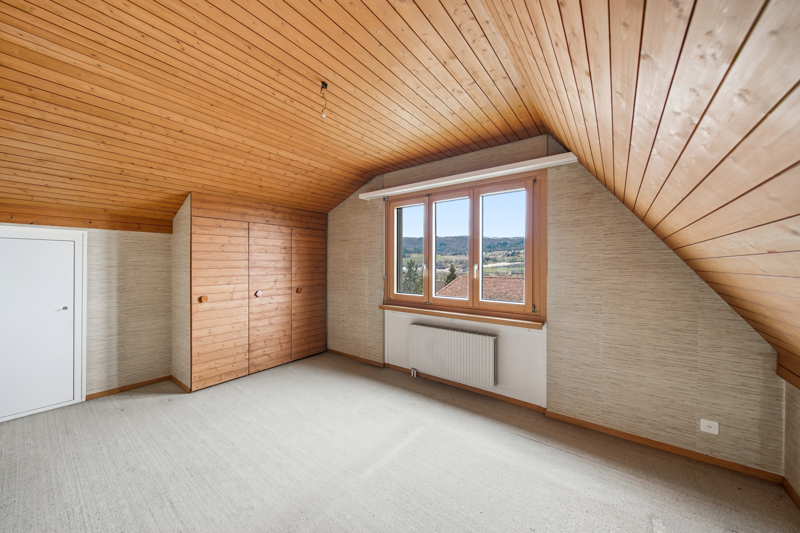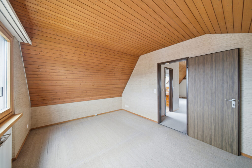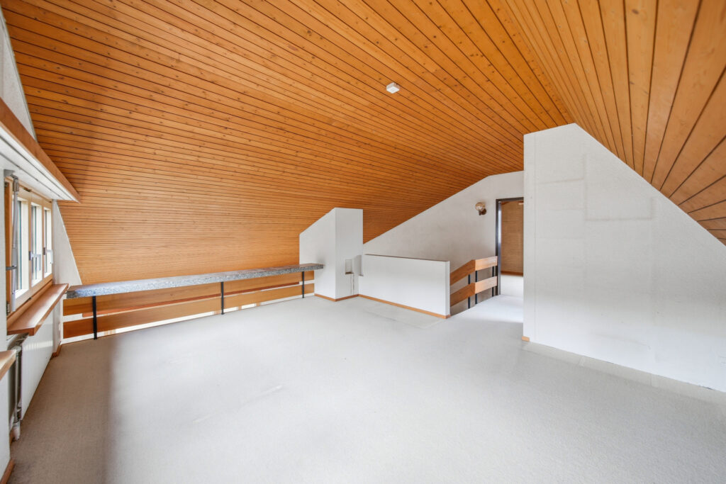 Das gemütliche Wohnzimmer mit Sitznische und Kamin lädt zu entspannten Stunden ein und bildet das Herzstück des Hauses. Ein besonderes Highlight ist die sehr grosszügige Galerie, die vielseitige Nutzungsmöglichkeiten eröffnet – beispielsweise als Arbeitsbereich, Bibliothek, Spielbereich oder zusätzliche Wohnzone.