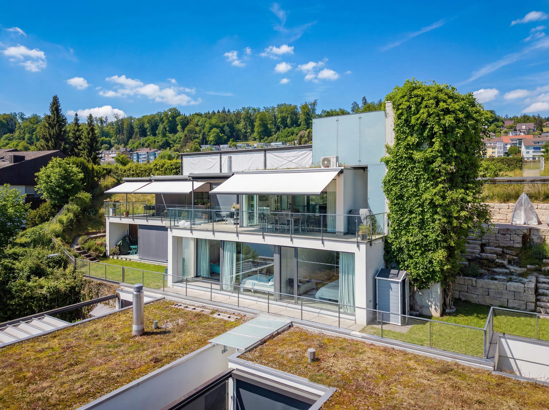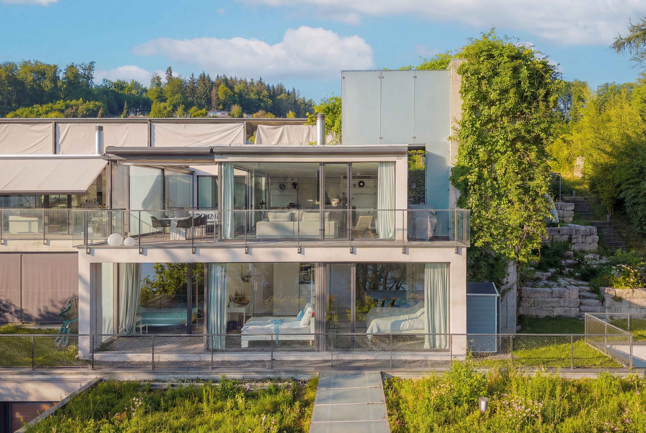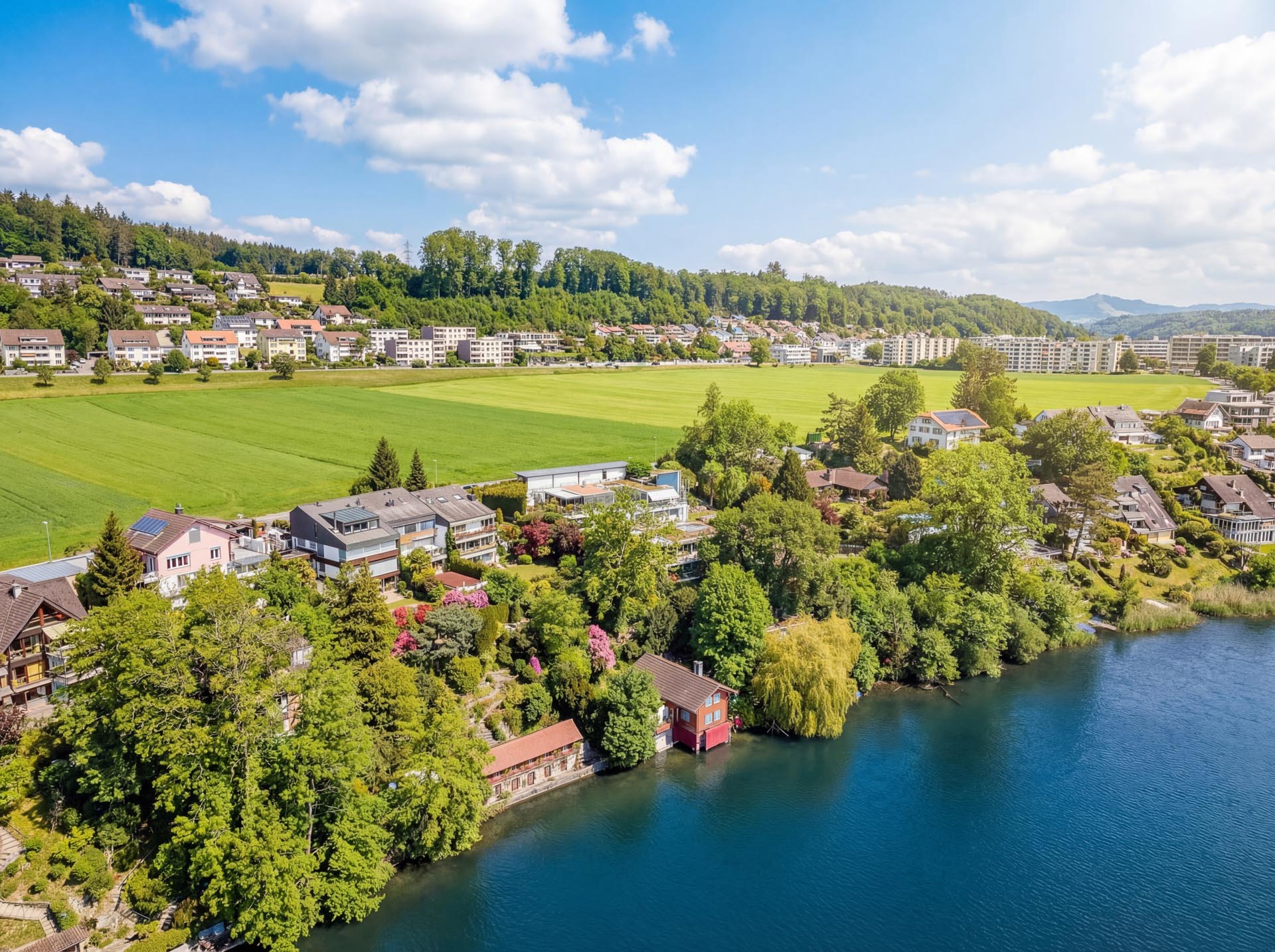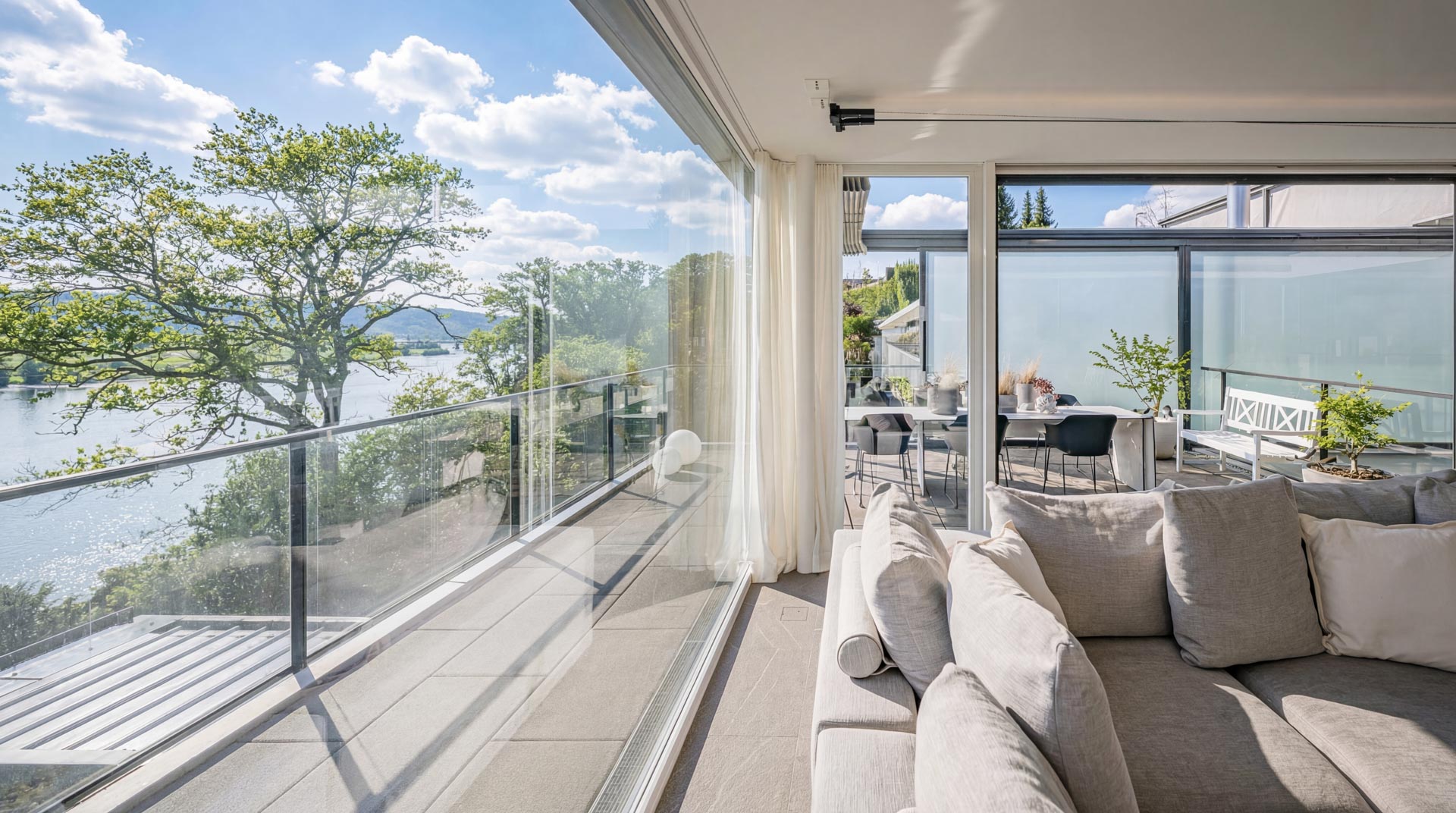 Ein besonderes Highlight ist der grosszügige Aussenbereich. Die weitläufige Terrasse mit raffinierter Beschattungsanlage lädt dazu ein, sonnige Stunden, gesellige Abende und den atemberaubenden Blick auf den See in vollen Zügen zu geniessen. Hier wohnen Sie in einer Umgebung, die Ruhe, Natur und Privatsphäre bietet, ohne auf die Nähe zu Einkaufsmöglichkeiten, Schulen und weiteren Infrastrukturen verzichten zu müssen.