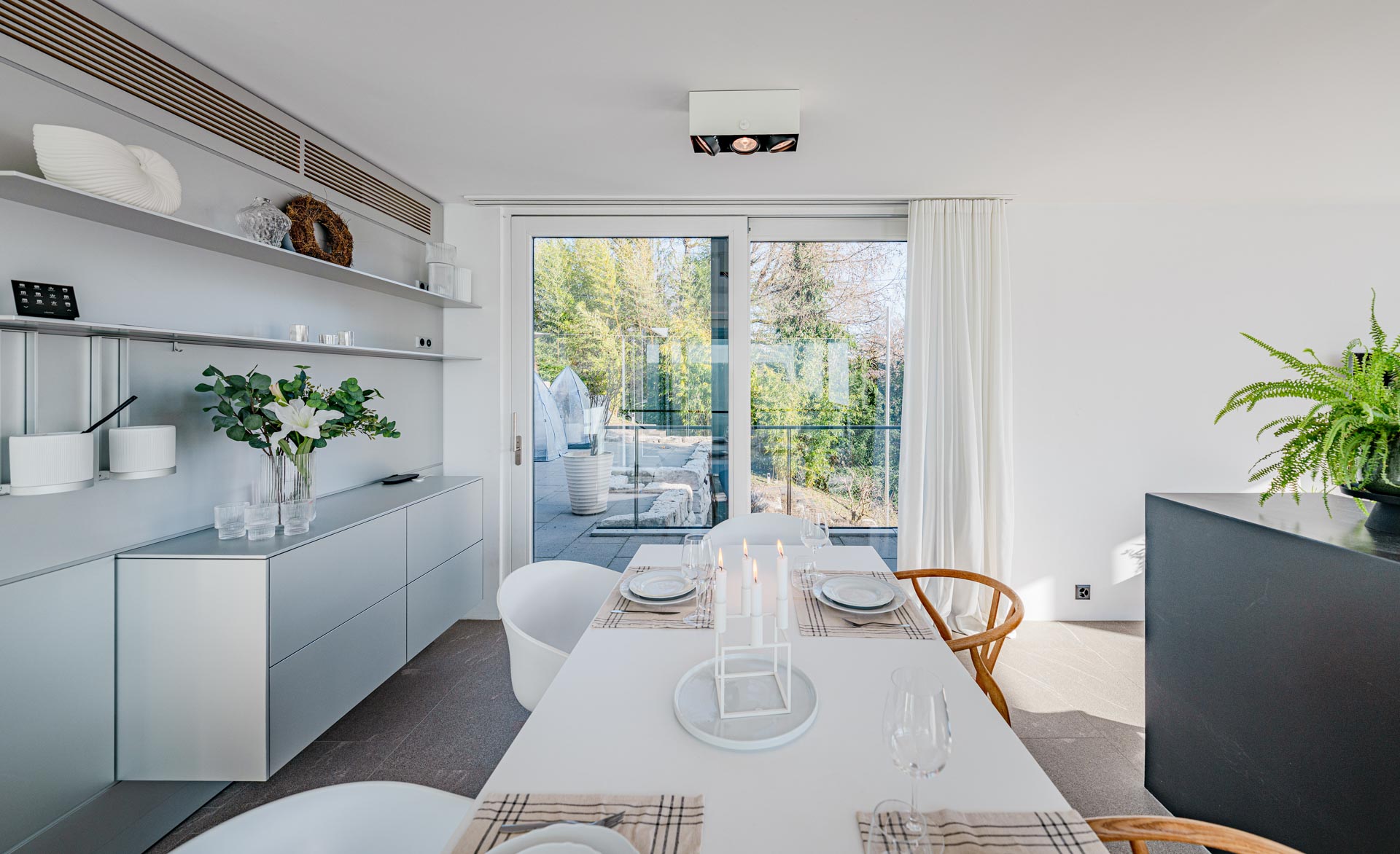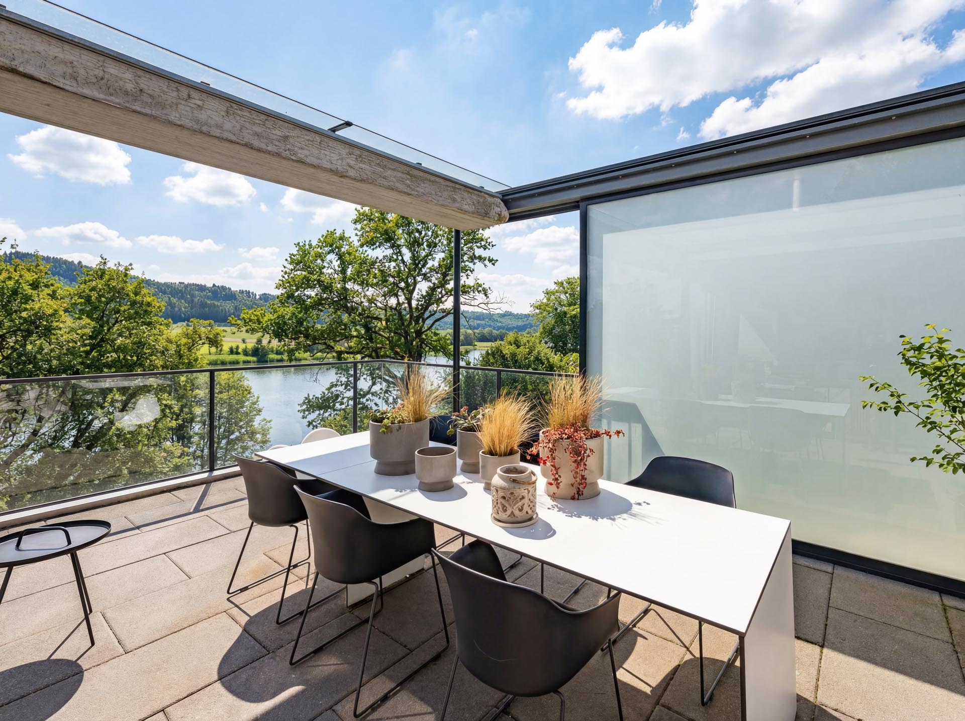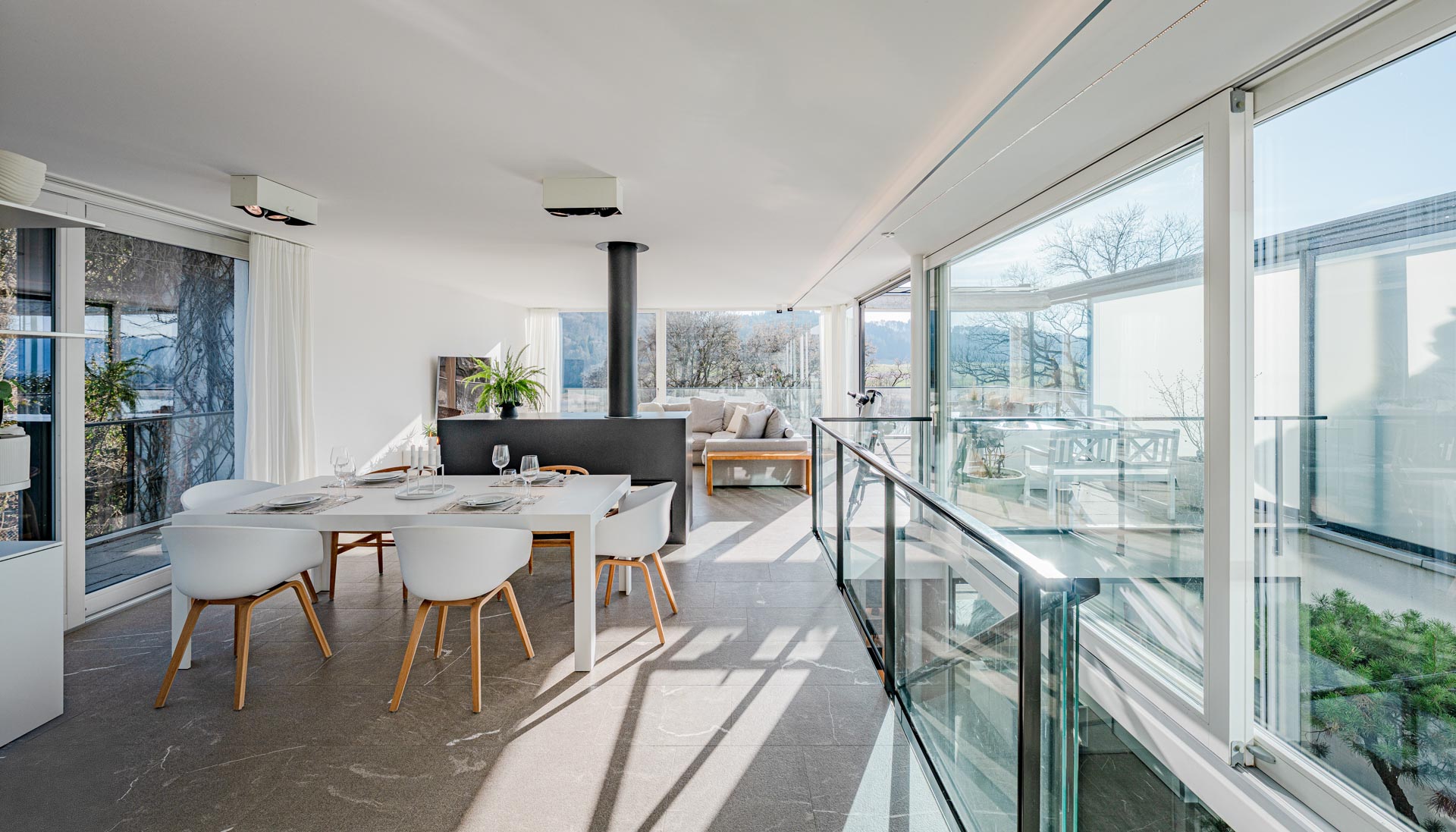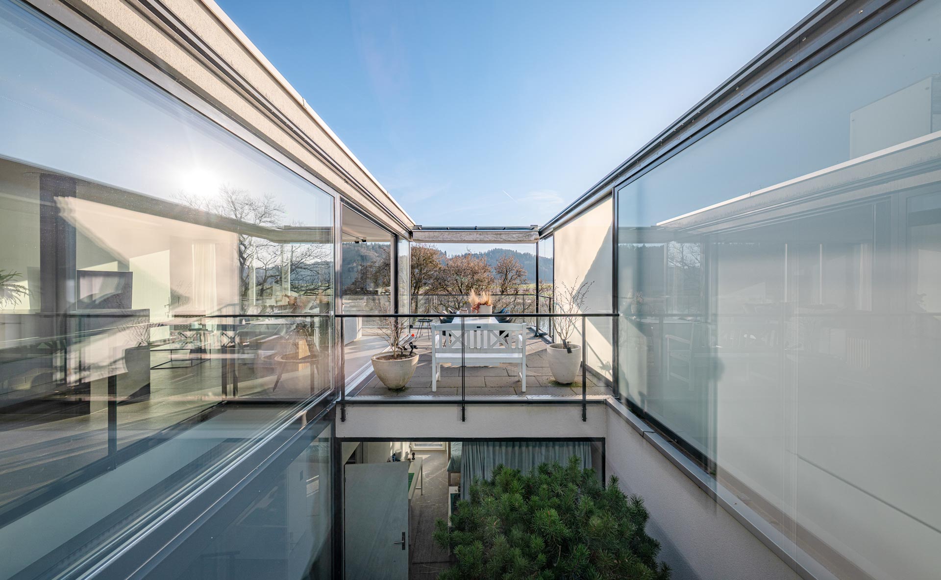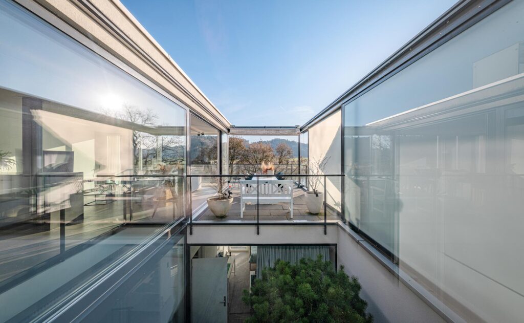 Terrasse: 61 m² grosse Aussichtsterrasse mit raffinierter Beschattungsanlage