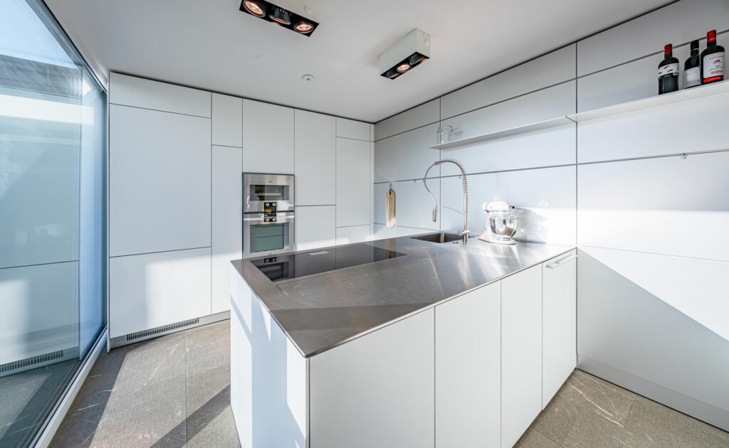 Auch die Küche lässt keine Wünsche offen: Die freistehende Designerküche von Bulthaup mit hochwertigen Geräten von Gaggenau verbindet Funktionalität mit zeitloser Ästhetik. Der hochwertige Innenausbau mit ausgewählten Materialien, darunter Naturstein aus Italien, eine Dampfdusche und ein Smart-Home-System, unterstreicht den exklusiven Charakter dieses Zuhauses.