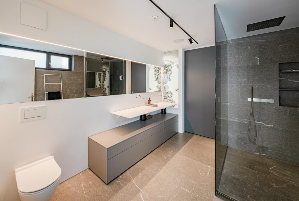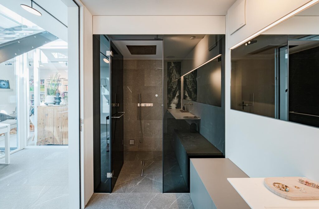 Hochwertiger Innenausbau: z. B. Naturstein aus Italien, Dampfdusche und Smart Home System