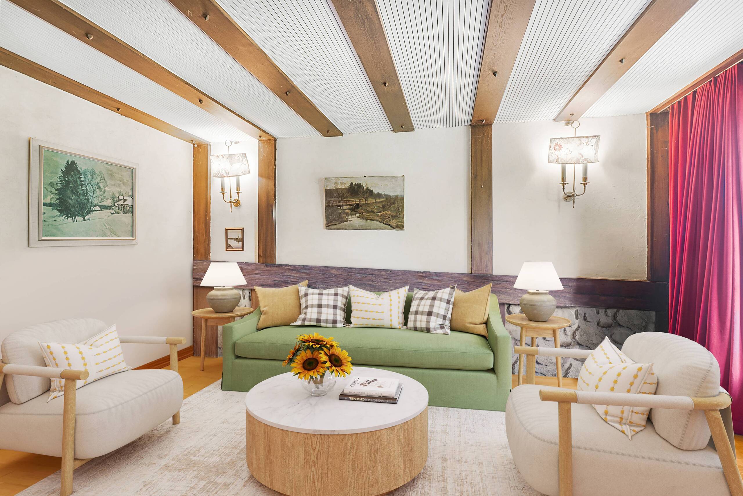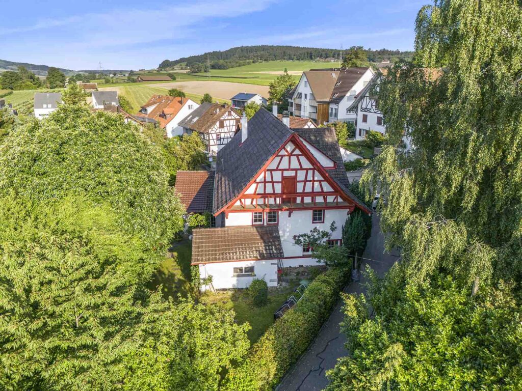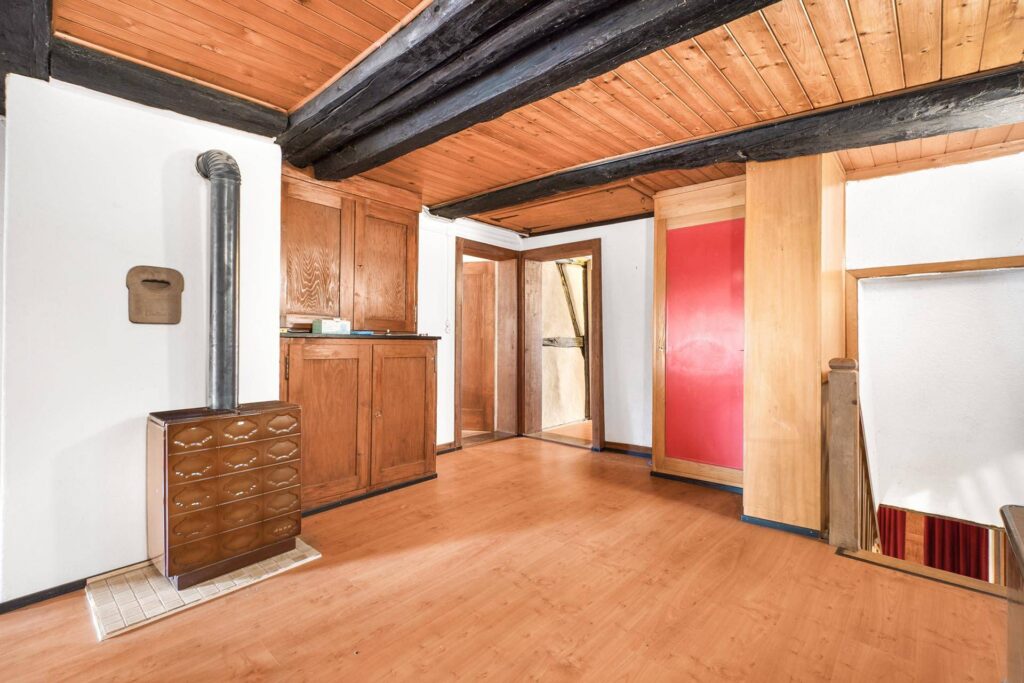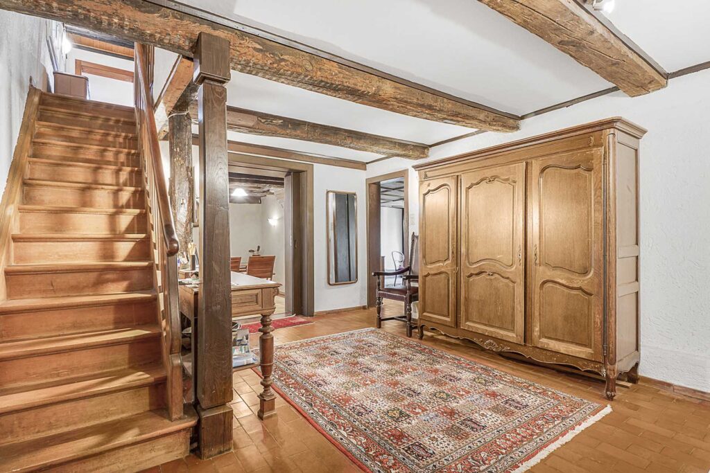 Die zeitlich getrennt entstandenen Baukörper (1780 und ca. 1950) bilden eine stimmige Gesamtstruktur, welche den besonderen Charme historischer Riegelbauweise mit sichtbaren Balken und individuell geprägten Räumen mit der Helligkeit und Funktionalität moderner, gut belichteter Wohnbereiche harmonisch verbindet.