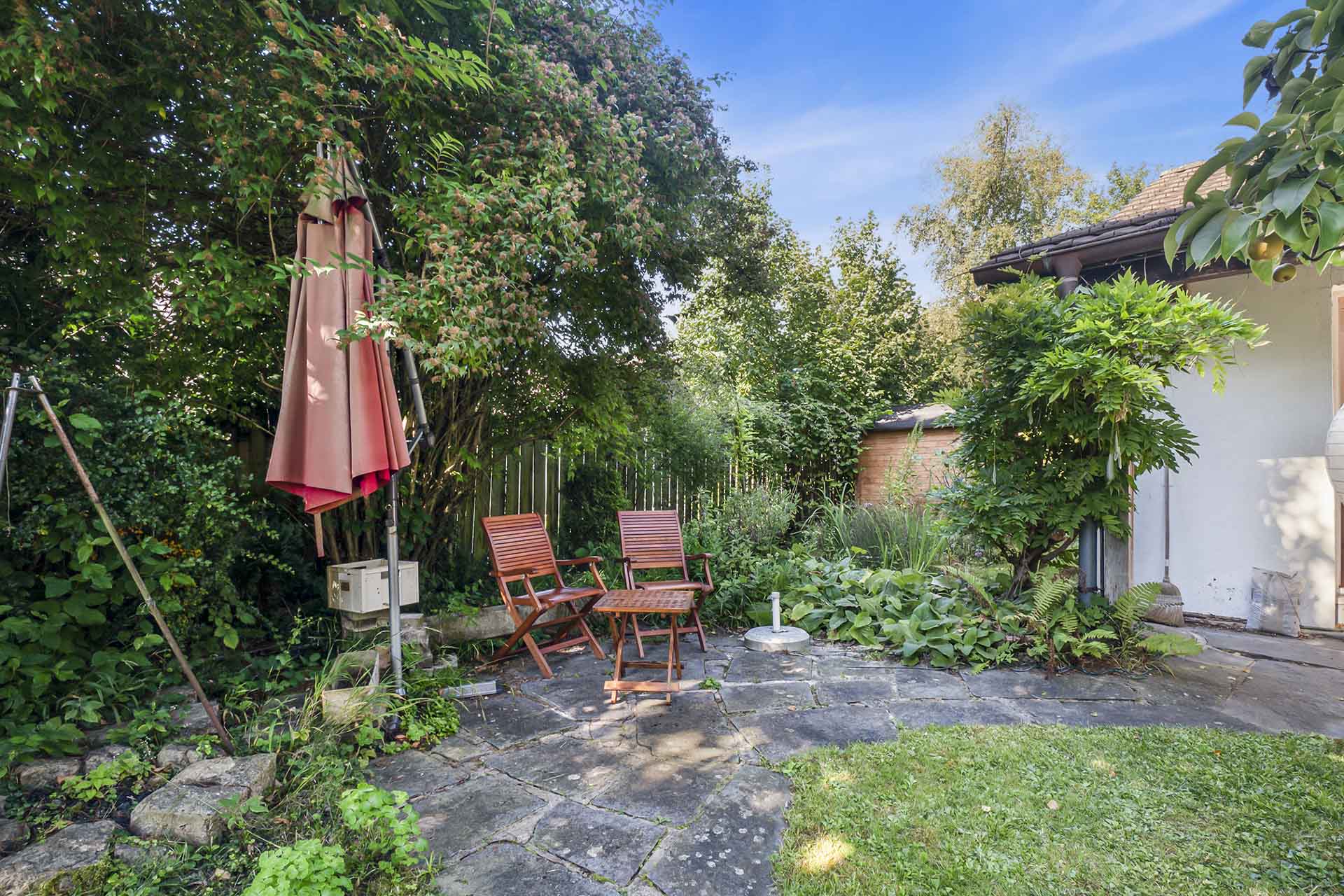 Garten: Privater, nicht einsehbarer und gepflegter Garten mit altem Baumbestand und zahlreichen Obstbäumen – ein Lebensraum, der zum Verweilen, Begegnen und gemeinsamen Erleben einlädt