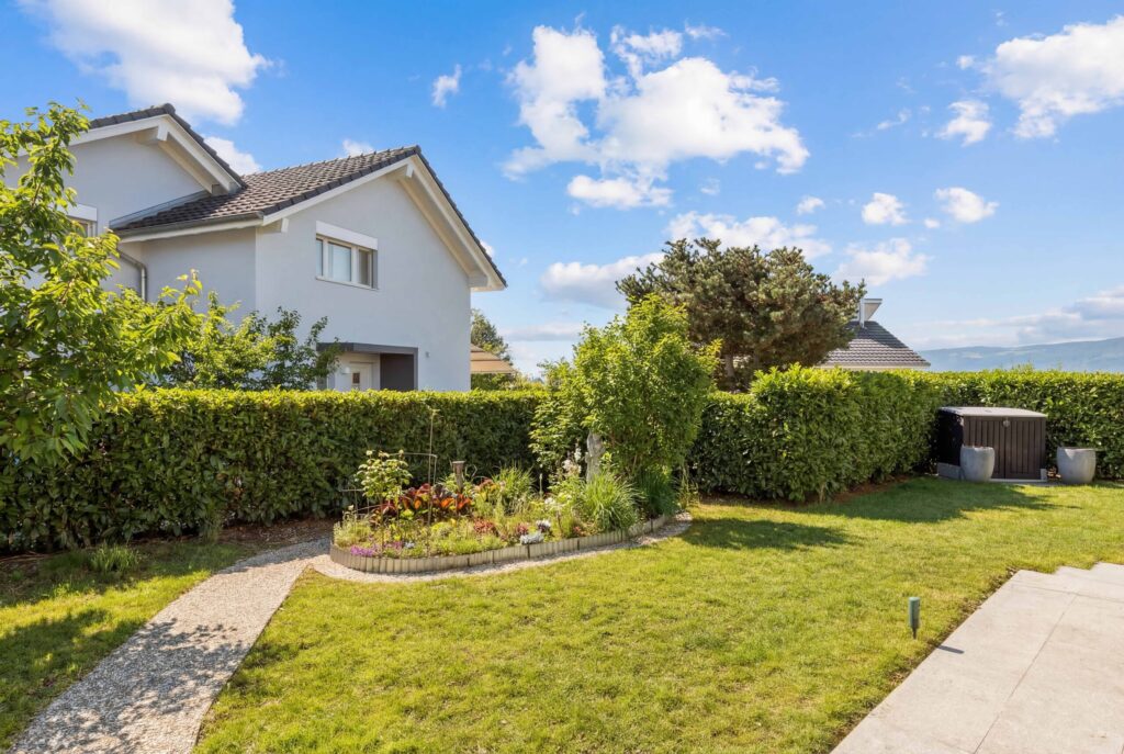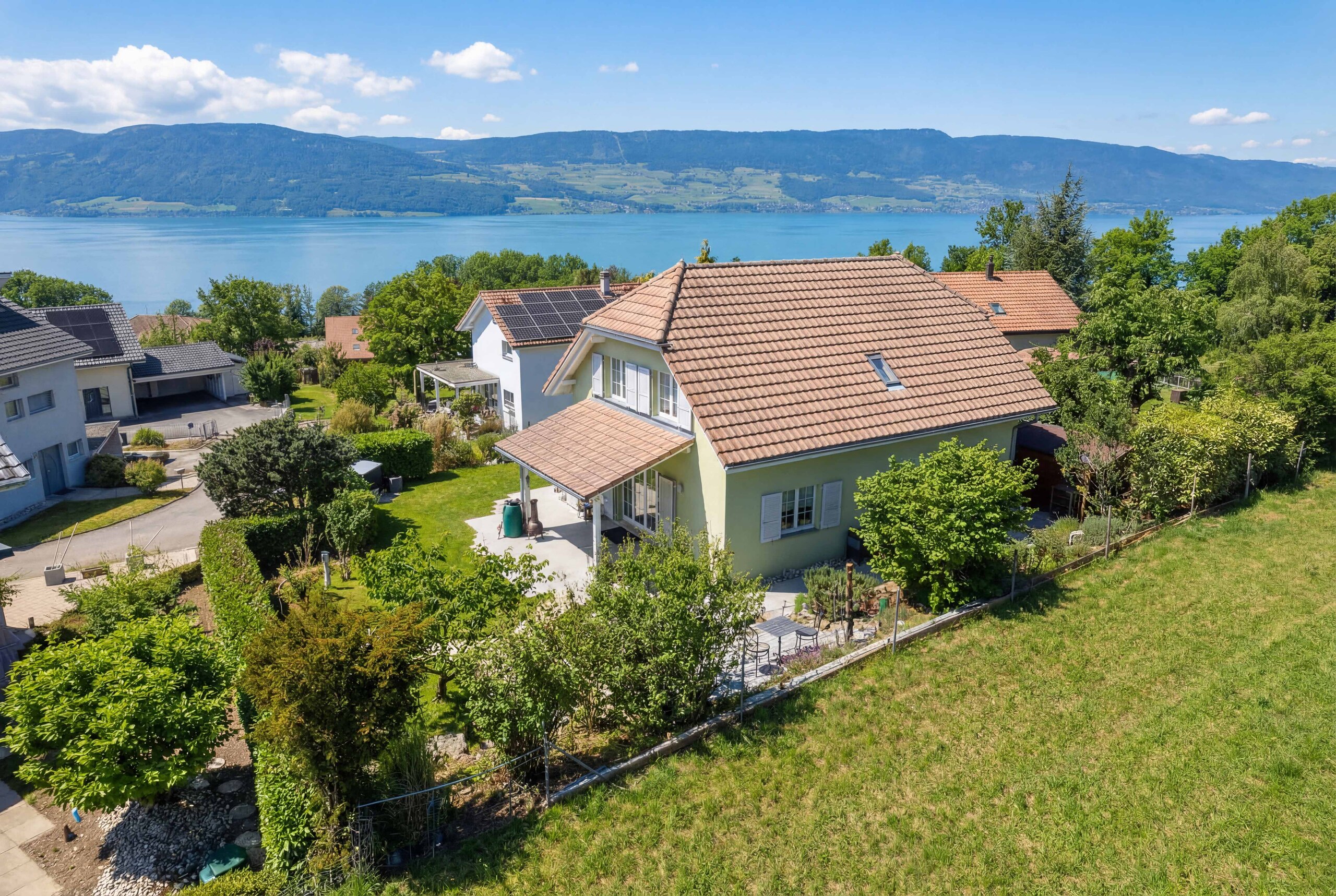 Der gedeckter Terrassenbereich mit herrlichem Blick auf den Neuenburgersee sorgt für entspannte Sommerstunden. Ein einzigartiges Gartenparadies mit gepflegter Anlage, Kräuter- und Blumenbeeten, geräumigem Gartenhaus sowie hauseigenem Obst von Säulenkirsche, Quittenbaum, Heidel- und Goji-Beeren.