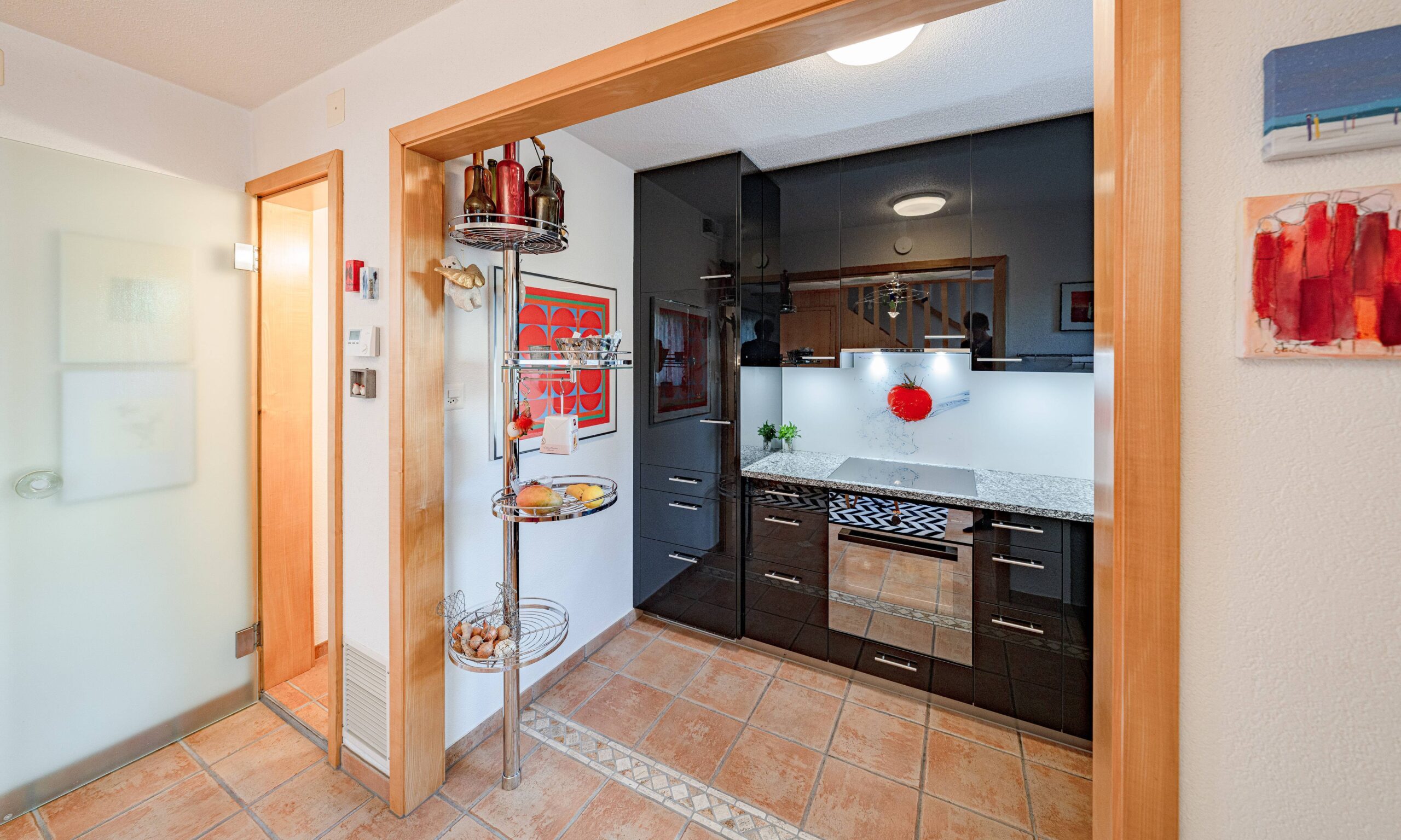 Die Küche zeigt sich modern und selbstbewusst in elegantem Schwarz. Sie ist gut ausgestattet und geht fliessend in den Essbereich über – ideal für gemeinsame Abende, spontane Gäste oder ruhigen Morgen mit Kaffee und Blick ins Grüne.