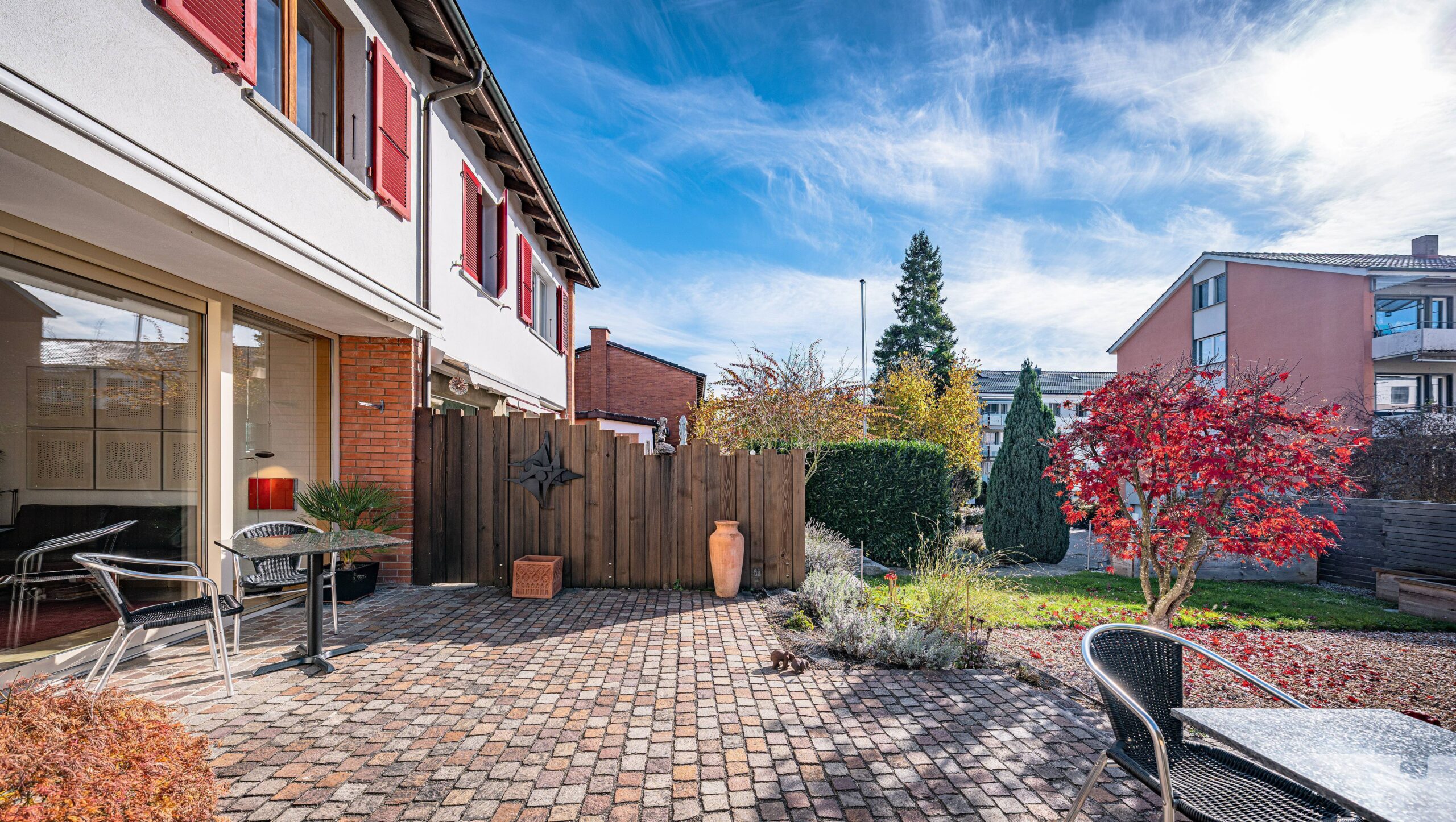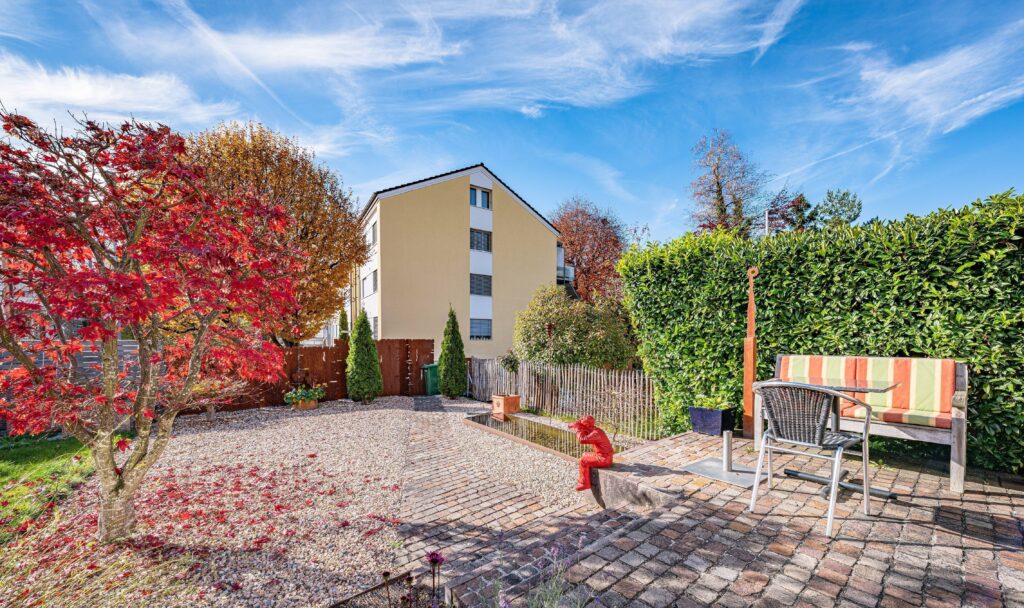 Der Aussenbereich ist ebenso liebevoll gestaltet. Der grosszügige Gartensitzplatz lädt zu langen Sommernächten, Gesprächen und entspannten Stunden ein. Die Bepflanzung wurde sorgfältig und stimmungsvoll gewählt.