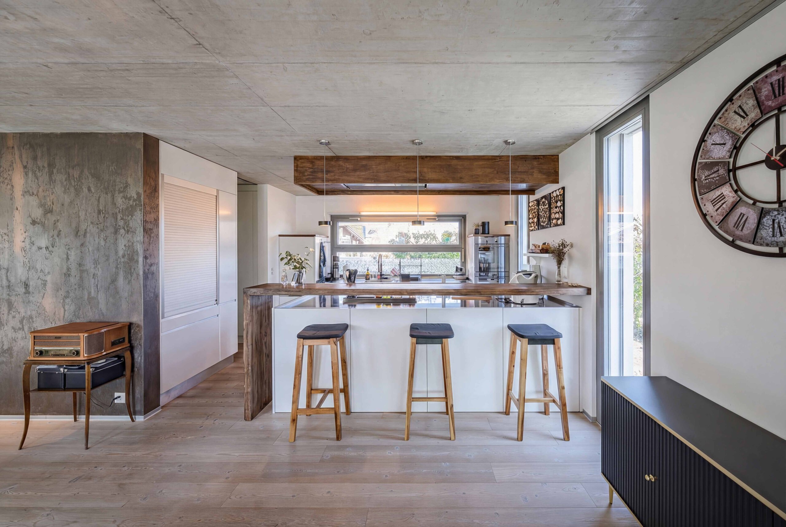 • Architektur: Moderne Architektur mit maximalem Lichteinfluss dank optimaler Südausrichtung und harmonischer Kombination zwischen Sichtbetondecken und Holzböden
