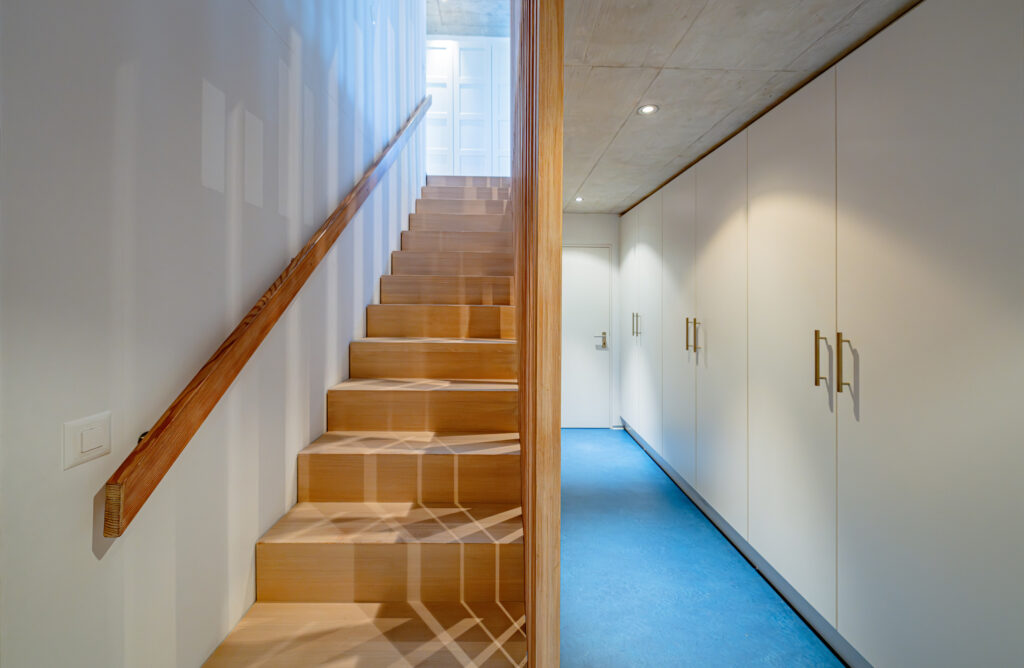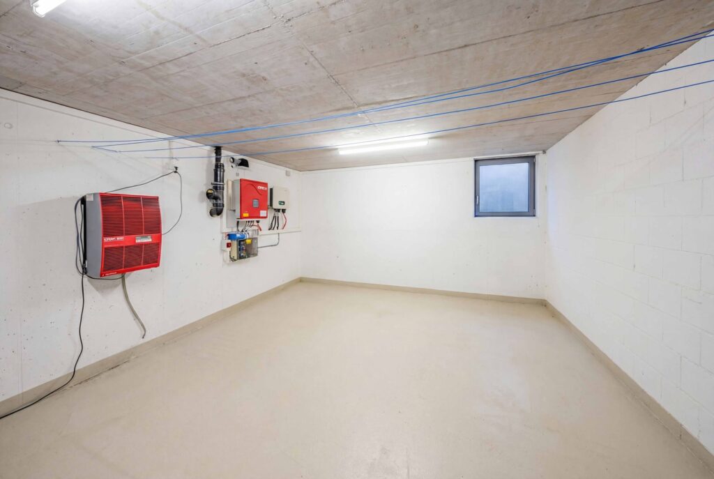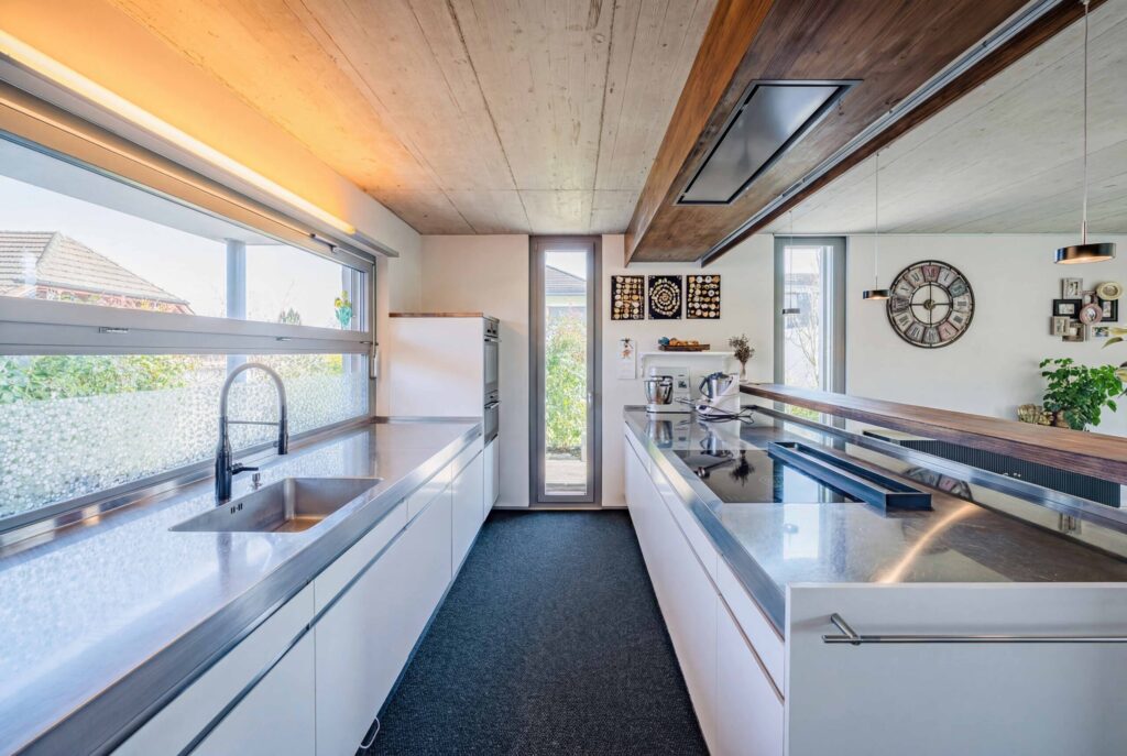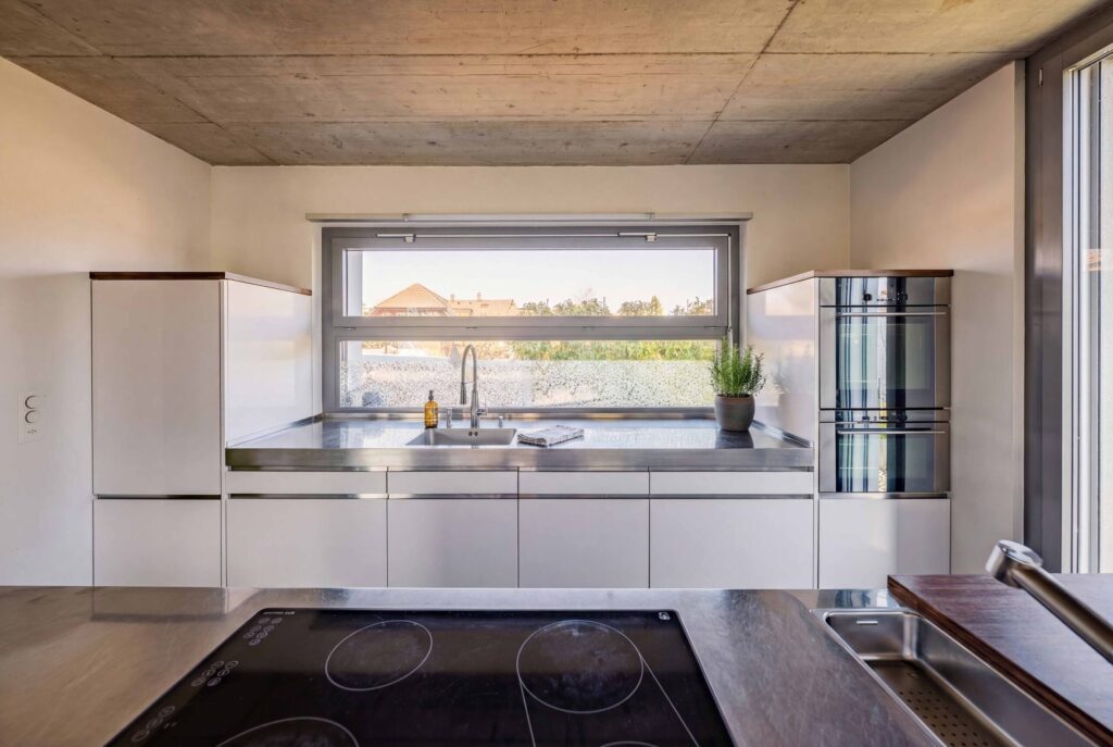 Im Zentrum des Hauses sorgt ein geschickt platzierter Schwedenofen für angenehme Wärme und unterstreicht das wohnliche Ambiente. Die hochwertige Schreinerküche überzeugt mit einer klaren Linienführung auf zwei Zeilen, einem praktischen Barelement sowie einer pflegeleichten Chromstahlabdeckung. Ein grosszügiges Reduit bietet zusätzlichen Stauraum und erhöht den Alltagskomfort.