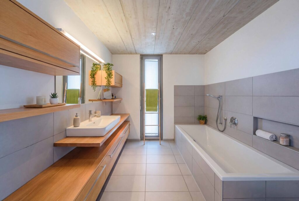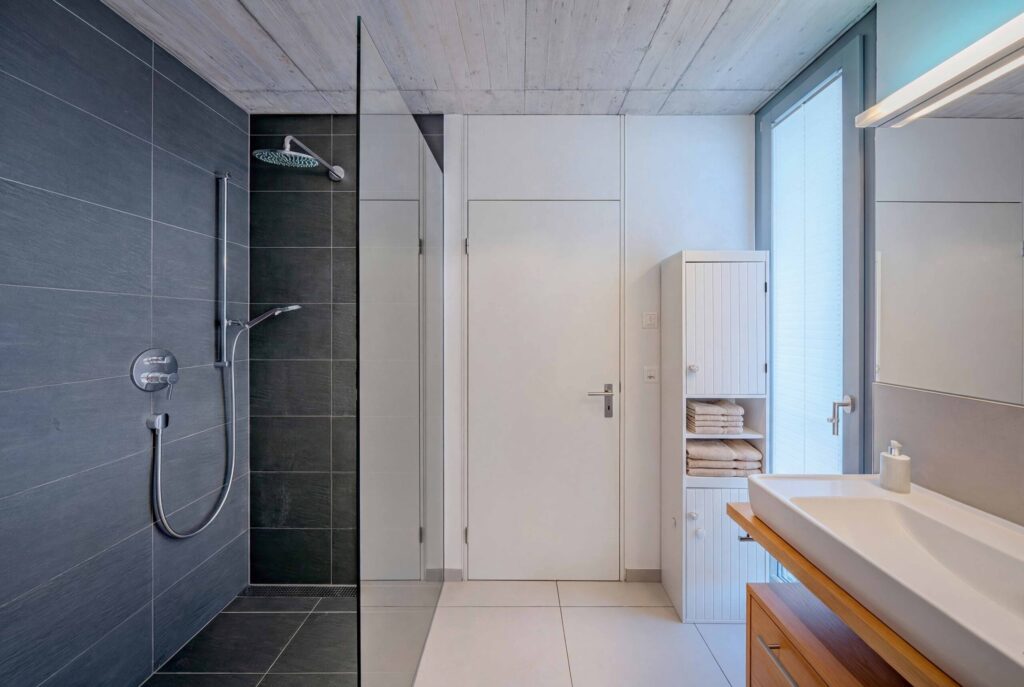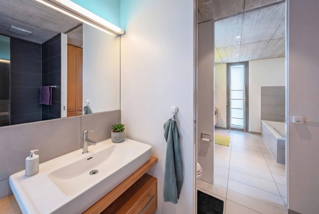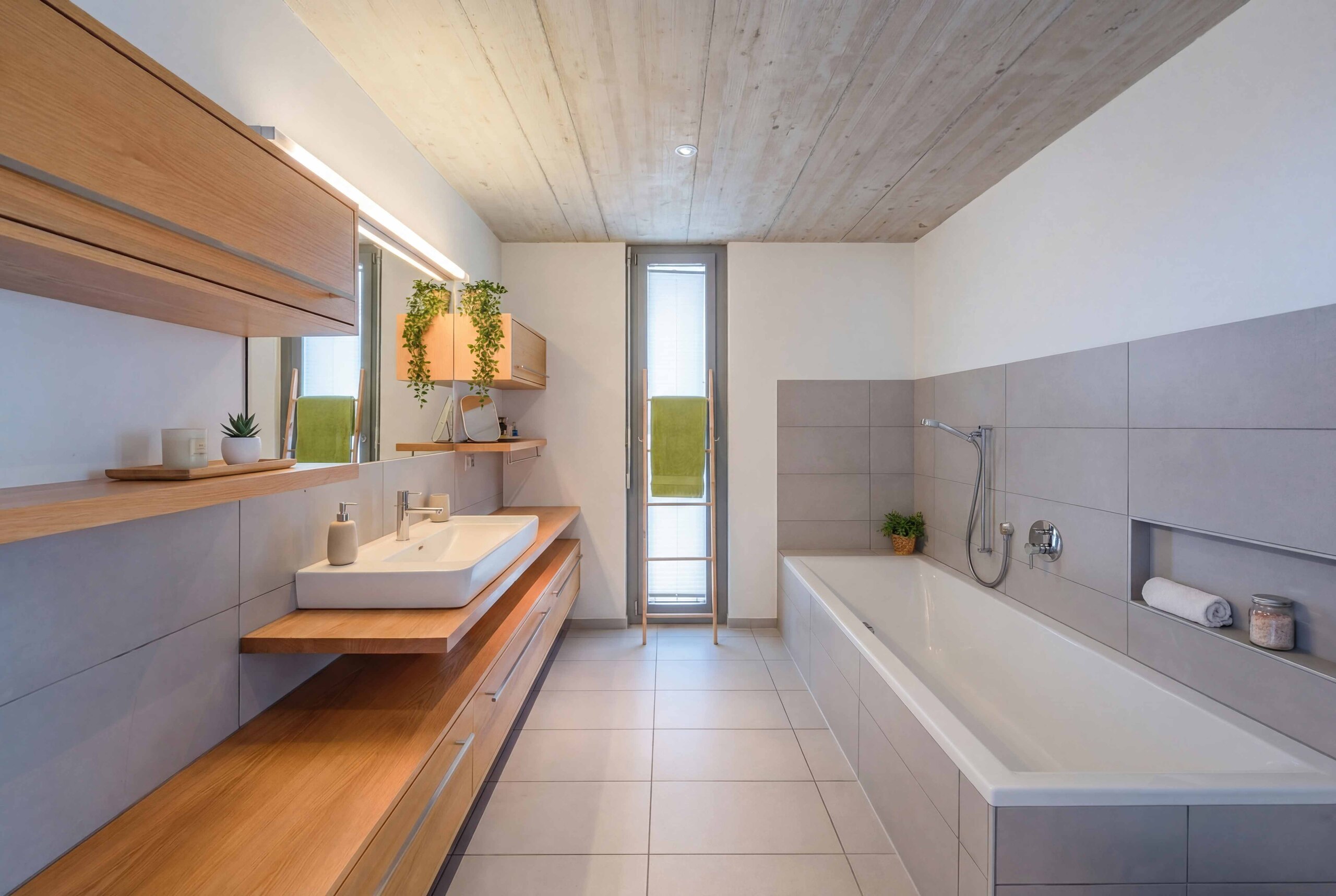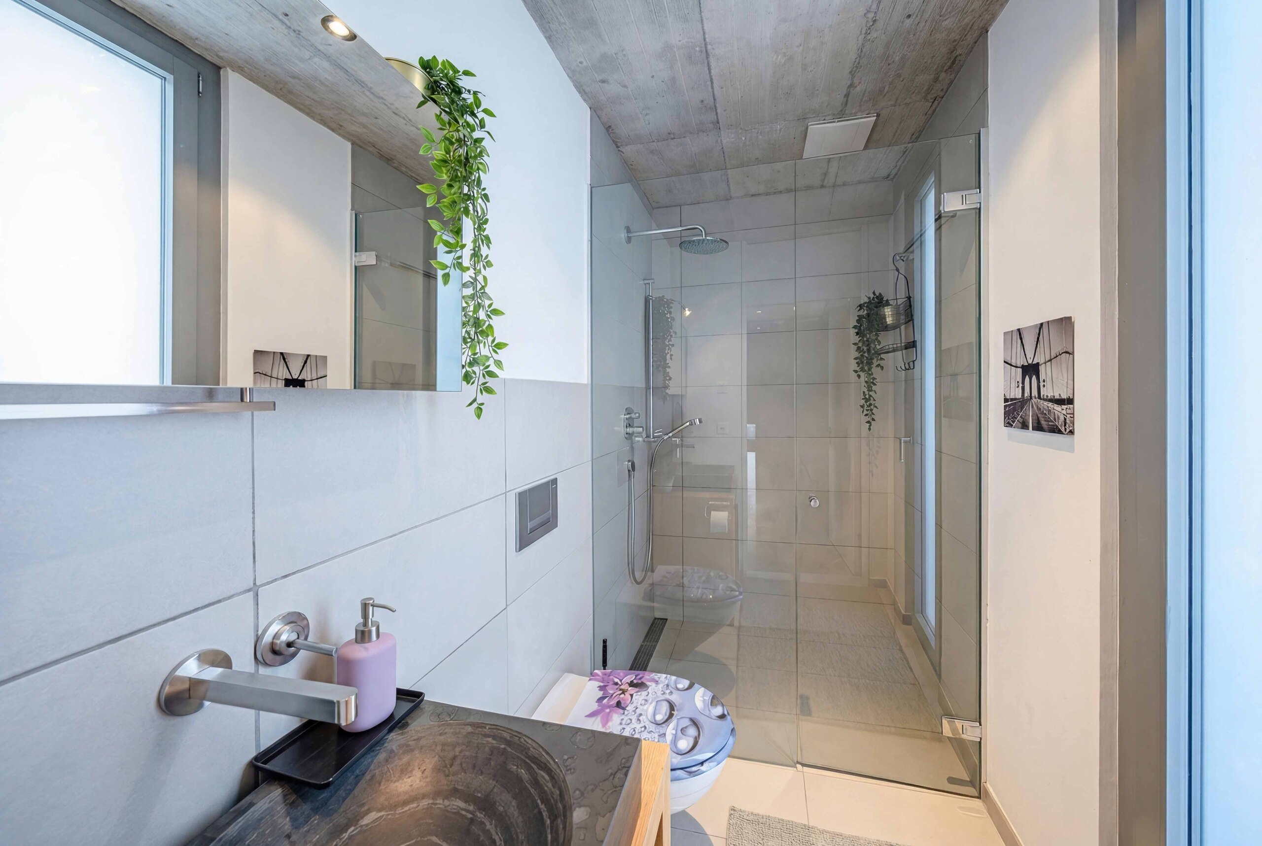 Mit insgesamt drei Nassbereichen ist das Haus ideal auf die Bedürfnisse von Familien abgestimmt. Im Obergeschoss befindet sich ein besonders grosszügiges Familienbad mit Badewanne, Dusche und WC, ergänzt durch ein weiteres Badezimmer im Erdgeschoss sowie ein separates Bad.