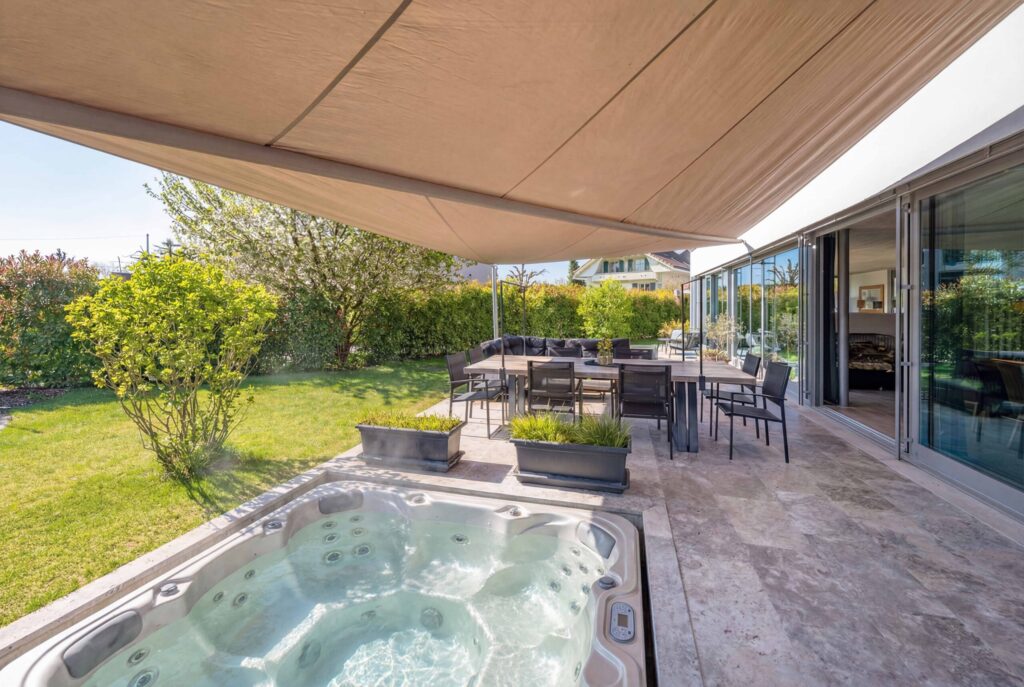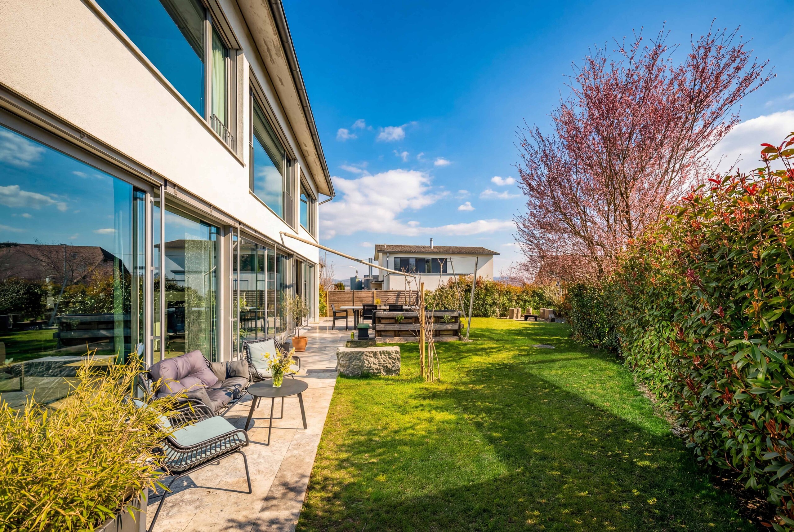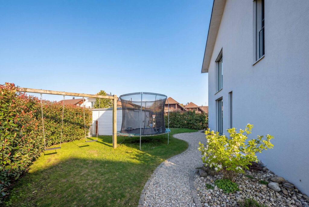 Der Aussenbereich präsentiert sich grosszügig und dennoch pflegeleicht. Ein einladender Gartensitzplatz, eine Grillstelle, eine Rasenfläche sowie ein praktisches Gartenhaus bieten vielseitige Nutzungsmöglichkeiten für entspannte Stunden im Freien – inklusive Whirlpool für besondere Momente der Erholung.