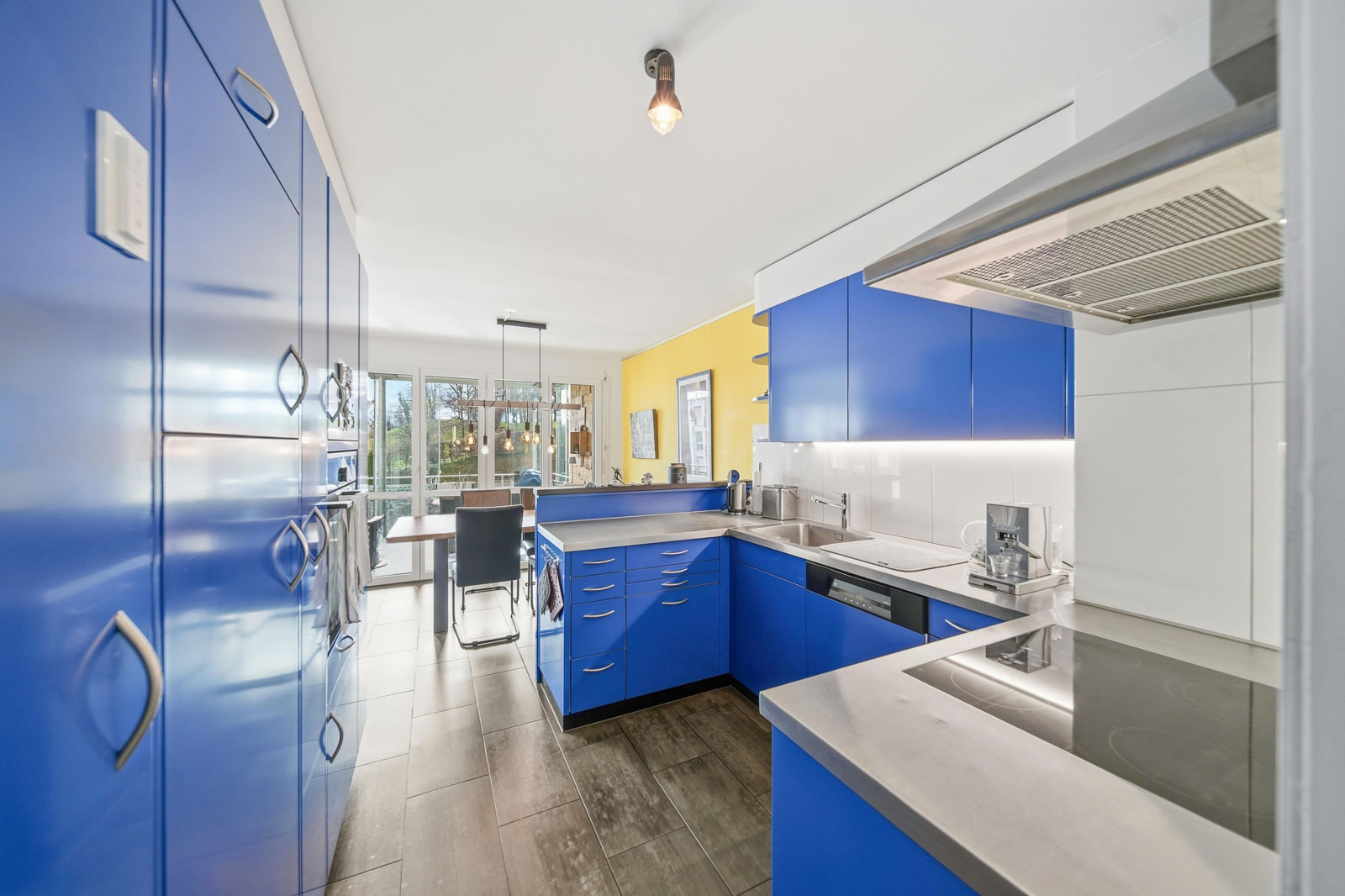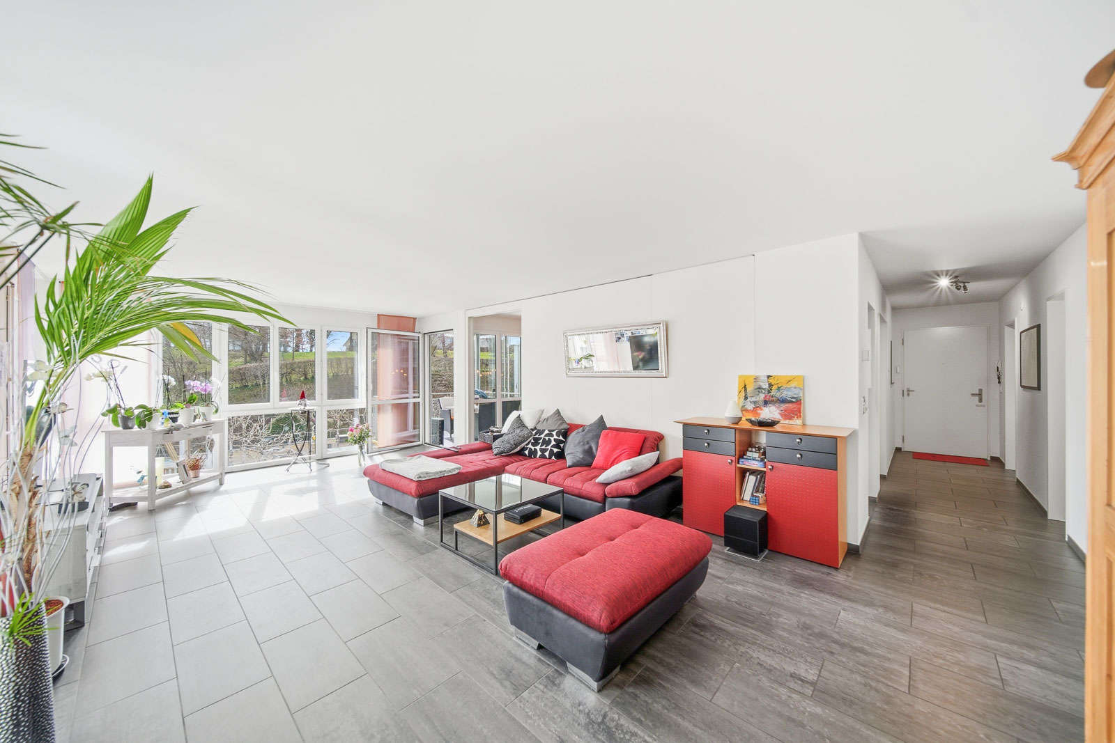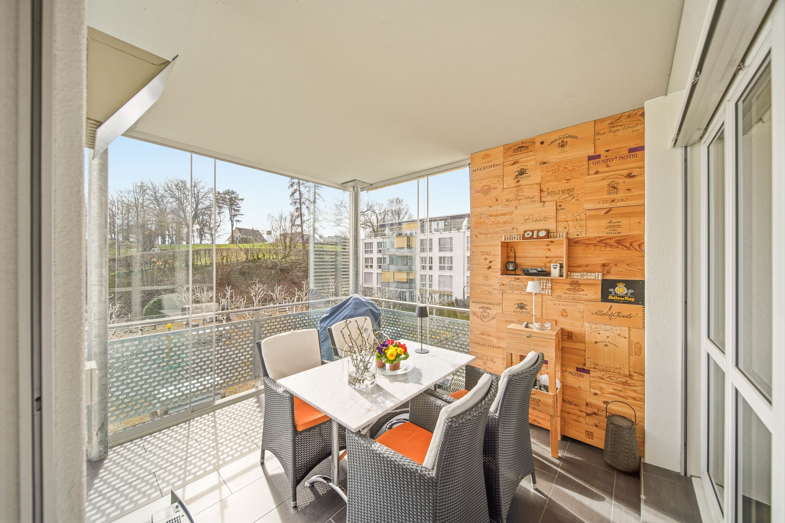 Der helle Wohn- und Essbereich bietet direkten Zugang zum Balkon sowie zum einladenden Wintergarten, der mit seinem Blick ins Grüne eine angenehme Erweiterung des Wohnraums schafft. Hier geniessen Sie zu jeder Jahreszeit eine hohe Aufenthaltsqualität.