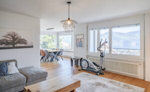 Gepflegte 5.5-Zimmer-Wohnung in Hergiswil (Nidwalden) mit 113 m² Wohnfläche, hellem Wohn-/Essbereich mit Cheminée und gedecktem Balkon mit See- und Bergblick auf den Vierwaldstättersee und die Nidwaldner Alpen. Nassbereich mit Waschturm, separate Toilette, Keller, Waschküche und Veloraum. Einzelgarage optional. Sehr gute ÖV-Anbindung – Luzern in wenigen Minuten erreichbar.