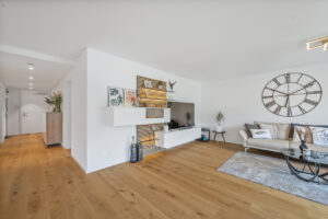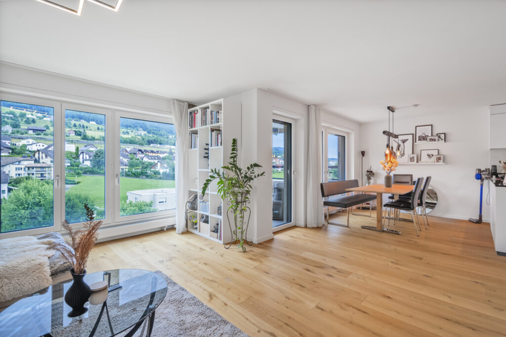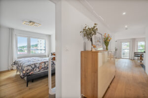 86 m² Wohnfläche, moderner Ausbau, Balkon mit seitlichem Seeblick, V-Zug Küche, zwei frisch renovierte Nasszellen, edles Eichenparkett. Parkplätze mit E-Ladestationen mietbar.