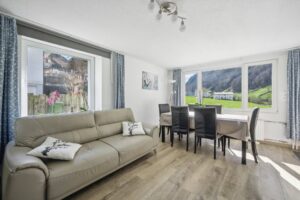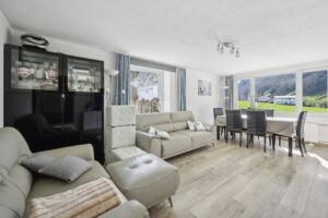 82 m² Wohnfläche, heller Wohn- und Essbereich, geschlossene Küche, moderner Nassbereich, lichterfüllte Räume. Gedeckter Balkon mit Bergpanorama. Keller, Estrich, Velo- und Skiabstellplatz. Vermietet – ideal als Anlageobjekt. Aussenabstellplatz inklusive.