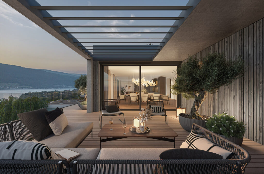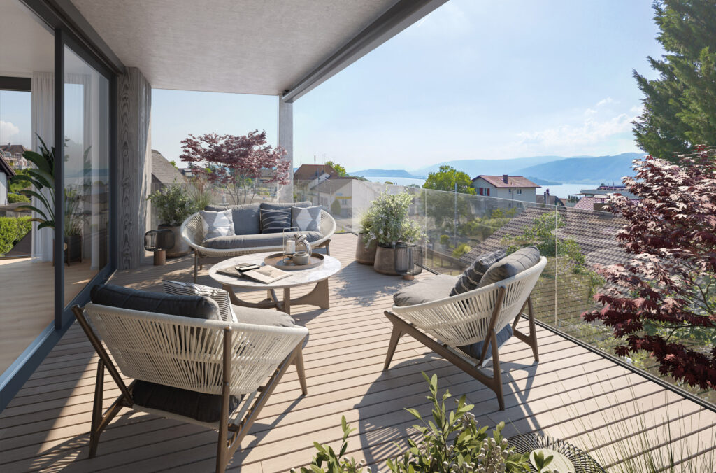 The 19 m² large terrace extends the living space into the outdoors and invites you to enjoy the view of the lake and mountains . Thanks to a generous budget for the interior you can design the furnishings individually according to your wishes - from materials to design accents.